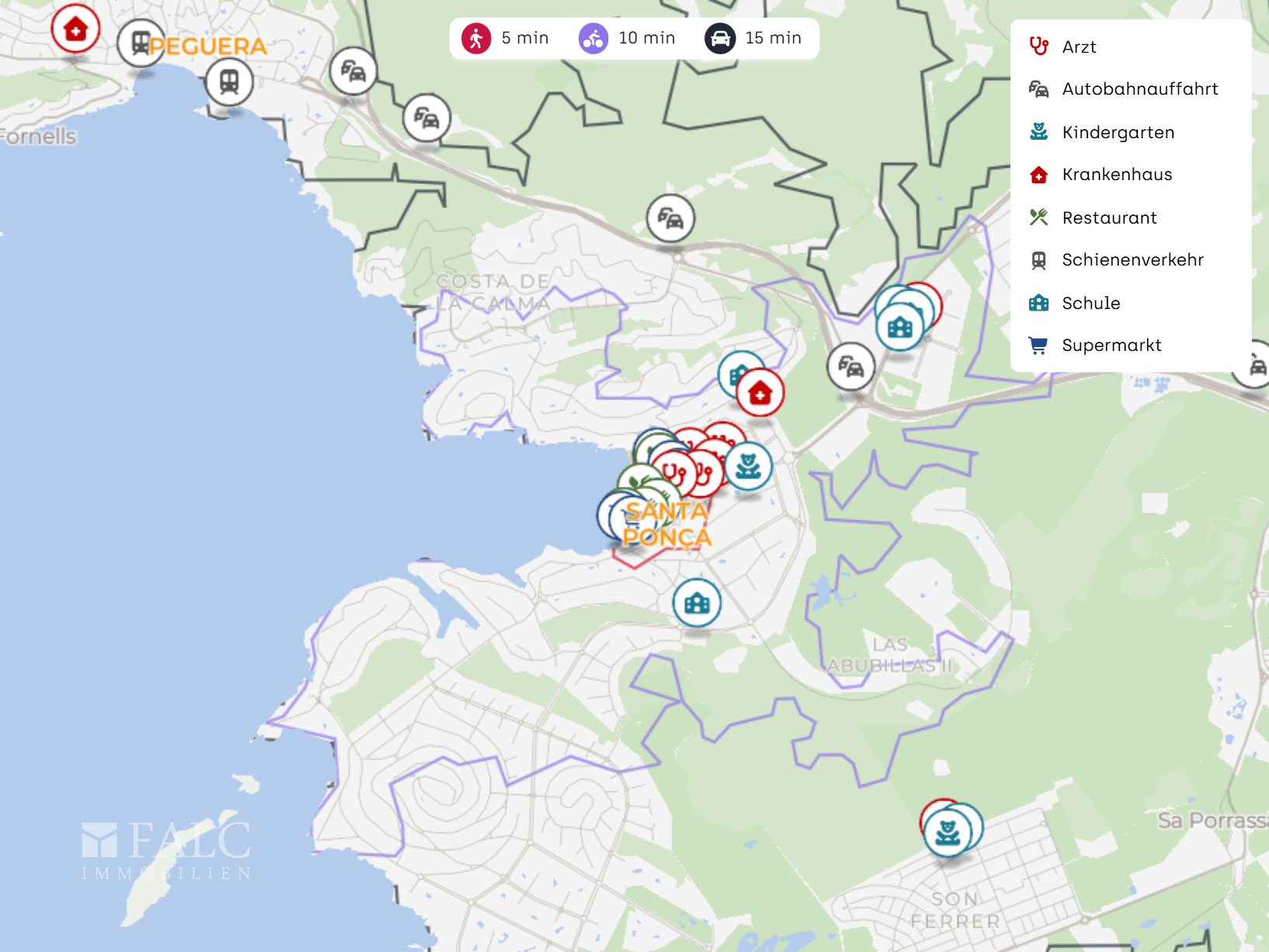 Für Freizeit und Bewegung bietet die Umgebung attraktive Möglichkeiten: Der Golfplatz Golf Santa Ponça I ist in wenigen Minuten mit dem Auto erreichbar, und mit dem Poliesportiu de Santa Ponça steht eine Sportanlage in der Nähe zur Verfügung. Grünflächen und ein Park in der Umgebung runden die Lage ab und schaffen zusätzliche Aufenthaltsqualität im Freien.