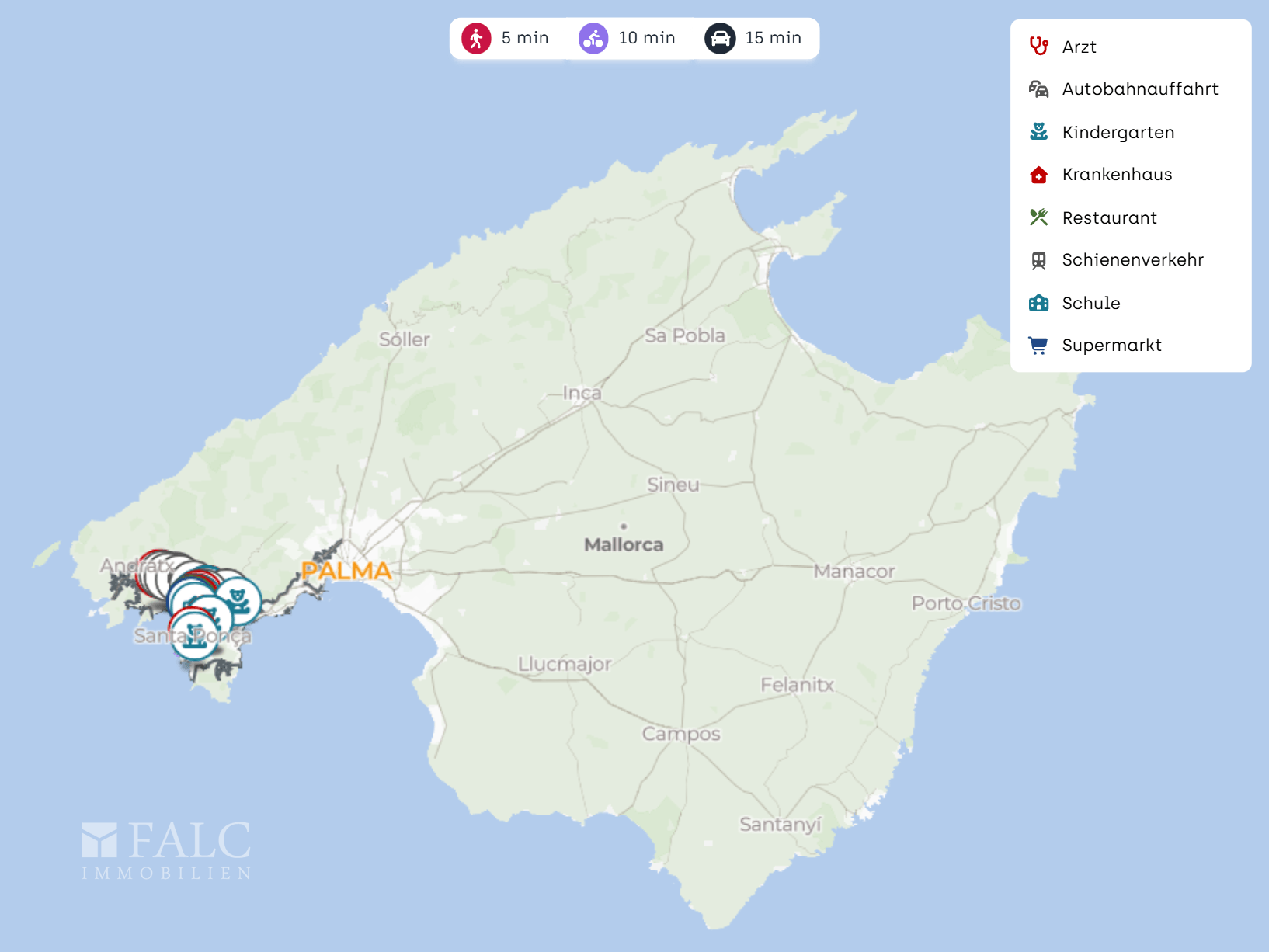 Die Anbindung ist ebenfalls überzeugend. Eine Bushaltestelle wie Platja (Santa Ponça) liegt in der Nähe und verbindet Sie flexibel innerhalb des Ortes und Richtung Palma. Mit dem Auto erreichen Sie eine Autobahnauffahrt in wenigen Minuten, was Ausflüge über die Insel besonders komfortabel macht. Der Flughafen Palma de Mallorca ist je nach Verkehr in etwa 30 bis 40 Minuten mit dem Auto erreichbar.