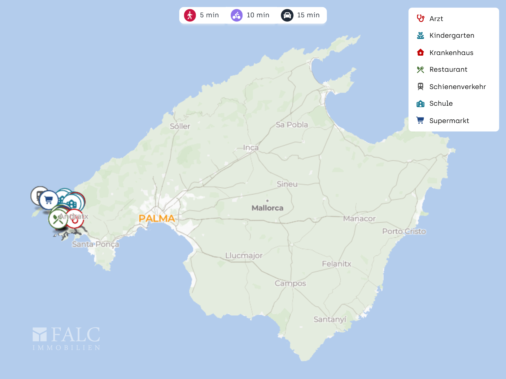 Eine Bushaltestelle wie Club de Vela oder Llotja ist in etwa ca 1 bis 2 km erreichbar und sorgt für eine praktische Anbindung im Ort und Richtung Palma. Mit dem Auto gelangen Sie zügig auf die Ma 1 in Richtung Palma. Der Flughafen Palma de Mallorca ist je nach Verkehr in etwa ca 35 bis 45 Minuten erreichbar.
