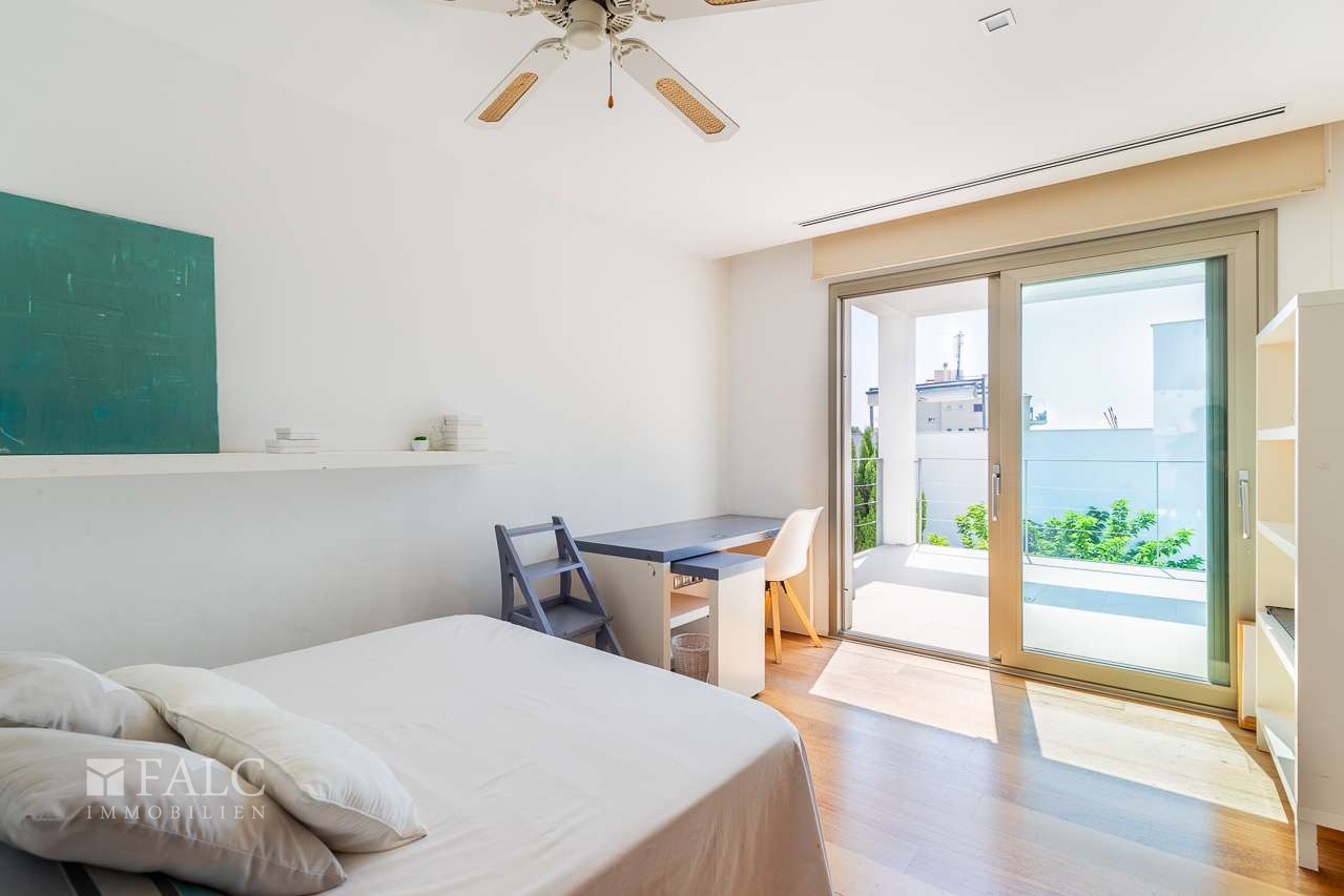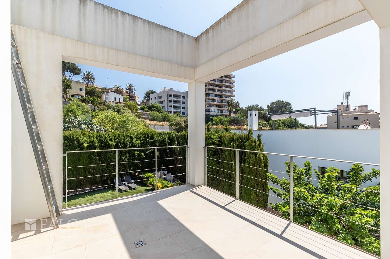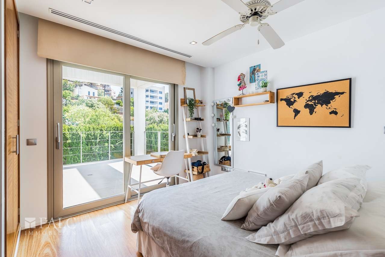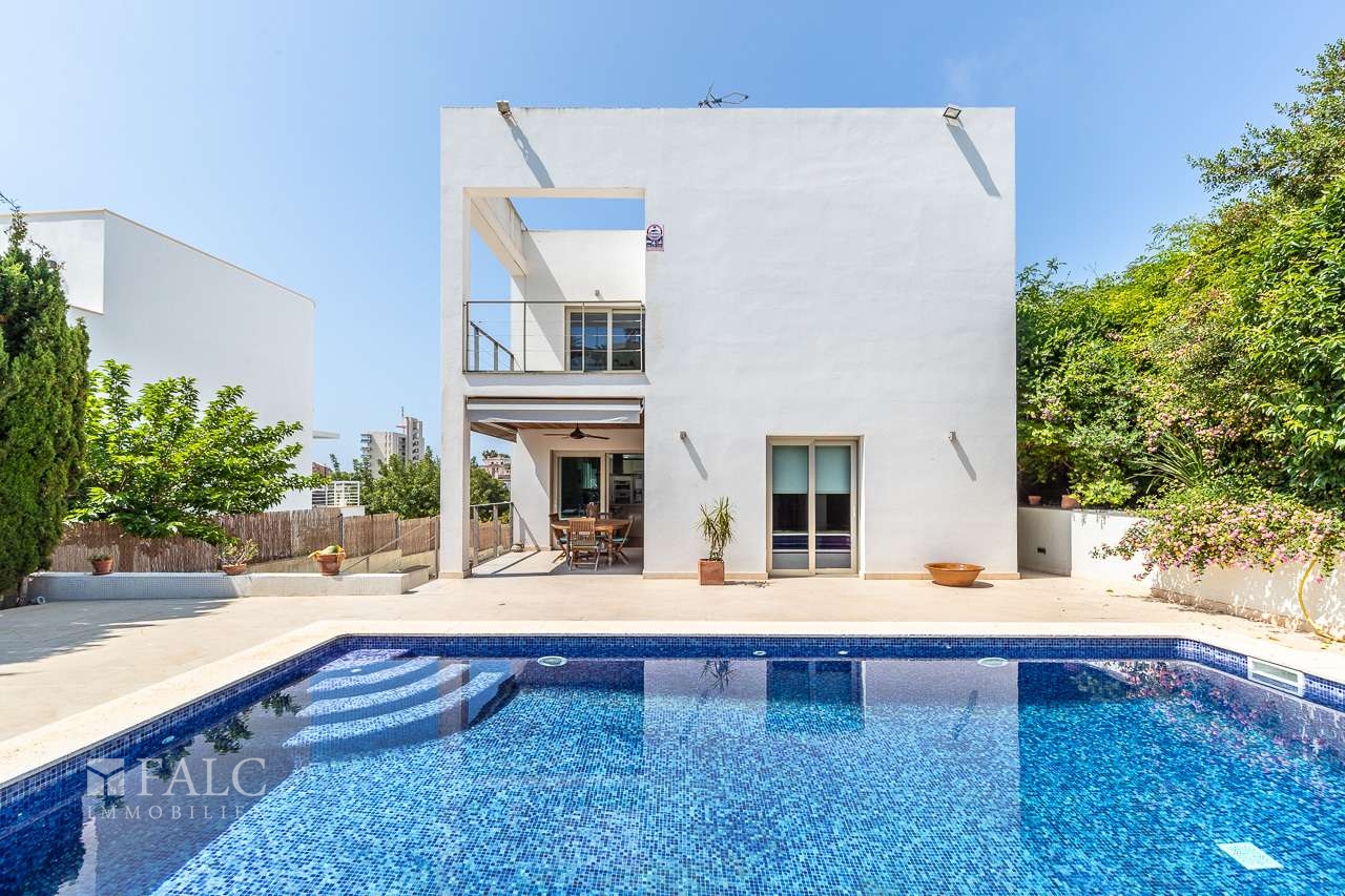 Diese herrliche moderne Villa in La Bonanova mit Teilmeerblick befindet sich in einem ruhigen und gefragten Viertel, nur wenige Minuten vom Zentrum Palmas entfernt. Die wunderbare, nach Süden ausgerichtete Immobilie bietet ein sonniges Grundstück von ca. 637 m2 und eine bebaute Fläche von ca. 444 m2, die sich wie folgt auf 3 Etagen verteilt: Im Hauptgeschoss befinden sich das helle Wohn-/Esszimmer mit Kamin, eine großartige offene Küche mit Zugang zu einer fantastischen Terrasse mit Grill und partiellem Meerblick, 2 Schlafzimmer mit Einbauschränken, eines davon mit Bad en suite. Durch die Küche erreichen wir den schönen Aussenbereich des Hauses mit Salzwasserpool und Garten. Das Obergeschoss bietet eine herrliche Aussicht und 3 Schlafzimmer, 2 davon mit Badezimmern en suite und jeweils einem Balkon. In der unteren Etage befinden sich eine Garage für 3 Autos und Stellplätze für 3 weitere Autos, ein Fitnessraum und ein Weinkeller. Extras: Parkettboden, Klimaanlage, Heizkörper, Abstellraum und vieles mehr. Es handelt sich um eine grüne und ruhige Wohngegend, nur wenige Autominuten von mehreren schönen Stränden und Buchten entfernt. Der exklusive Golfplatz von Son Vida ist nur 5 Autominuten entfernt.