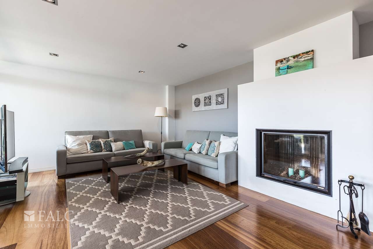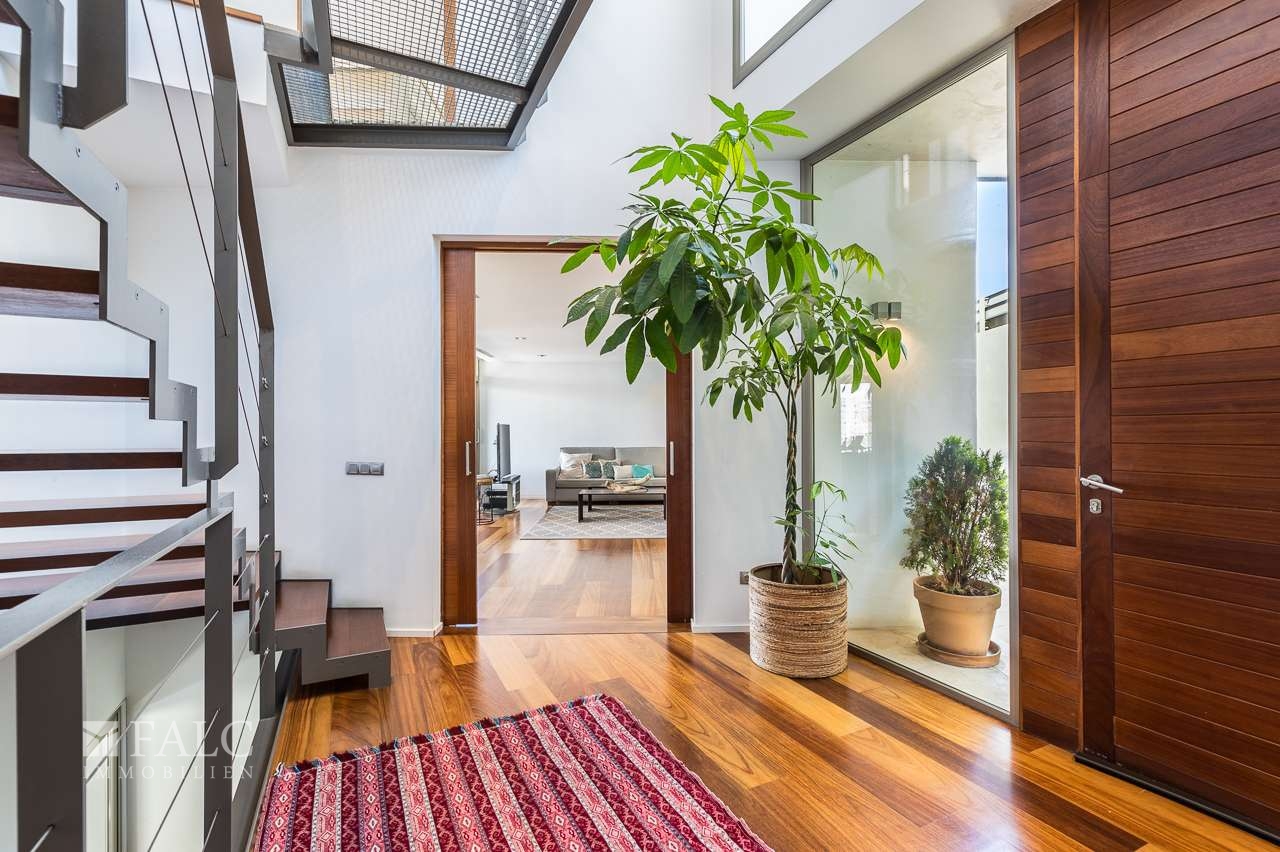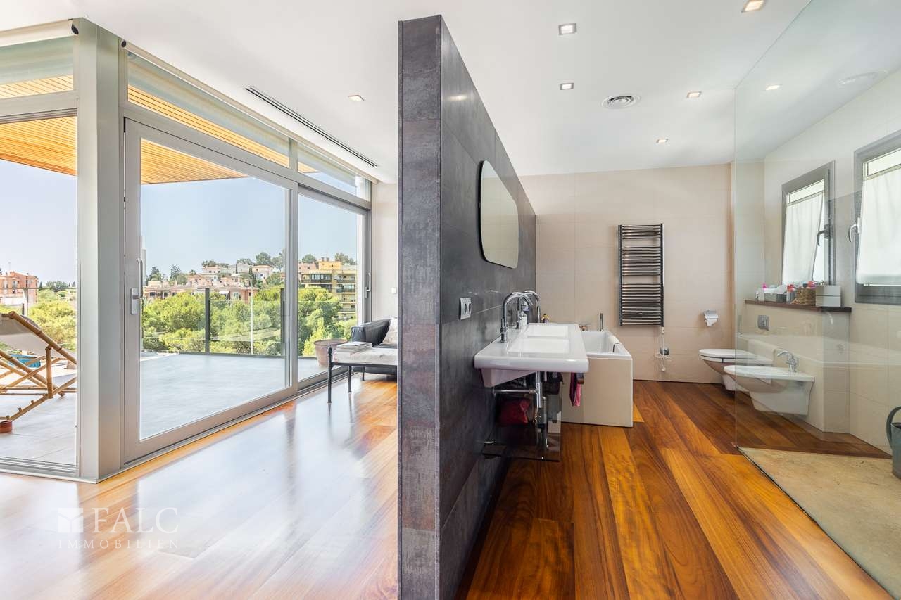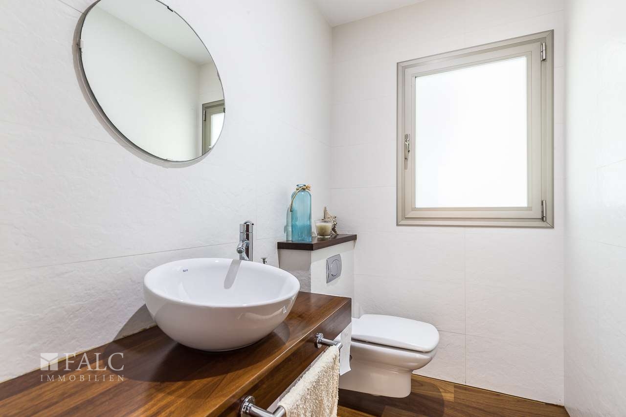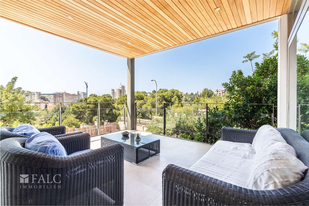Diese herrliche moderne Villa in La Bonanova mit Teilmeerblick befindet sich in einem ruhigen und gefragten Viertel, nur wenige Minuten vom Zentrum Palmas entfernt. Die wunderbare, nach Süden ausgerichtete Immobilie bietet ein sonniges Grundstück von ca. 637 m2 und eine bebaute Fläche von ca. 444 m2, die sich wie folgt auf 3 Etagen verteilt: Im Hauptgeschoss befinden sich das helle Wohn-/Esszimmer mit Kamin, eine großartige offene Küche mit Zugang zu einer fantastischen Terrasse mit Grill und partiellem Meerblick, 2 Schlafzimmer mit Einbauschränken, eines davon mit Bad en suite. Durch die Küche erreichen wir den schönen Aussenbereich des Hauses mit Salzwasserpool und Garten. Das Obergeschoss bietet eine herrliche Aussicht und 3 Schlafzimmer, 2 davon mit Badezimmern en suite und jeweils einem Balkon. In der unteren Etage befinden sich eine Garage für 3 Autos und Stellplätze für 3 weitere Autos, ein Fitnessraum und ein Weinkeller. Extras: Parkettboden, Klimaanlage, Heizkörper, Abstellraum und vieles mehr. Es handelt sich um eine grüne und ruhige Wohngegend, nur wenige Autominuten von mehreren schönen Stränden und Buchten entfernt. Der exklusive Golfplatz von Son Vida ist nur 5 Autominuten entfernt.