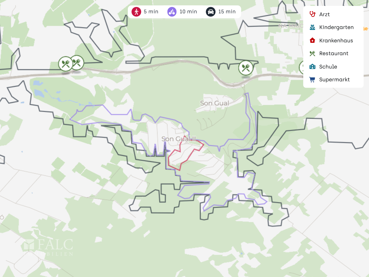 Die Verkehrsanbindung ist ein klarer Pluspunkt: Mehrere Autobahnauffahrten erreichen Sie in wenigen Minuten mit dem Auto, wodurch Sie zügig Richtung Palma, Inselmitte oder an die Küste gelangen. Eine Bushaltestelle ist in Son Gual fußläufig erreichbar, was den Standort auch ohne Auto praktikabel macht. Der Flughafen Palma de Mallorca ist ebenfalls in kurzer Fahrzeit erreichbar und macht die Lage besonders komfortabel für An- und Abreisen.