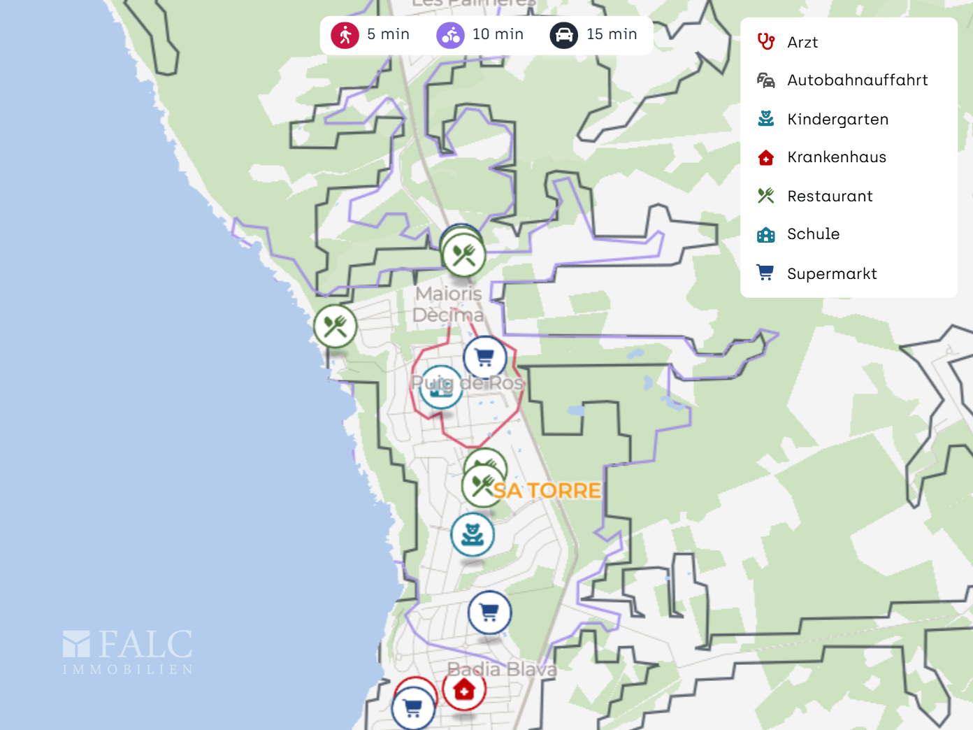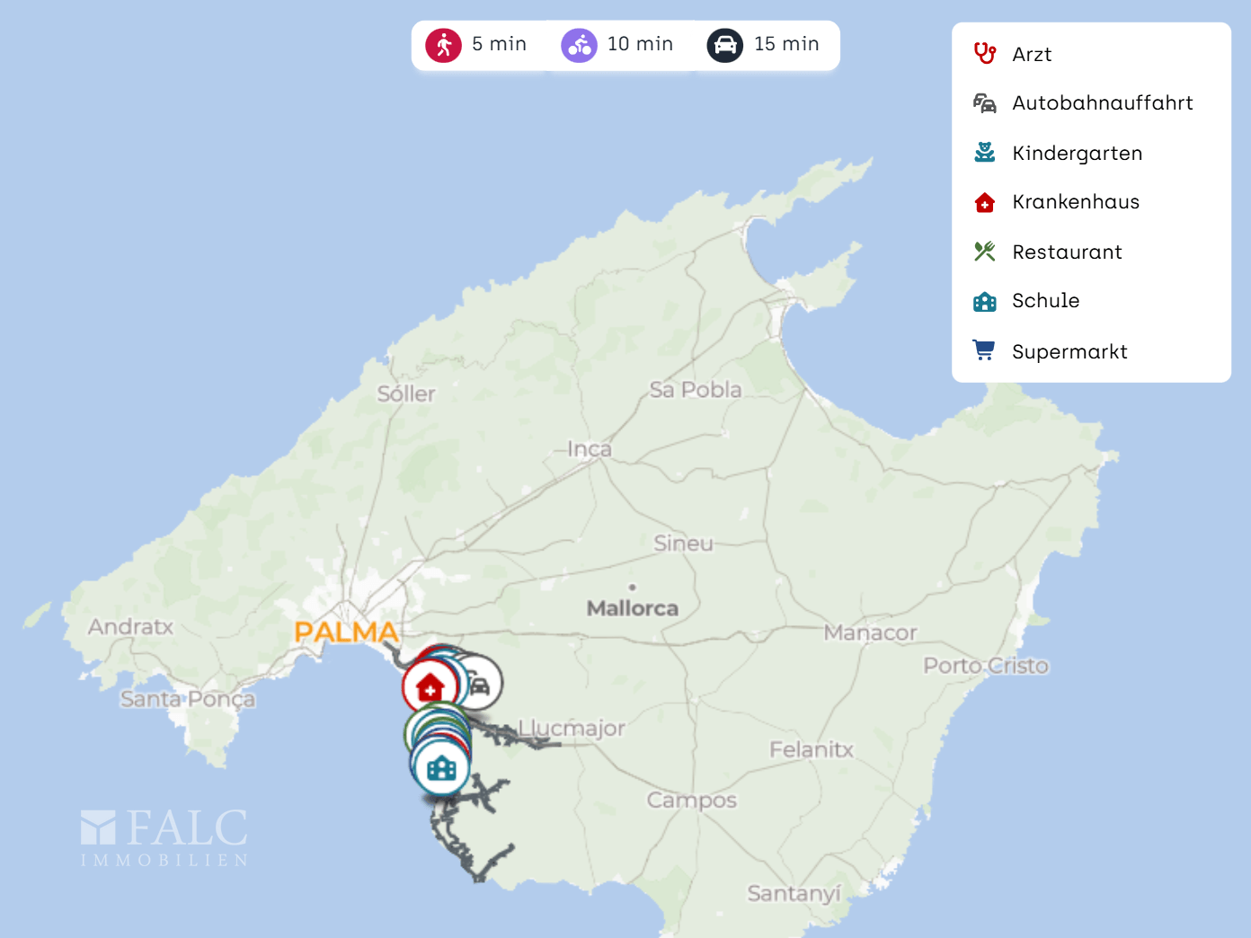 Mehrere Bushaltestellen befinden sich fußläufig, sodass Sie auch ohne Auto flexibel bleiben. Mit dem Pkw erreichen Sie die nächste Autobahnauffahrt in etwa 10 Minuten, was die Wege Richtung Palma und über die Insel erleichtert. Der Flughafen Palma de Mallorca ist je nach Verkehr in etwa 20 bis 30 Minuten erreichbar und damit ideal für Pendler, Zweitwohnsitz oder regelmäßige Reisen.