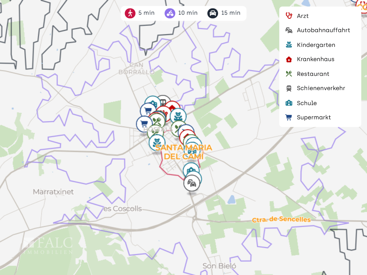 Für den öffentlichen Verkehr ist Santa Maria del Camí ebenfalls gut aufgestellt: Der Bahnhof im Ort bietet eine praktische Verbindung Richtung Palma und ins Inselinnere. Der Flughafen Palma de Mallorca ist mit dem Auto in etwa 20 Minuten erreichbar.