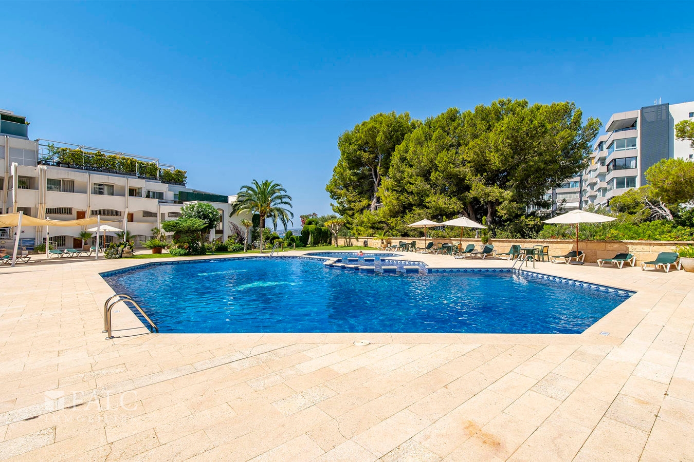 Die schöne, nach Südwesten ausgerichtete Wohnung mit Ausblick auf das Meer und den Poolbereich befindet sich im 3. Stock eines gepflegten Wohnhauses und bietet eine großzügige bebaute Fläche von ca. 104 m², die sich wie folgt aufteilt: ein helles Wohn- / Esszimmer mit offener und voll ausgestatteter Designer-Küche mit Zugang zur Sonnenterrasse, ein Schlafzimmer mit Bad en suite, ein weiteres Schlafzimmer sowie ein Badezimmer.