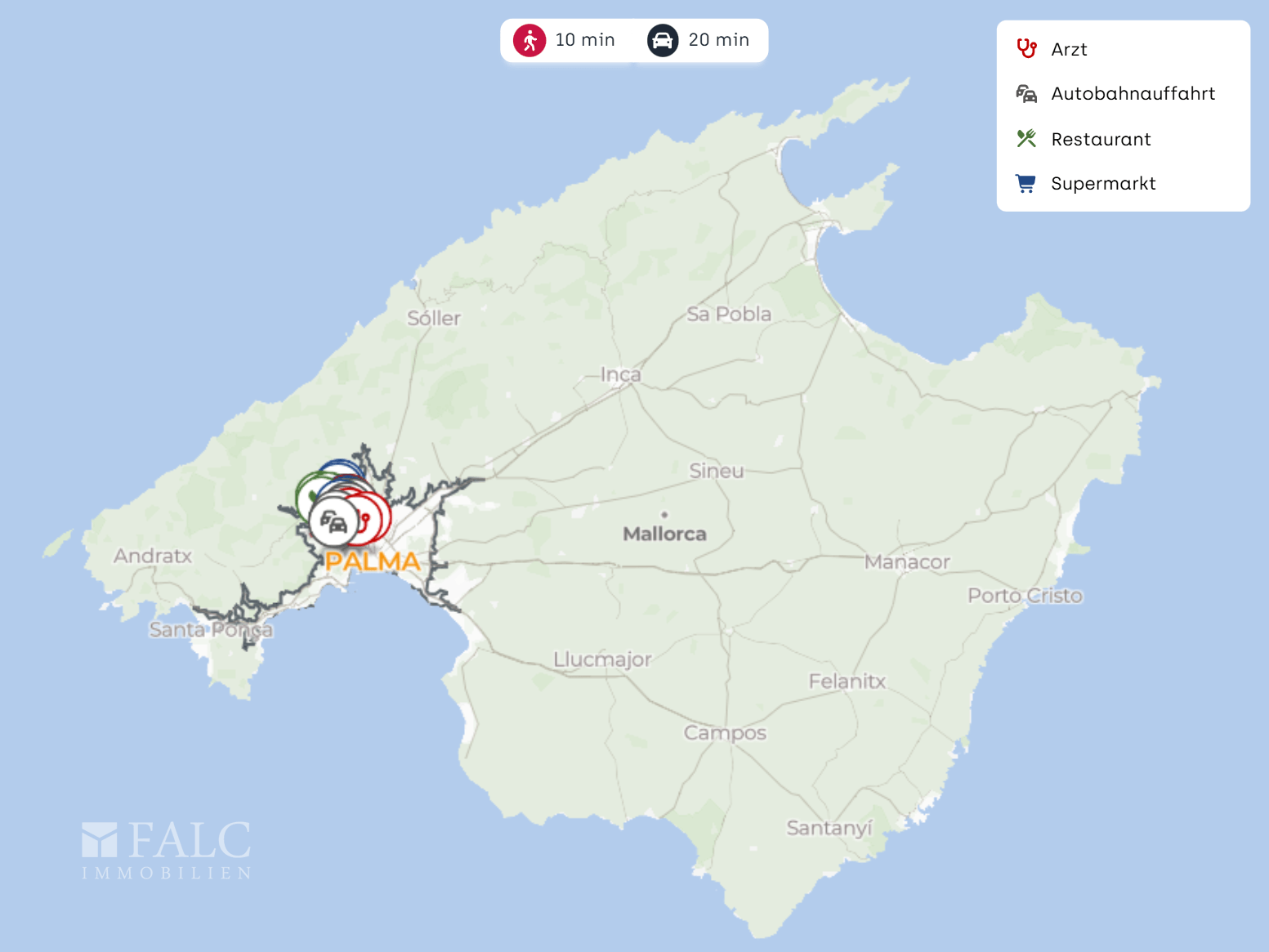 Die Anbindung mit dem Auto ist komfortabel: Mehrere Autobahnauffahrten liegen in ca. 3 km Entfernung und erleichtern die schnelle Orientierung in Richtung Palma und überregionale Ziele. Der Flughafen Palma de Mallorca ist je nach Verkehr in ca. 20 Minuten erreichbar.