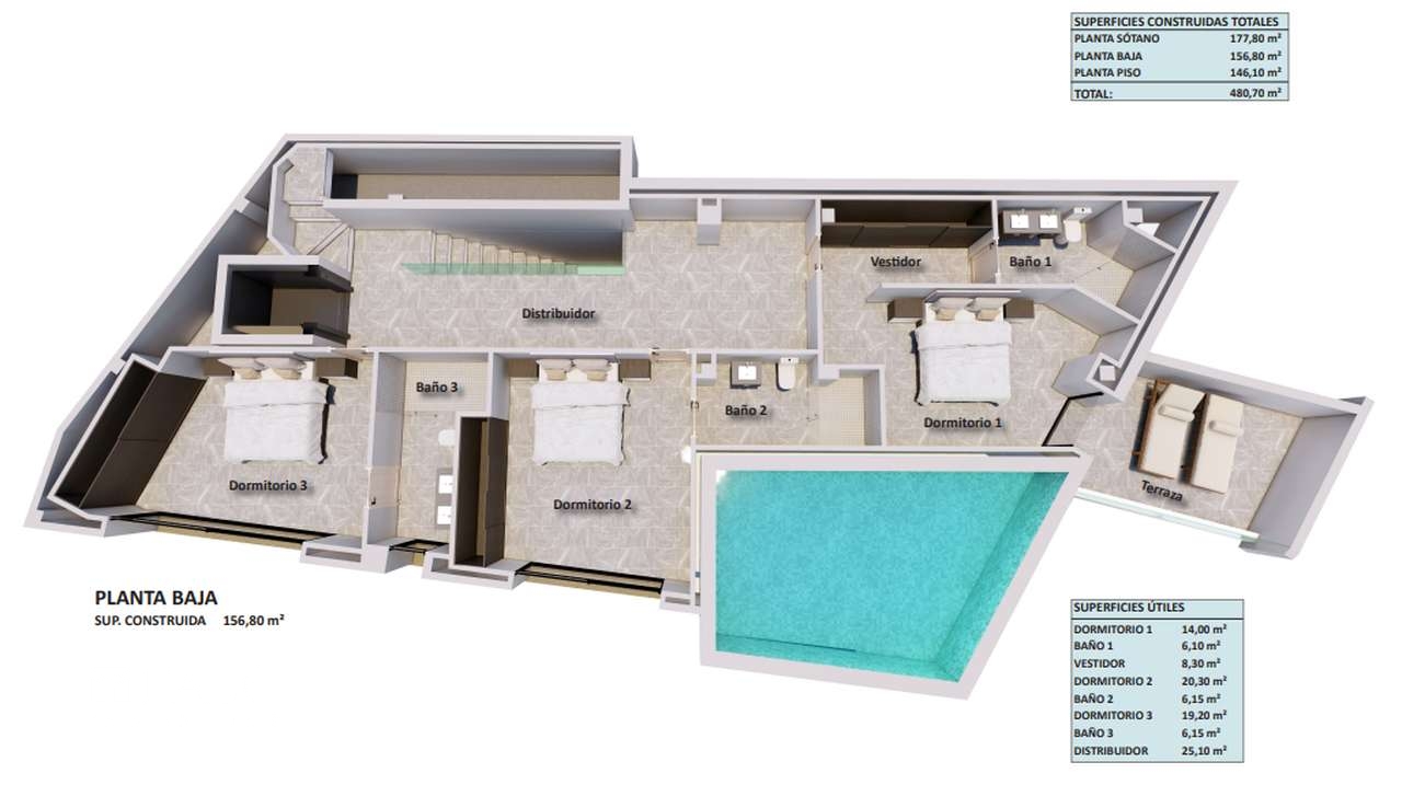 Diese elegante Neubau-Villa in Costa den Blanes befindet sich oberhalb des luxuriösen Hafen Puerto Portals in einer ruhigen Wohngegend. Die fantastische Villa in Hanglage im minimalistischen Stil hat eine bebaute Fläche von ca. 480 m2 und ist wie folgt aufgeteilt: Ein offener Wohn/- Essbereich, eine offene und voll ausgestattete Küche sowie ein grosses Schlafzimmer mit Ankleidebereich und Bad en suite. Von allen Räumen hat man direkten Zugang zur ca. 120 m2 grossen Terrasse und zum Pool. Von der oberen Etage aus eröffnet sich ein wunderschöner Blick auf die mediterrane Landschaft und auf das Meer. Im unteren Wohnbereich befinden sich insgesamt 3 Schlafzimmer. Ein Hauptschlafzimmer mit Ankleidebereich, Bad en suite und einer privaten Terrasse, sowie 2 weitere Schlafzimmer mit jeweils einem Bad en suite. In der untersten Etage befindet sich eine Garage, die Platz für 2 Fahrzeuge bietet.