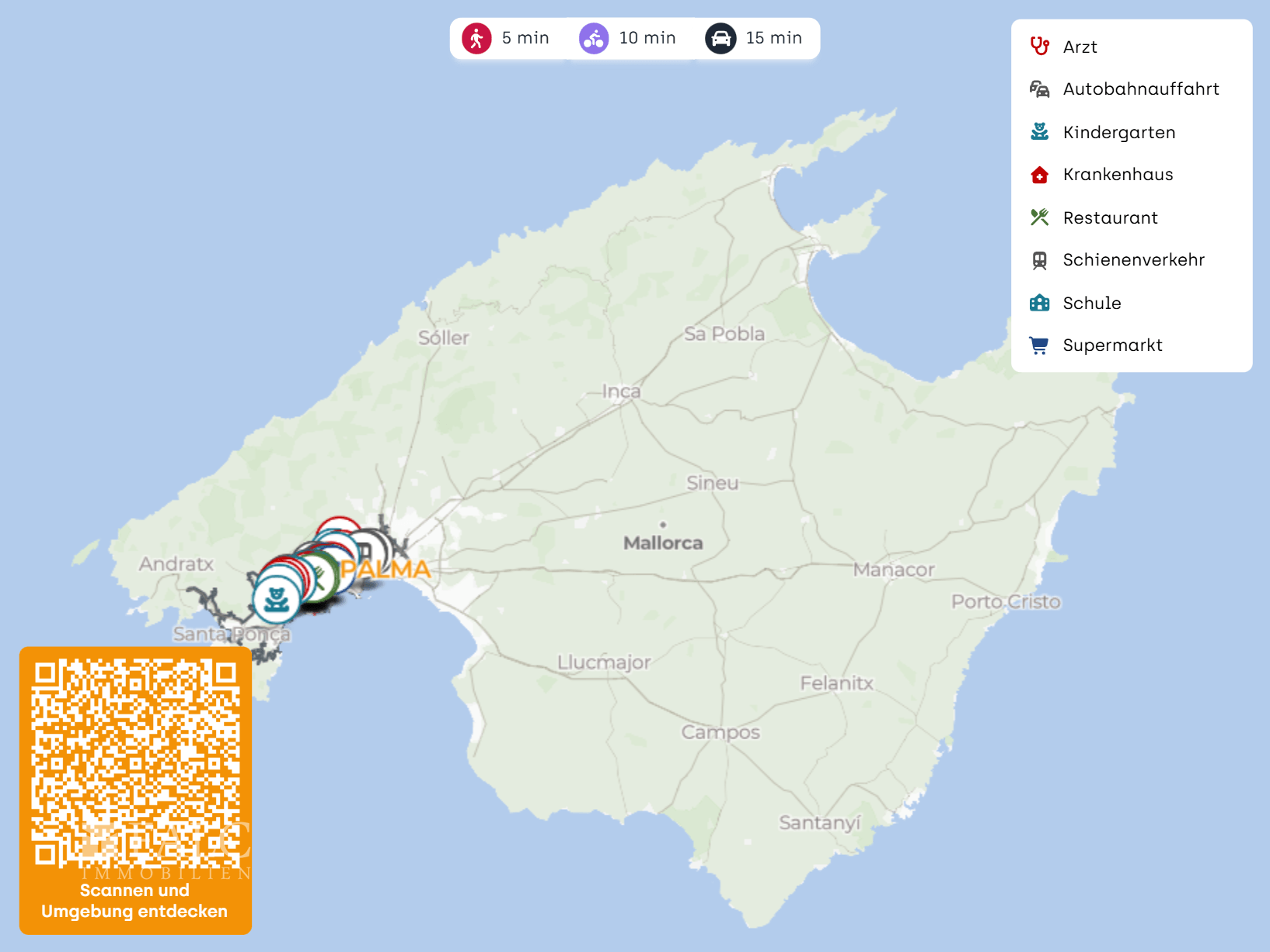 Auch für Familien ist die Lage attraktiv: Die Àgora Portals International School befindet sich in ca. 1 km Entfernung. Weitere Bildungseinrichtungen wie das King Richard III College liegen ebenfalls in der Nähe, etwa ca. 1 bis 1,5 km.