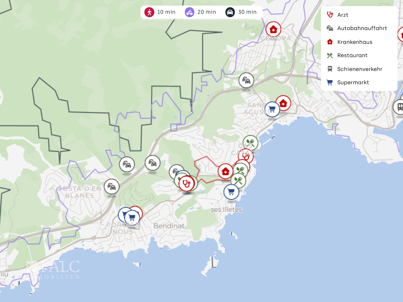 Die nächste Bushaltestelle Ctra. Andratx Av. Mallorca 1 Cas Català liegt ca. 0,3 km entfernt und sorgt für eine unkomplizierte Anbindung in die Umgebung. Mit dem Auto erreichen Sie die Autobahnauffahrt in ca. 0,5 km, wodurch Palma und der Südwesten der Insel zügig angebunden sind. Der Flughafen Palma de Mallorca ist je nach Verkehr in etwa 20 bis 30 Minuten mit dem Auto erreichbar.