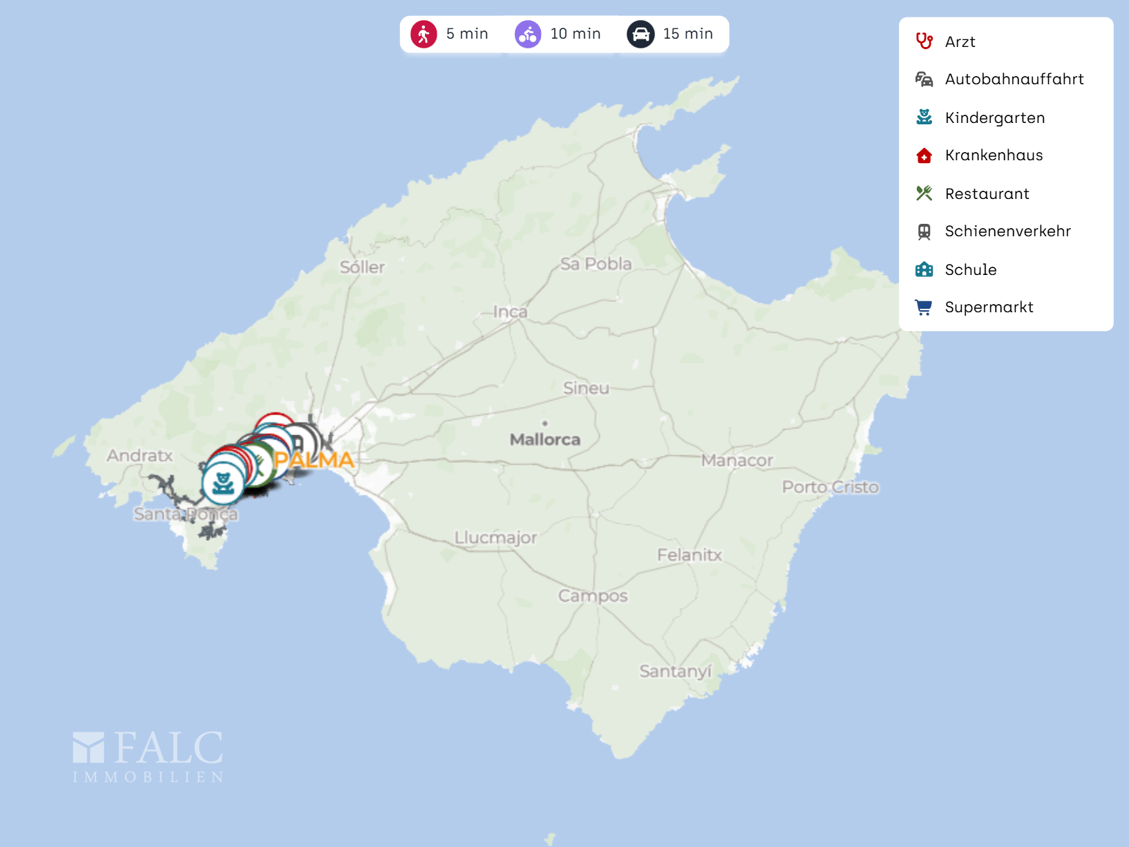 Die nächste Bushaltestelle ist fußläufig erreichbar und sorgt für eine bequeme Verbindung Richtung Palma und Umgebung. Mit dem Auto gelangen Sie zügig zur Autobahnauffahrt, was Ausflüge über die Insel besonders einfach macht. Der Flughafen Palma de Mallorca ist je nach Verkehr in etwa 20 bis 30 Minuten erreichbar, ein klarer Vorteil für Pendler, Zweitwohnsitz oder regelmäßige Reisen.