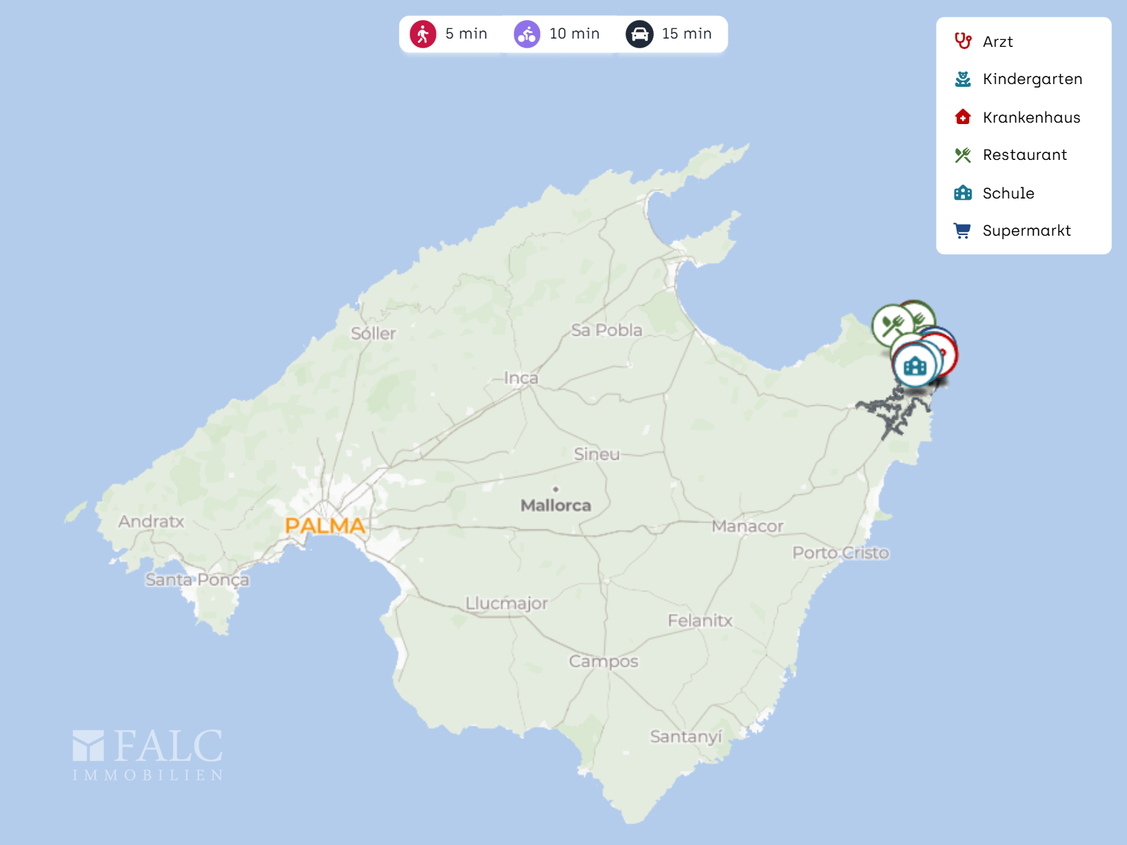 Eine Bushaltestelle ist fußläufig erreichbar und sorgt für eine praktische Anbindung in Richtung Capdepera und Cala Rajada, saisonal auch mit erweiterten Verbindungen. Mit dem Auto gelangt man zügig auf die Ma 15 als wichtigste Verkehrsachse im Nordosten der Insel. Der Flughafen Palma de Mallorca ist je nach Verkehr in etwa einer guten Stunde erreichbar.