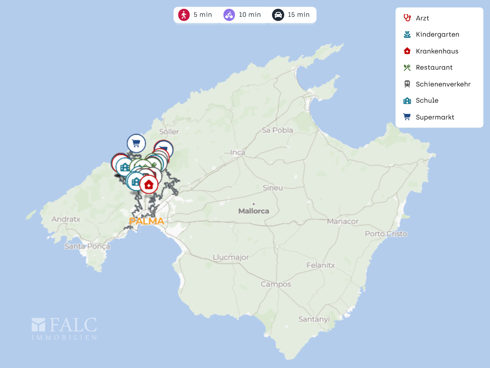 Die nächste Bushaltestelle Son Maixella 1 befindet sich praktisch vor der Tür und sorgt für eine alltagstaugliche Anbindung. Für weitere Wege sind Bahnstationen wie UIB oder Parc Bit in der näheren Umgebung erreichbar. Mit dem Auto gelangt man zügig nach Palma, und auch der Flughafen Palma de Mallorca ist in etwa 20 Minuten erreichbar. Die Anbindung an die überregionalen Straßen ist ebenfalls komfortabel, sodass sich Insellage und Mobilität hier gut ergänzen.
