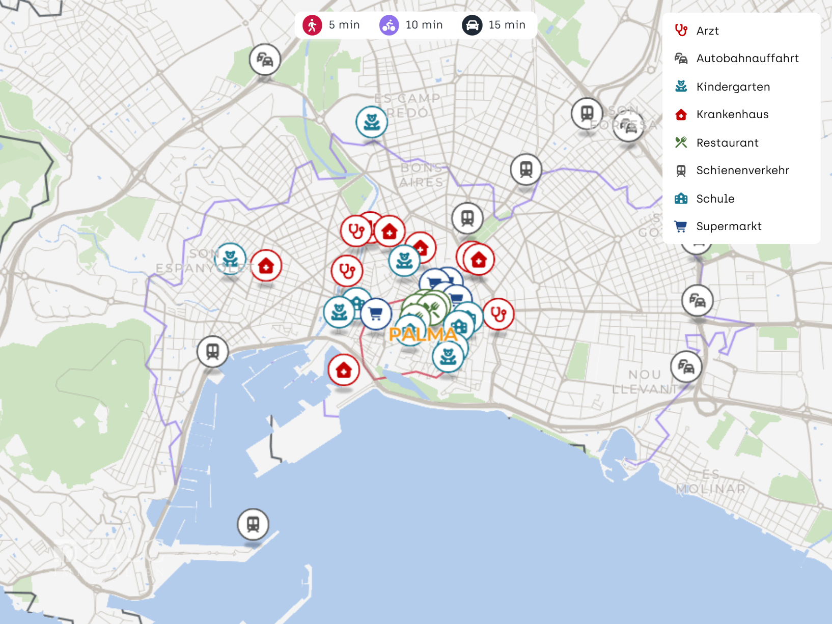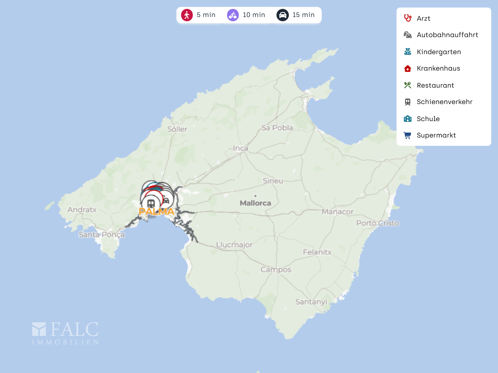 Auch die Wege ans Wasser sind angenehm kurz: Der Stadtstrand Platja de Ca n Pere Antoni ist in wenigen Minuten erreichbar. Wer mit dem Auto unterwegs ist, erreicht die Autobahn Ma 19 in kurzer Zeit. Der Flughafen Palma de Mallorca ist ebenfalls zügig erreichbar und macht die Lage auch für Vielreisende attraktiv. Parkhäuser wie Plaça Major oder Antoni Maura liegen in der Nähe und bieten zusätzliche Flexibilität im Alltag.