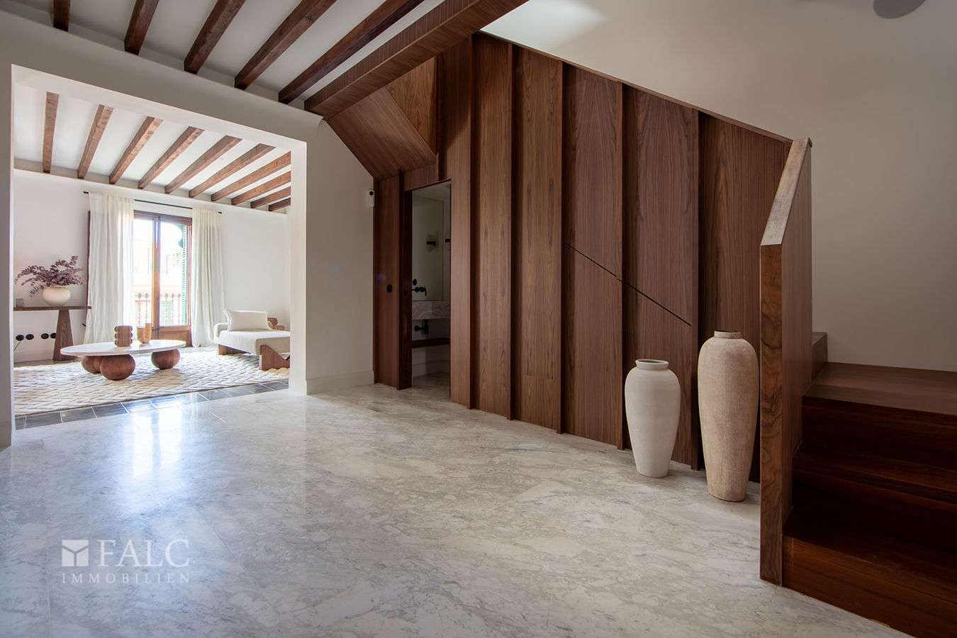 Dieses prächtige Duplex-Penthouse im Herzen von Palmas Altstadt befindet sich in einem restaurierten Art-Deco-Gebäude aus dem Jahr 1904. Das fabelhafte Objekt wurde mit viel Eleganz, Komfort und Stil renoviert. Jedes Detail ist gut durchdacht, um ein komfortables und luxuriöses Leben zu ermöglichen. Aufgrund seiner historischen Bedeutung sind architektonische und dekorative Elemente erhalten geblieben. Durch die Verbindung dieser einzigartigen Details mit modernem Komfort ist ein geschichtsträchtiges Ensemble entstanden, in dem man zeitgemäss leben kann. Die exklusive 2-stöckige Immobilie verfügt über eine bebaute Fläche von ca. 243 m2 plus eine beeindruckende Dachterrasse mit herrlichem Ausblick. Das Hauptgeschoss bietet ein Wohnzimmer mit Balkon zur Straßenseite hin. Auf der Hinterseite befinden sich 2 Schlafzimmer mit Bädern en suite und Fenstern mit Blick auf den zentralen Innenhof, sowie Einbauschränke und mallorquinische Fliesenböden. Das obere Stockwerk, ein offenes Raumkonzept, beherbergt die Küche, das Ess- und das Wohnzimmer, die sich um zwei Seiten des zentralen Innenhofs winden. Die raumhohen Fenster mit Blick auf den Innenhof und der Lichtschacht im hinteren Teil des Raumes sorgen für natürliches Licht. Von hier aus führt eine Treppe hinauf zu einer sonnigen Dachterrasse von etwa 76 m2, von der aus man einen herrlichen Blick auf die Kirche Santa Eulalia und die Kathedrale hat.