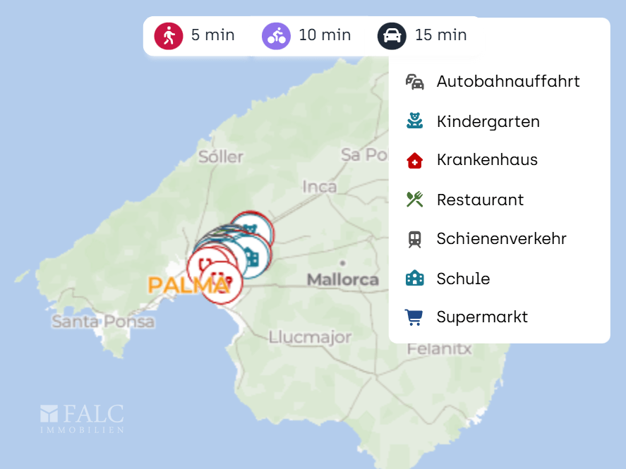 Mit dem Auto ist die Autobahn Ma 13 schnell erreicht, was Wege in Richtung Palma und Inca erleichtert. Der Flughafen Palma de Mallorca ist je nach Verkehr in etwa einer halben Stunde erreichbar und macht die Lage auch für Vielreisende und Zweitwohnsitznutzer attraktiv.