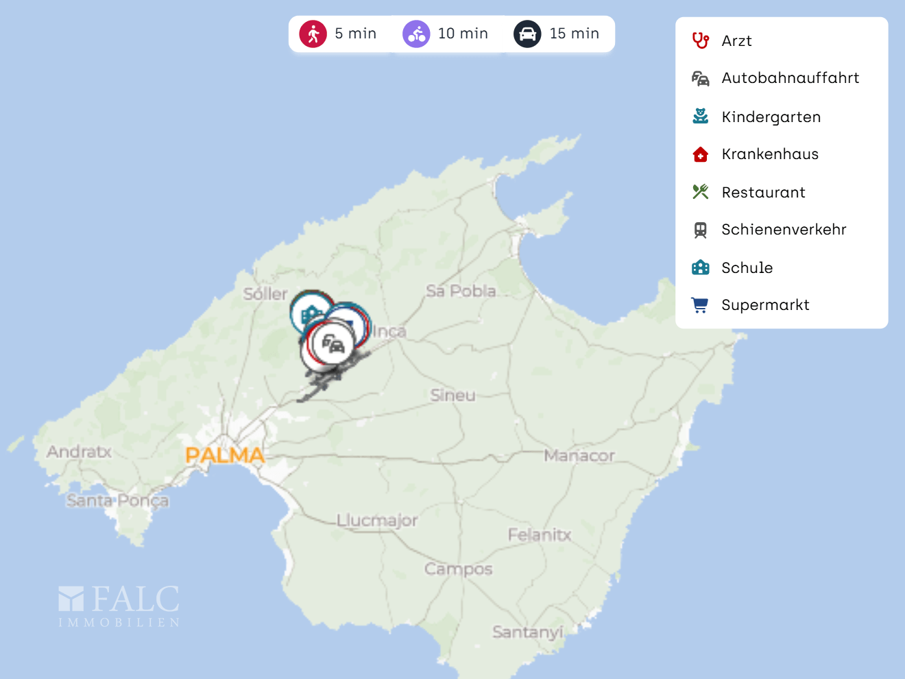 Die nächste Bushaltestelle Alaró liegt in der Nähe und sorgt für eine alltagstaugliche Anbindung. Mit dem Auto erreichen Sie die nächste Autobahnauffahrt in ca. 5 bis 10 Minuten und sind damit zügig in Richtung Palma oder Inca unterwegs. Der Bahnhof Binissalem liegt in ca. 10 bis 15 Minuten Fahrzeit und bietet eine zusätzliche Alternative für Wege über die Insel. Der Flughafen Palma de Mallorca ist je nach Verkehr in ca. 30 bis 40 Minuten erreichbar.