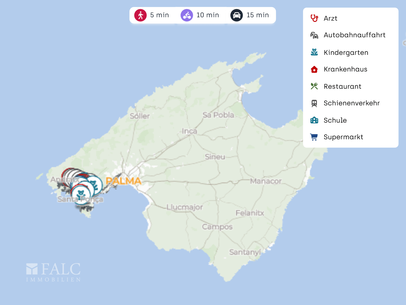 Die Anbindung ist komfortabel: Eine Bushaltestelle wie Platja (Santa Ponça) liegt in der Nähe und erleichtert Wege im Ort und Richtung Palma. Die nächste Autobahnauffahrt zur Ma 1 ist in wenigen Minuten erreichbar und verbindet Santa Ponça zügig mit Palma und weiteren Zielen der Insel. Der Flughafen Palma de Mallorca ist je nach Verkehr in etwa 30 Fahrminuten erreichbar.