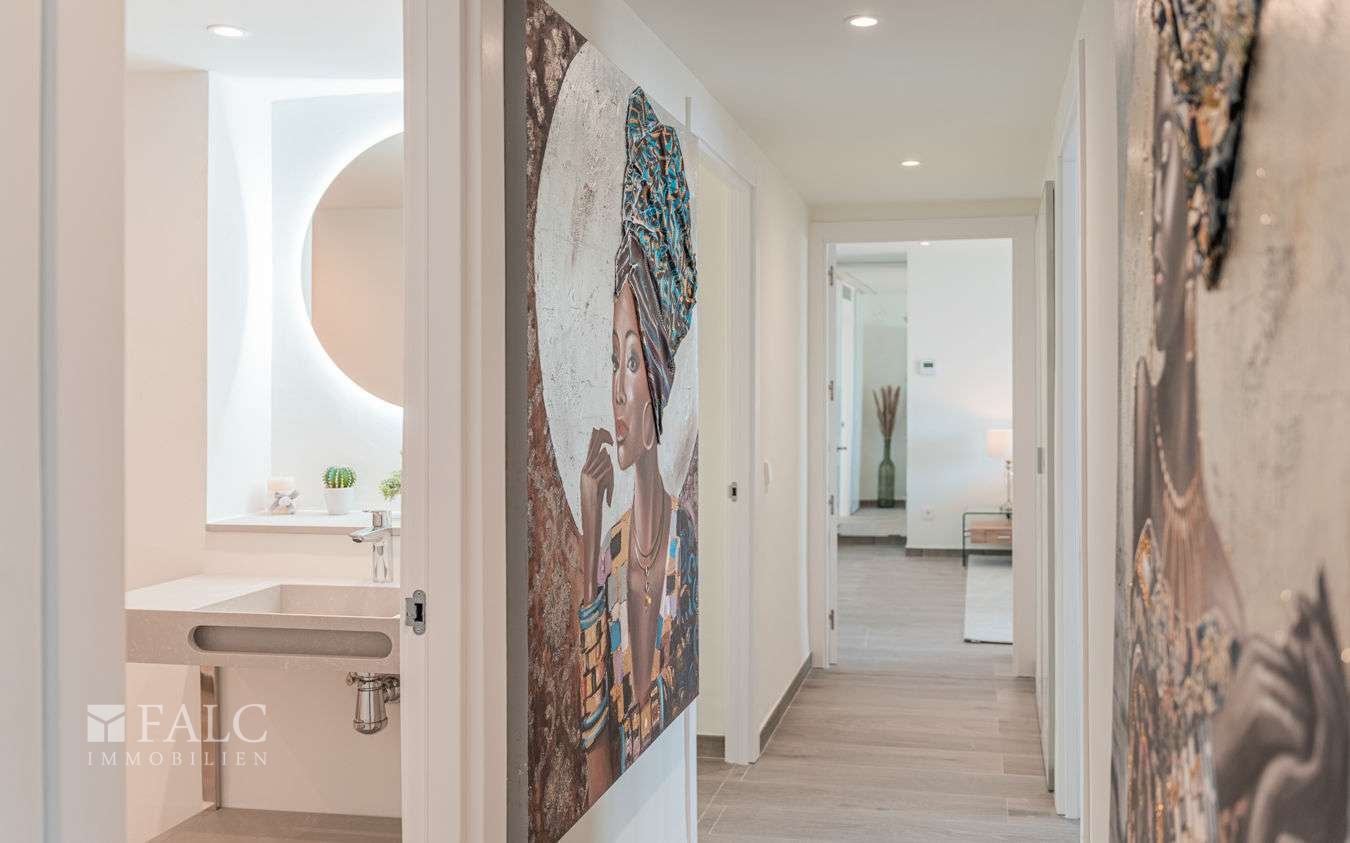 Die Anbindung ist ein klarer Standortvorteil: Bushaltestellen an der Avinguda de Joan Miró sind fußläufig erreichbar und bieten eine unkomplizierte Verbindung Richtung Palma Zentrum. Für Autofahrer liegt eine Autobahnauffahrt praktisch direkt in der Nähe, was schnelle Wege in verschiedene Richtungen ermöglicht. Der Flughafen Palma de Mallorca ist je nach Verkehr in etwa 15 bis 25 Minuten mit dem Auto erreichbar. Parkmöglichkeiten wie Parkhäuser und Stellplätze befinden sich ebenfalls in der Umgebung.