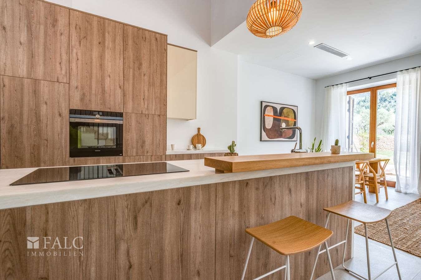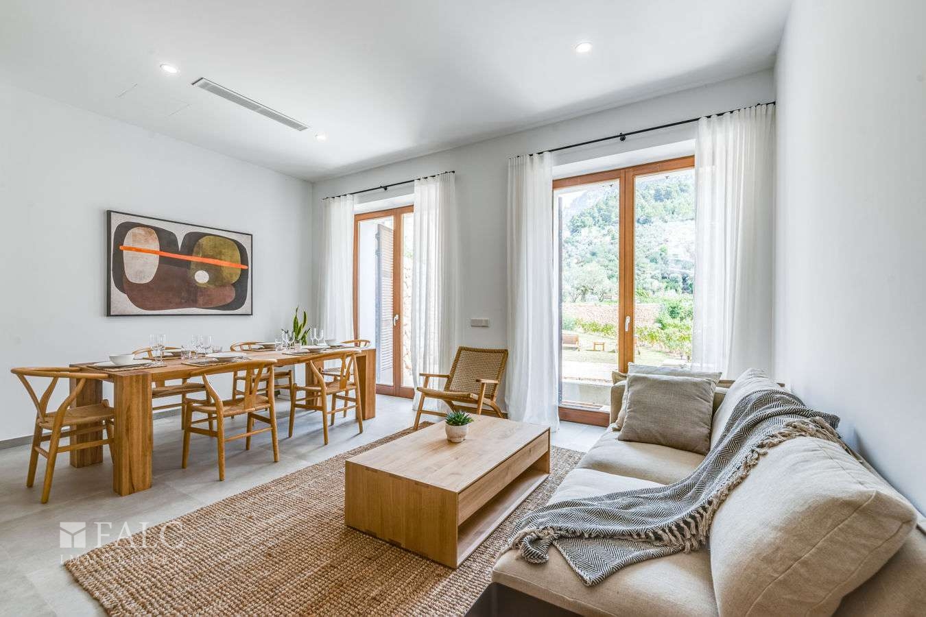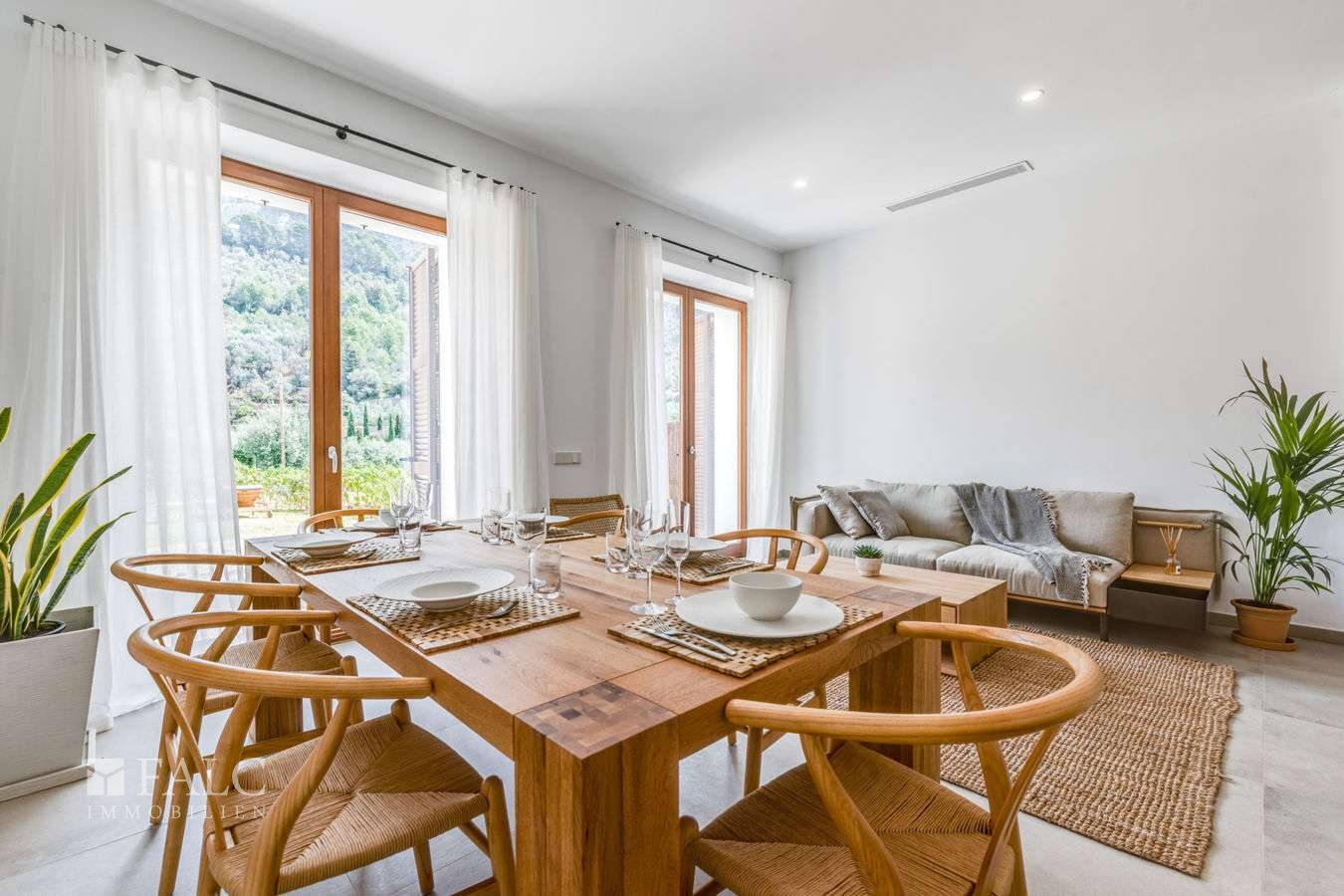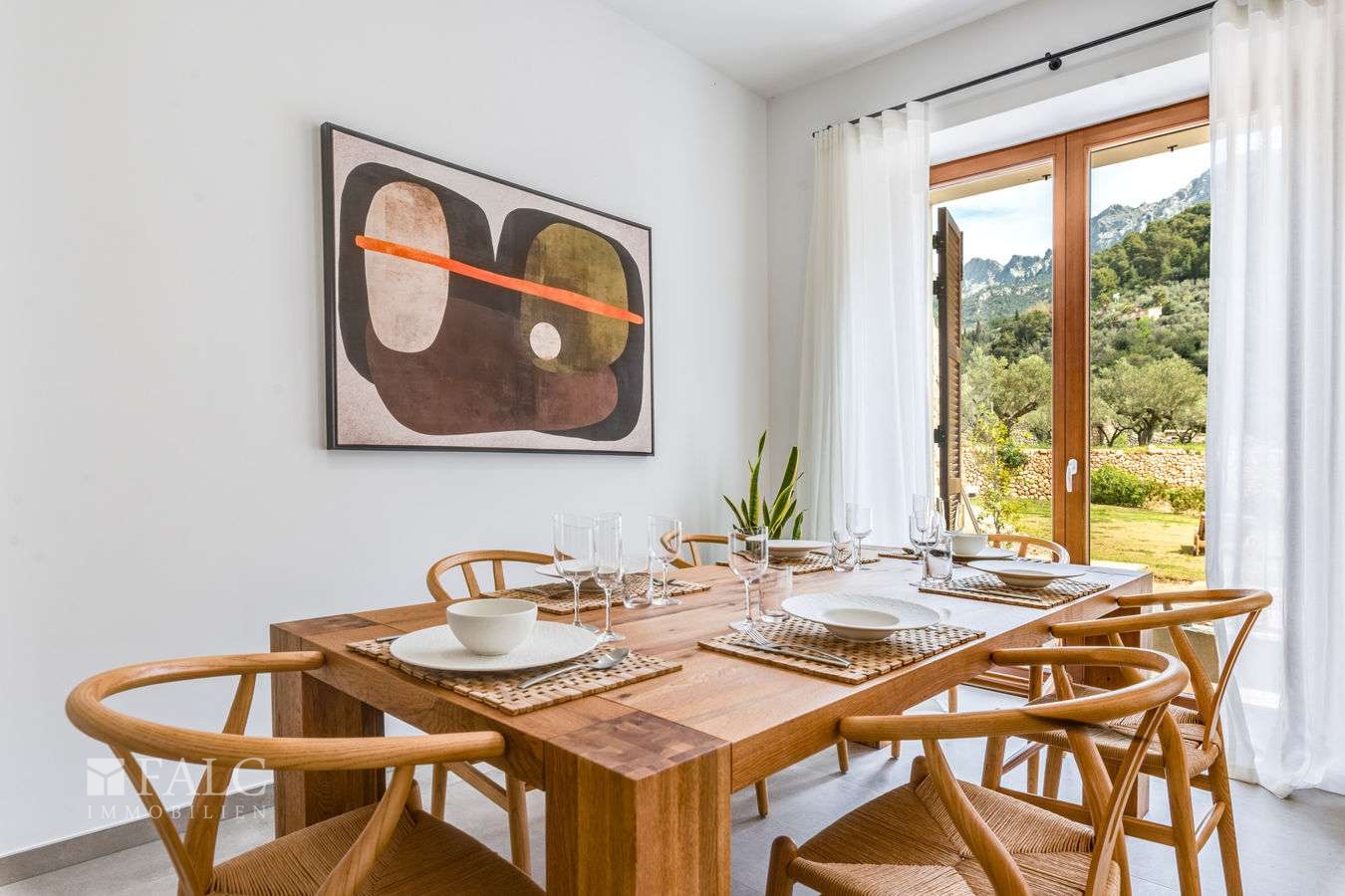 Umgeben von den herrlichen Bergen der Sierra de Tramontana, präsentieren wir Ihnen dieses neuerbaute Luxus-Reihenhaus in Fornalutx. Das exklusive Objekt ist Teil von 6 fantastischen, hochwertigen Reihenhäusern mit unschlagbarem Blick auf die atemberaubende Bergkulisse. Die lichtdurchfluteten Immobilien, die auf dem letzten Baugrundstück in Fornalutx errichtet wurden, bieten eine perfekte Kombination aus rustikalem und modernem Design. Jede Immobilie hat eine Grundstücksfläche zwischen 288 m2 und 1043 m2 und eine grosszügige Wohnfläche, die sich auf 3 geräumige Etagen verteilt. Dieses Haus ist eines der Größten, mit einer Wohnfläche von 171 m2, die sich auf eine schöne Eingangshalle, ein fantastisches Wohn-/Esszimmer mit grossen, lichtdurchfluteten Fenstern, die zum herrlichen Garten mit privatem Pool und wundervollem Blick auf die Berge führen, eine exzellente, mit Siemens- und Liebherr-Geräten ausgestattete Küche, 3 Schlafzimmer mit Einbauschränken und 3 Bäder en-suite aufteilt. Weitere Ausstattungsmerkmale: Fussbodenheizung, Klimaanlage warm/kalt, doppelt verglaste Fenster aus Iroko-Holz, Stein- und Keramikböden, Domotiksystem, automatische Bewässerungsanlage, Abstellraum sowie 2 Parkplätze, einer in der Garage und der andere im Freien. Fornalutx, inmitten der Sierra de Tramontana, nur 10 Kilometer von der Nordküste Mallorcas entfernt, gilt als eines der schönsten Dörfer Spaniens.