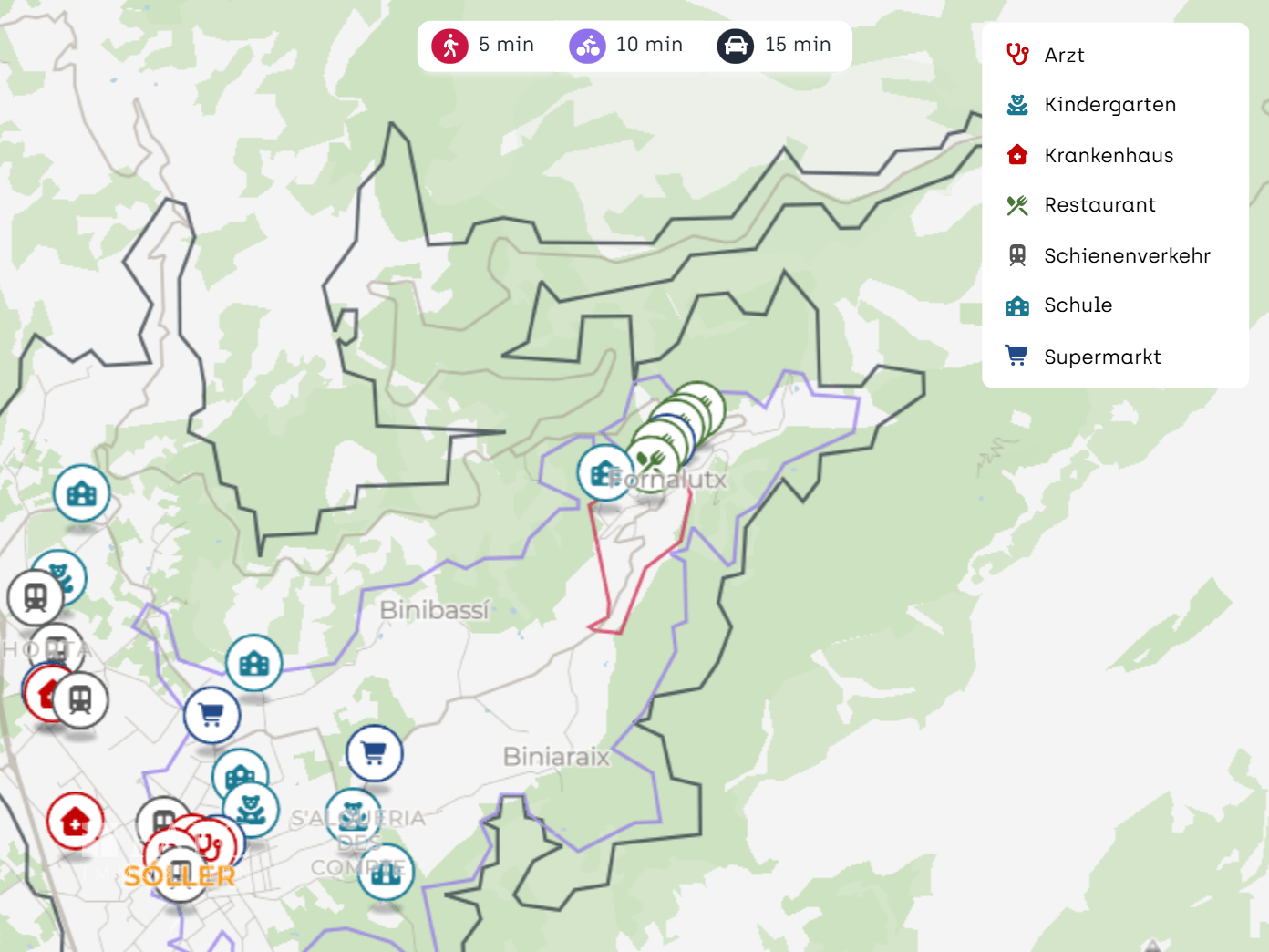 Die nächste Bushaltestelle Fornalutx liegt in der Nähe und bietet eine praktische Anbindung in Richtung Sóller und Umgebung. Der Bahnhof Sóller ist ebenfalls gut erreichbar und eröffnet zusätzliche Verbindungen. Mit dem Auto gelangen Sie in etwa 40 Minuten nach Palma. Der Flughafen Palma de Mallorca ist je nach Verkehr in rund 50 Minuten erreichbar. Eine schnelle Anbindung an eine Autobahn ist auf Mallorca weniger prägend als die gut ausgebauten Inselstraßen, über die Sie die zentralen Knotenpunkte der Insel zügig erreichen.