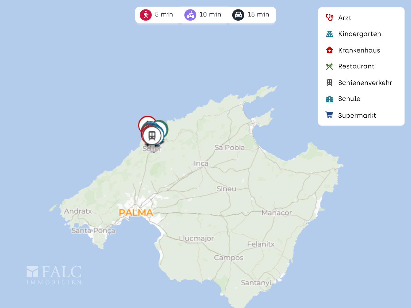 Für Strandtage und Hafenflair bietet sich der Bereich Port de Sóller an, der in der Regel in kurzer Fahrzeit erreichbar ist. Damit verbindet die Lage Natur und Rückzug mit der Möglichkeit, Meer und Stadtleben jederzeit spontan einzuplanen.