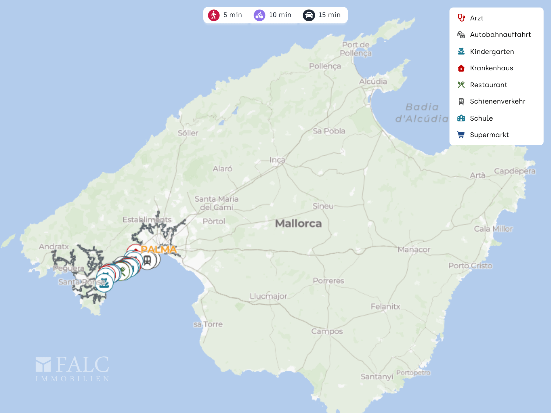 Die nächste Autobahnauffahrt liegt praktisch um die Ecke und sorgt für eine zügige Verbindung in Richtung Palma und über die Insel. Eine Bushaltestelle wie Plaça de Portals 2 ist fußläufig erreichbar und bietet eine alltagstaugliche Anbindung. Der Flughafen Palma de Mallorca ist je nach Verkehr in etwa 20 Minuten mit dem Auto erreichbar.