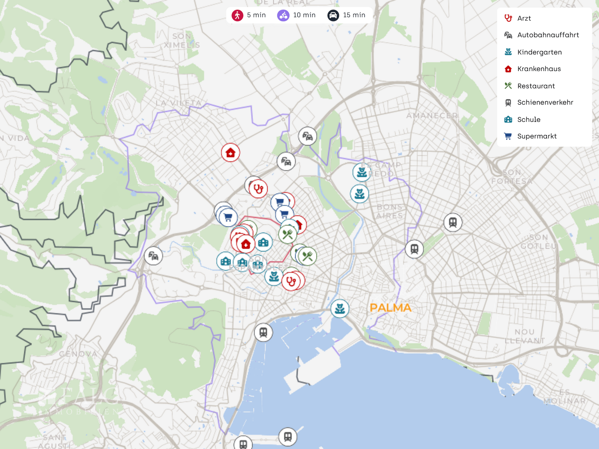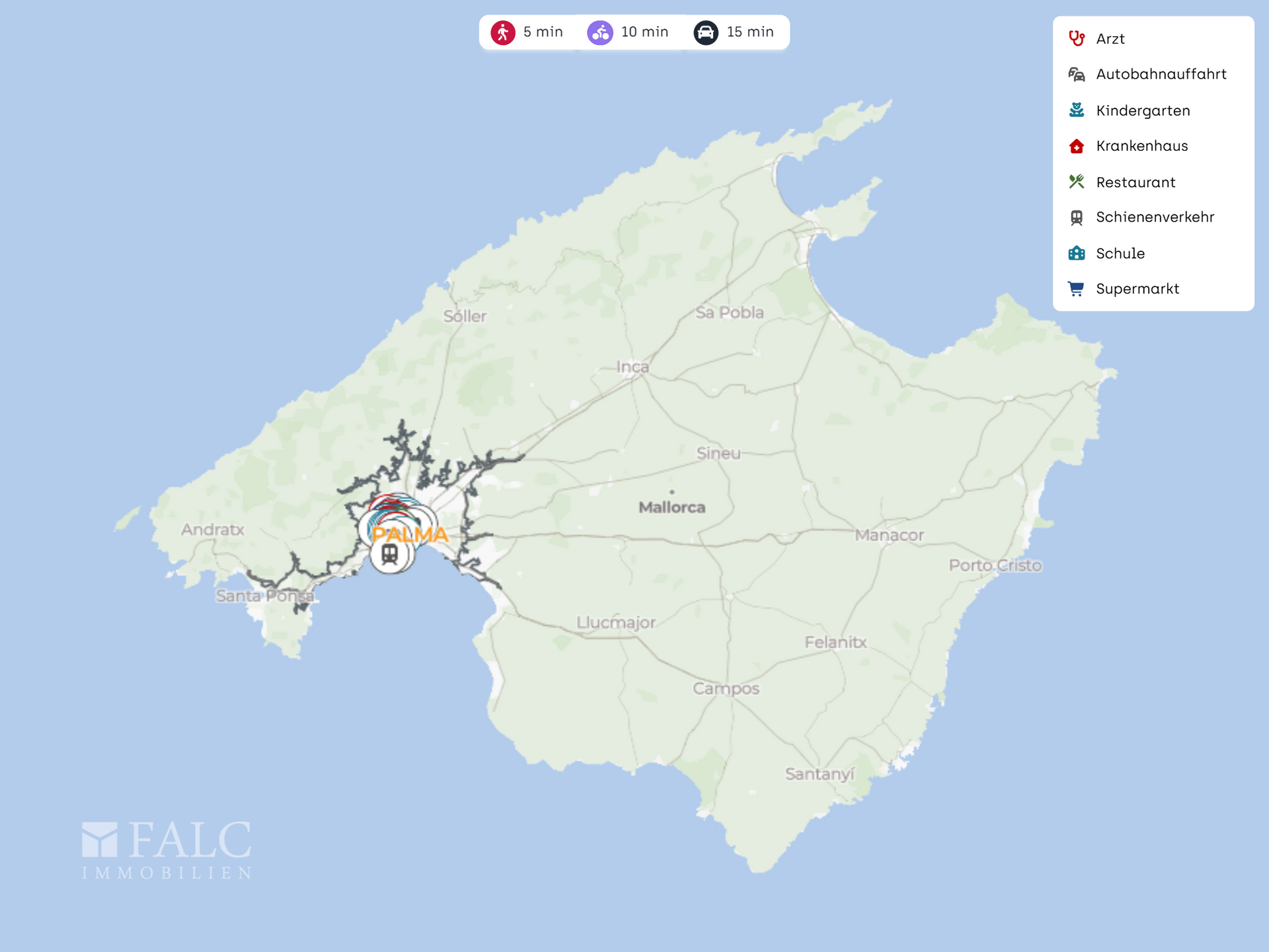 In Summe bietet diese Lage eine ausgewogene Mischung aus Ruhe, Grün und kurzen Wegen zu Einkauf, Gesundheit, Sport und Gastronomie. Besonders hervorzuheben sind die Bushaltestelle Dragonera - Clínica Juaneda, der Supermarkt Mercadona, die Clínica Juaneda sowie der nahe Park, die den Alltag hier spürbar erleichtern.