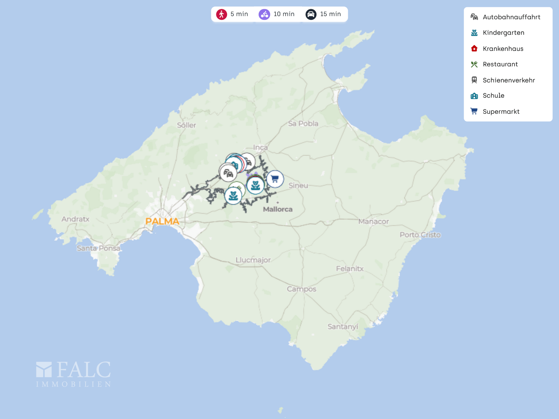 Eine Lage, die Ruhe und mallorquinisches Landleben mit einer alltagstauglichen Infrastruktur verbindet. Kurze Wege zu Einkauf, Gastronomie und Sport sowie die schnelle Anbindung an Autobahn und Flughafen machen den Standort besonders attraktiv.