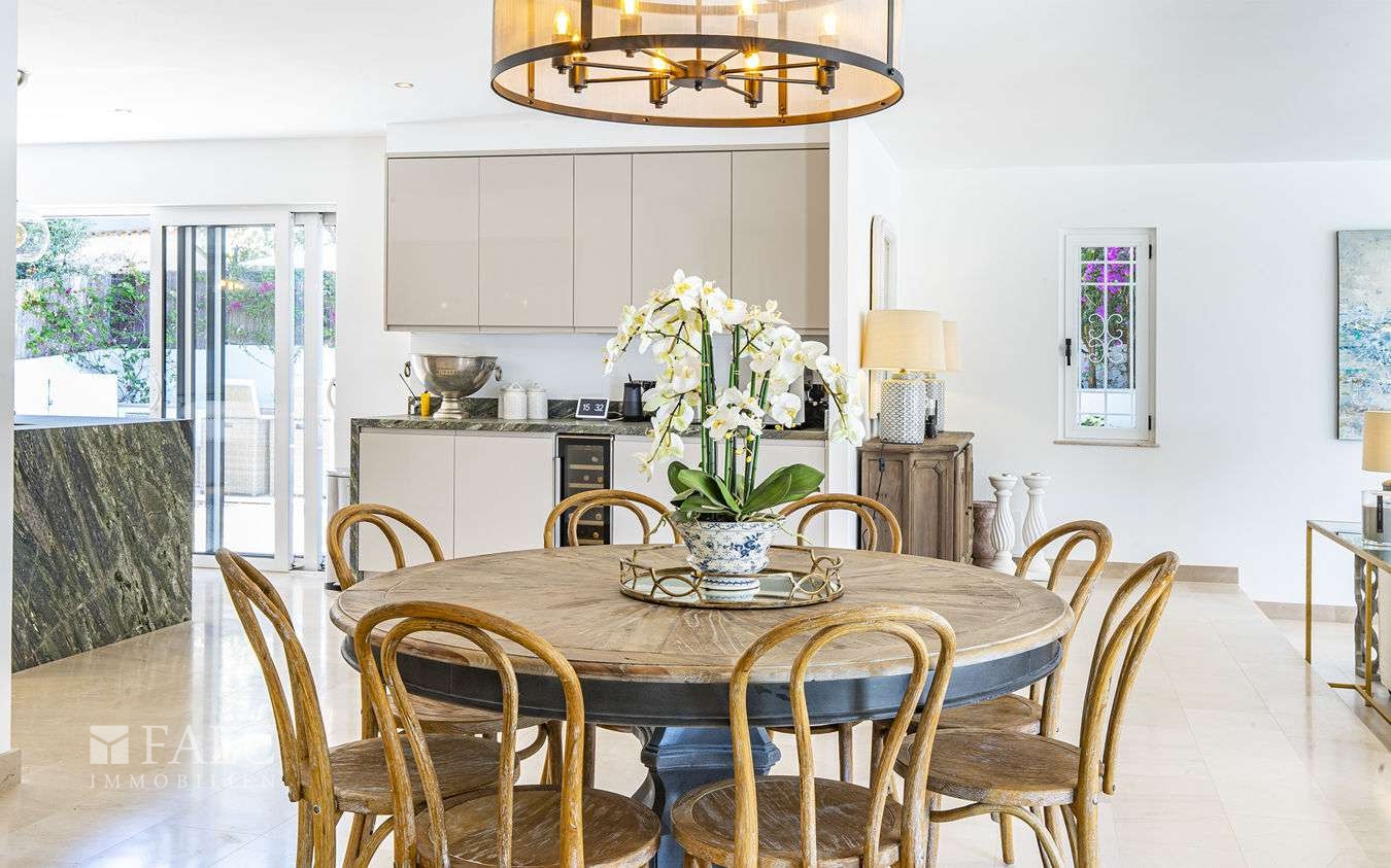 Auf einem sonnigen Grundstück von ca. 966 m2 gelegen und mit einem wunderbaren Meerblick, präsentieren wir diese mediterrane Villa in Santa Ponsa. Die traumhafte Immobilie besticht durch eine beeindruckende Dachterrasse, herrliche Entspannungsbereiche und einen wunderschön angelegten Salzwasserpool umgeben von gepflegten Palmen und schattenspendenden Pinienbäumen. Auf einer Wohnfläche von ca. 179m2 verteilt sich die Immobilie auf zwei Etagen wie folgt: Ein herrliches Wohn-/ Esszimmer mit Zugang zu einer wunderschönen Terrasse mit Blick auf das Mittelmeer, ein offene und voll ausgestattete Designer Küche mit eleganter Kochinsel, eine Master-Suite und 3 weitere geräumige Schlafzimmer mit Einbauschränken und en suite Badezimmern. Der bezaubernde Aussenbereich dieser faszinierenden Villa in Santa Ponsa lädt zum Entspannen und Verweilen ein. Weitere Ausstattungsmerkmale: Fussbodenheizung, die durch eine Wärmepumpe betrieben wird, Klimaanlage im gesamten Haus, doppelt verglaste Fenster und Aussenjalousinen aus Aluminium. Es handelt sich um eine ausgezeichnete Lage, da es in der Umgebung mehrere schöne Strände und Buchten mit kristallklarem Wasser gibt. Der Golfplatz von Santa Ponsa ist nur 5 Minuten mit dem Auto entfernt. Santa Ponsa, im Südwesten Mallorcas gelegen, ist ein äusserst beliebter Ferienort in dem überwiegend vom Luxus-Tourismus geprägten Inselabschnitt Calvia.