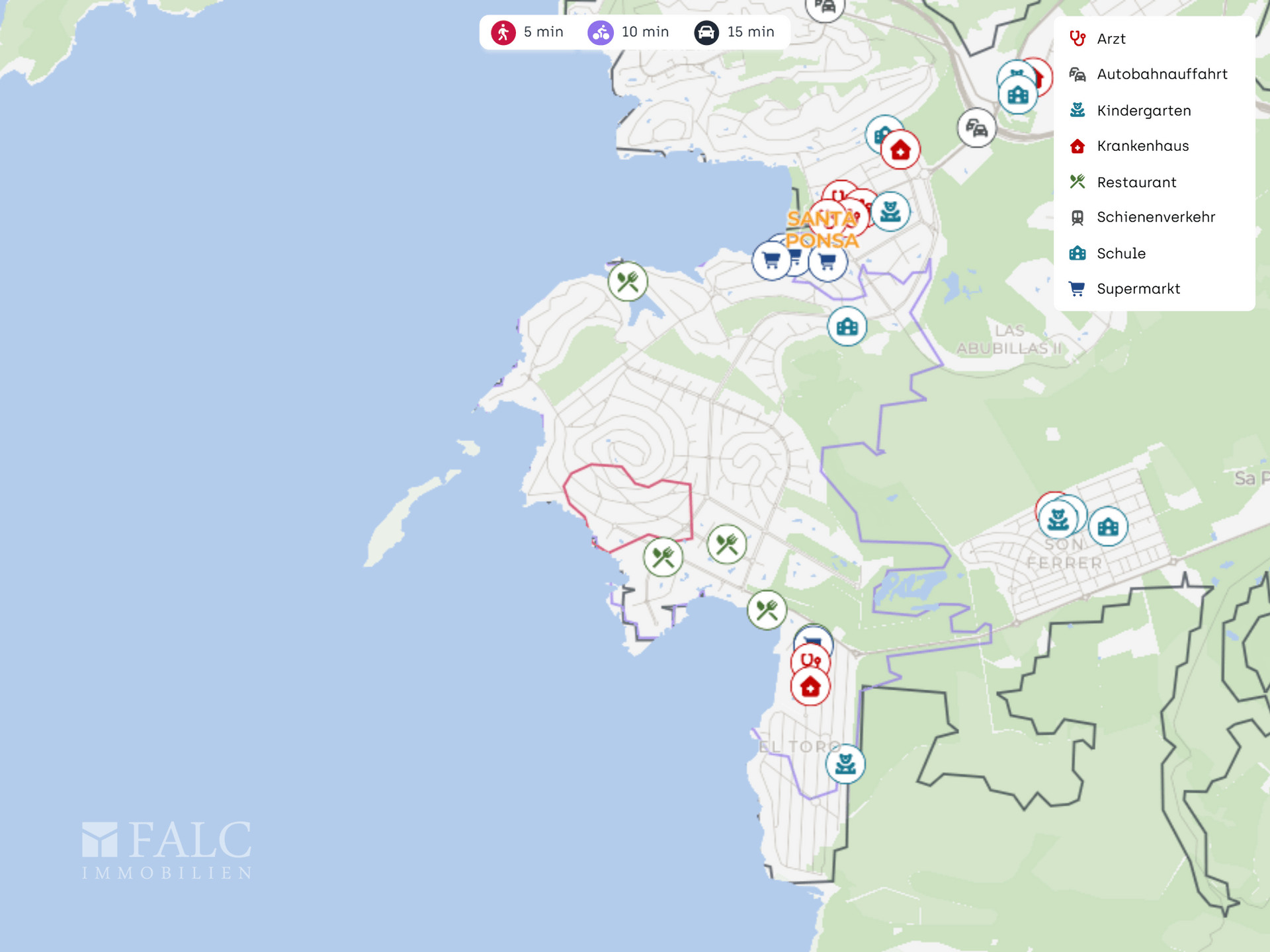 Ärztliche Anlaufstellen sind in der Nähe vorhanden, darunter das Deutsche Facharzt Zentrum sowie Juaneda. Für weiterführende Versorgung ist die Clínica Juaneda in der weiteren Umgebung erreichbar.
