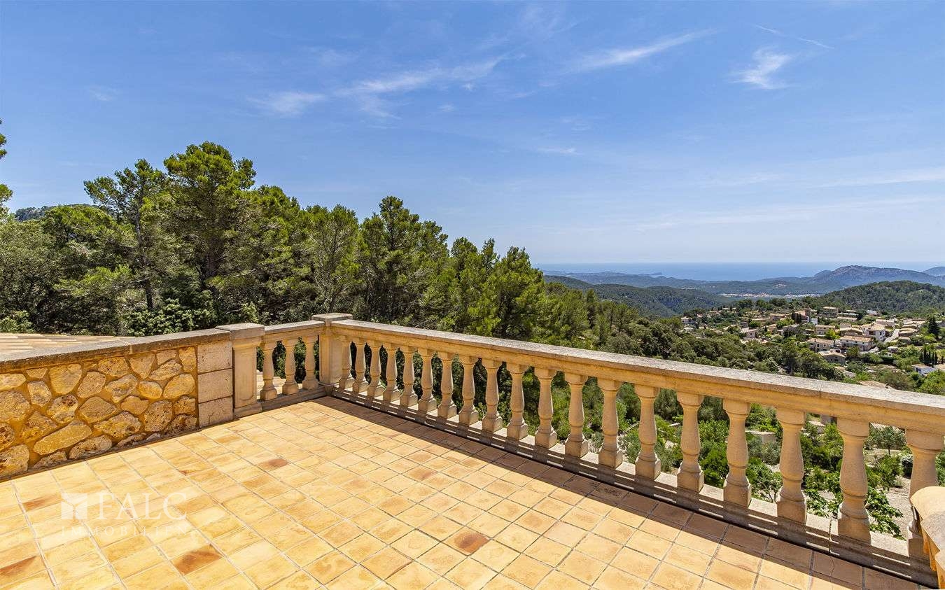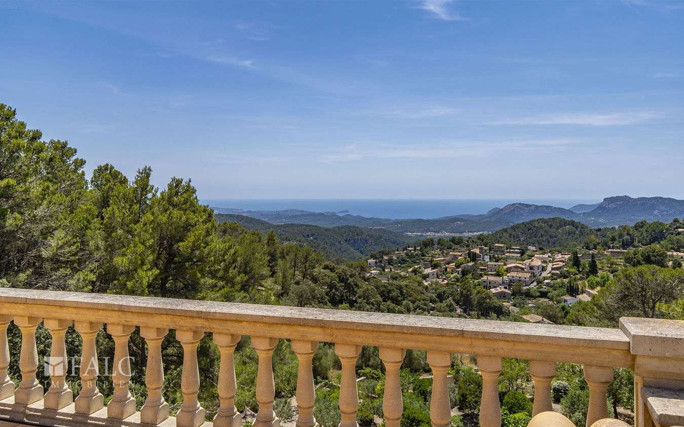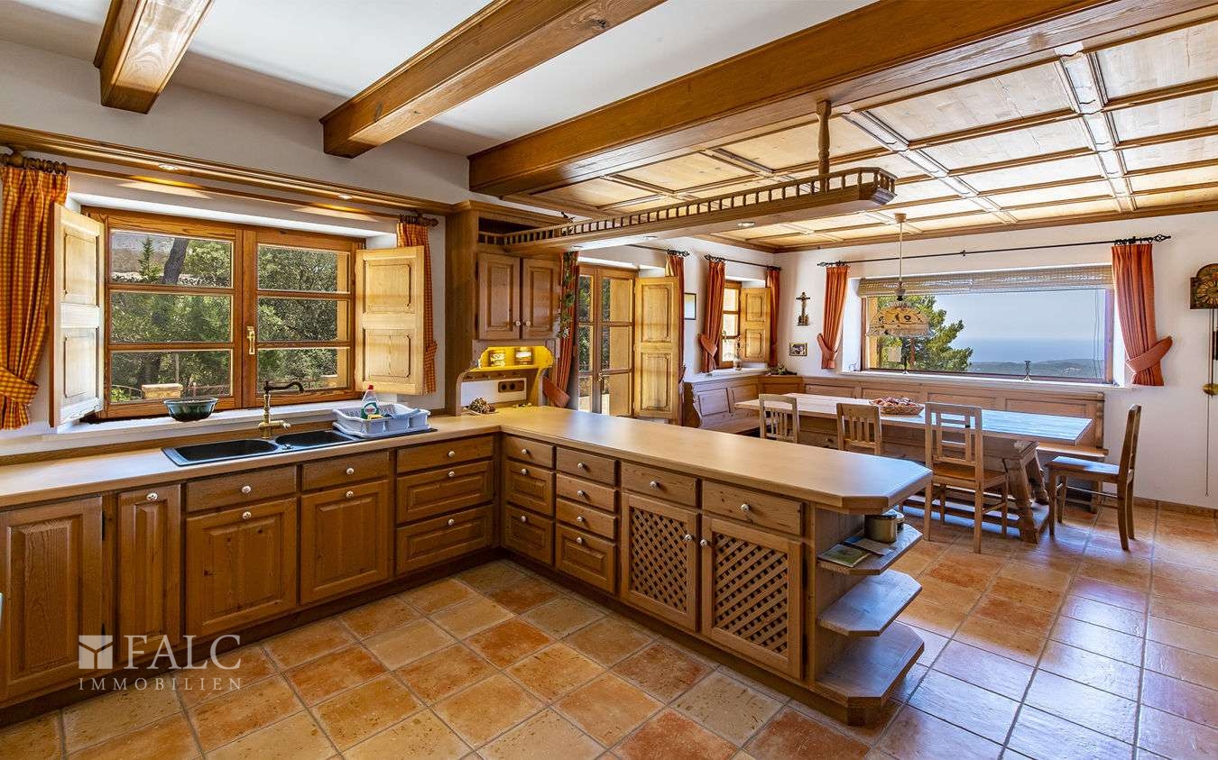 Die fantastische Finca in Galilea befindet sich auf höchster Lage des malerischen Dorfes, einer herrlichen Gegend des UNESCO-Welterbes Sierra de Tramontana. Die Süd/West Lage bietet einen fantastischen Berg-/ bzw. Panorama-Meerblick und bietet viel Helligkeit und Tageslicht bis zum Sonnenuntergang. Das einzigartige Objekt, mit ca. 631 m2 Wohnfläche, liegt auf einem ca. 4.795 m2 grossen Hanggrundstück und verteilt sich auf den Hauptwohnbereich und einen Gästeapartment. Hauptwohnbereich: Ein Eingangsbereich, eine offen, voll ausgestattete Küche mit Kochinsel, ein grosszügiger Wohn-Essbereich mit Zugang auf die Sonnenterrasse, eine Bibliothek mit Sitzmöglichkeiten, eine Gästetoilette, ein Abstellraum und ein Hauswirtschaftsraum. Im Obergeschoss befindet sich eine beeindruckende Mastersuite mit Zugang auf den Balkon und mit fantastischem Panorama-Meerblick, sowie ein Wohnzimmer und 2 weitere Doppelschlafzimmer en suite. Im Untergeschoss befindet sich ein originaler Ballett-Saal, ein Badezimmer, eine vorinstallierte Sauna, ein Indoor-Pool mit Vorinstallierung zum Beheizen des Pools, ein Abstellraum, ein Technikraum und Zugang zum Luftkeller. Das gemütliche Gäste-Apartment von ca. 50 m2, mit separatem Eingang, verteilt sich auf ein Wohnzimmer mit offener Küche und einen Schlafbereich. Die Lizenz zum Bau eines Aussenpools wurde bereits beantragt. Des Weiterem gibt es eine Fussbodenheizung, eine Öl-Zentralheizung und eine Garage für 2 Fahrzeug und mehrere Stellplätze. Galilea ist eine Ortschaft im Westen Mallorcas, die zur Gemeinde Puigpunyent gehört.