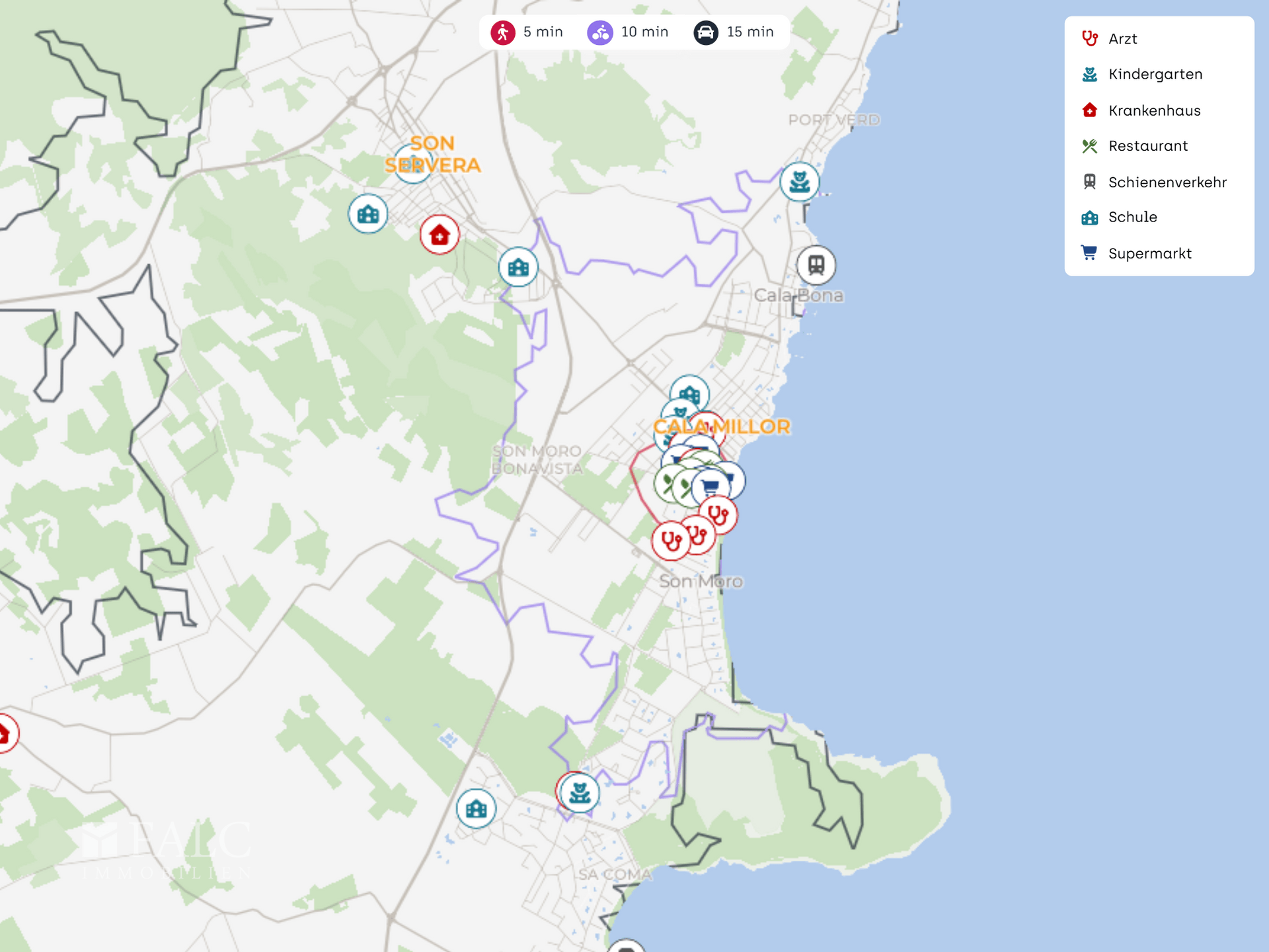 Ärztliche Versorgung ist in der Umgebung vorhanden. Für die Mobilität im Ort liegen die Bushaltestellen Plaça Mallorca und Av. Bon Temps in der Nähe. Auch für E Mobilität ist gesorgt, mehrere Ladepunkte sind im näheren Umfeld verfügbar. Mit dem Auto ist der Flughafen Palma de Mallorca in etwa einer Stunde erreichbar. Die Anbindung an die überregionale Hauptverbindung über die Ma 15 ist gut, sodass auch Ausflüge in andere Teile der Insel unkompliziert möglich sind.