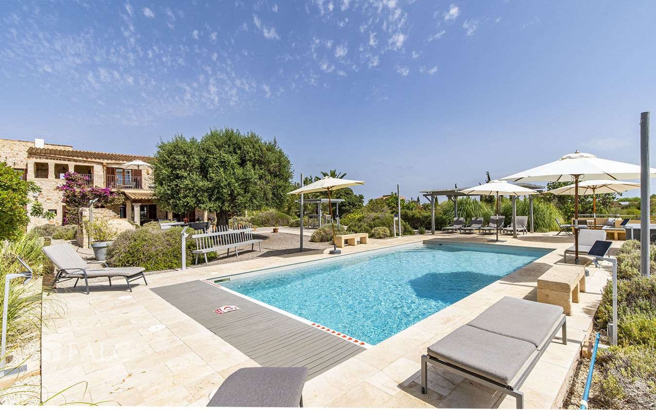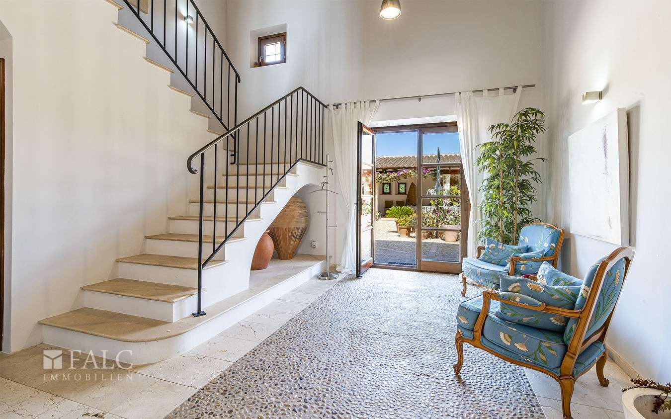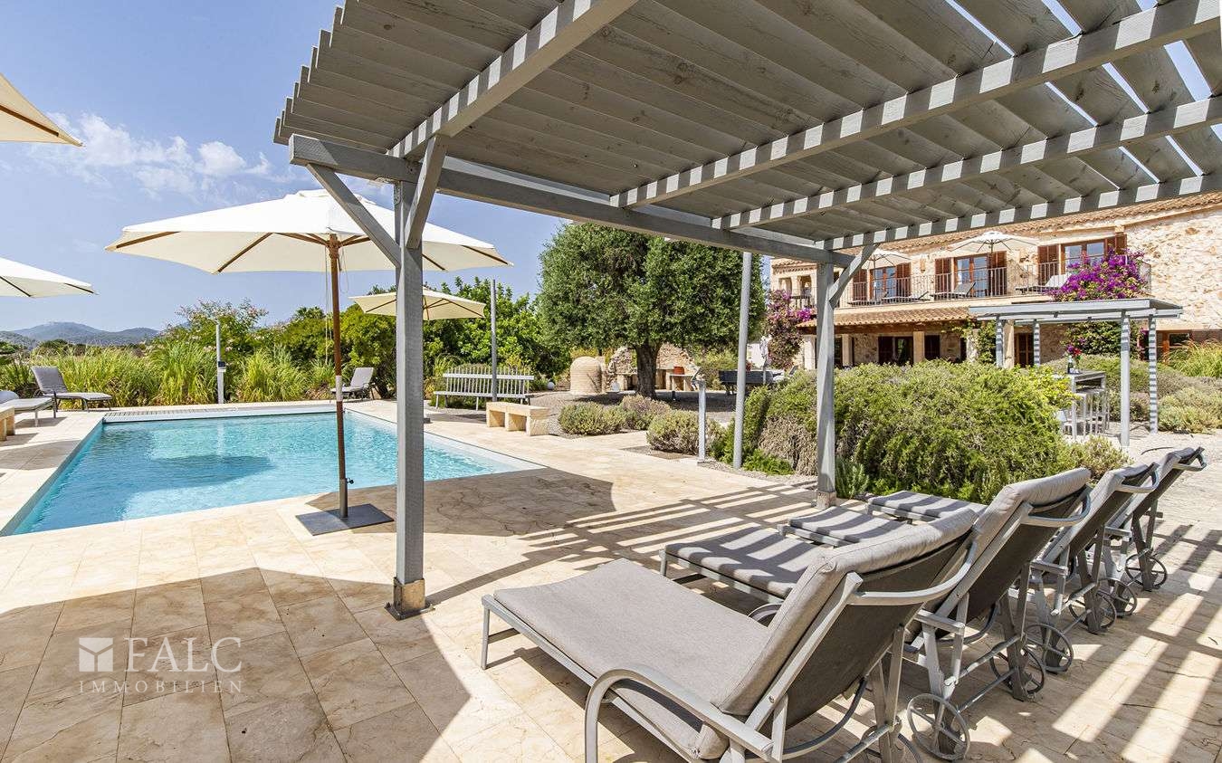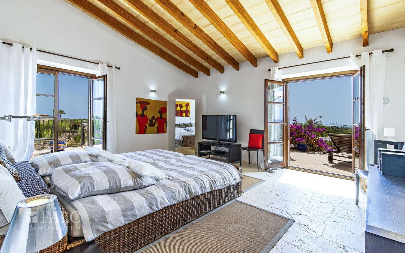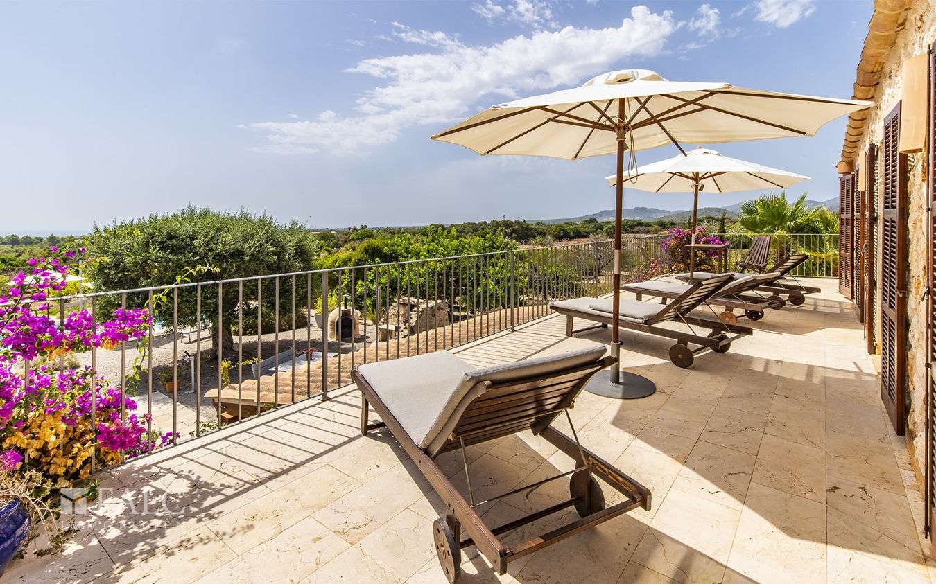 Diese wunderschöne Finca bei S'Espinagar mit Ferienvermietungslizenz für 12 Personen und beeindruckendem 180º Meer- und Berglick befindet sich im Südosten Mallorcas, unweit des malerischen Fischerhafens von Portocolom und dem bekannten Golfplatz - Vall d´Or Golf. Die traumhafte Immobilie besticht durch eine harmonische Gestaltung von modernem und klassischem mallorquinischen Baustil und verfügt über eine bebaute Fläche von ca. 500 m2, sowie ein herrliches Grundstück von ca. 18.600 m2. Die Finca wurde im Frühjahr komplett renoviert und bietet im Erdgeschoss einen hellen Wohn-/ Essbereich mit Kamin, eine komplett ausgestattete Küche, ein Schlafzimmer mit Badezimmer ensuite und ein Gäste-WC. Die erste Etage beeindruckt mit ihren restlichen 4 Schlafzimmern inklusive Ankleidezimmer und Bäder ensuite. Das Masterschlafzimmer hat einen zusätzlichen Salon, beide mit Balkon und wunderbarem Landschaftsweitblick. Ein Highlight dieser sonnigen Finca auf Mallorca ist der einladende Innenhof mit Sommerküche und Grillbereich, sowie der fantastische Aussenbereich, der neben einem gepflegten, mediterranen Garten mit Obstbäumen und einem neuen Pool, auch kleine Ruhezonen und eine tolle Aussenanlage mit Brotbackofen, Badmintonplatz, Tischtennis, Schach, sonnengeschütztem Kinderspielplatz, Trimmgeräten und Saunahaus bietet. Die Immobilie wird komplett möbliert und der gesamten Einrichtung verkauft und kann somit direkt nach Erwerb bezogen bzw. vermietet werden.