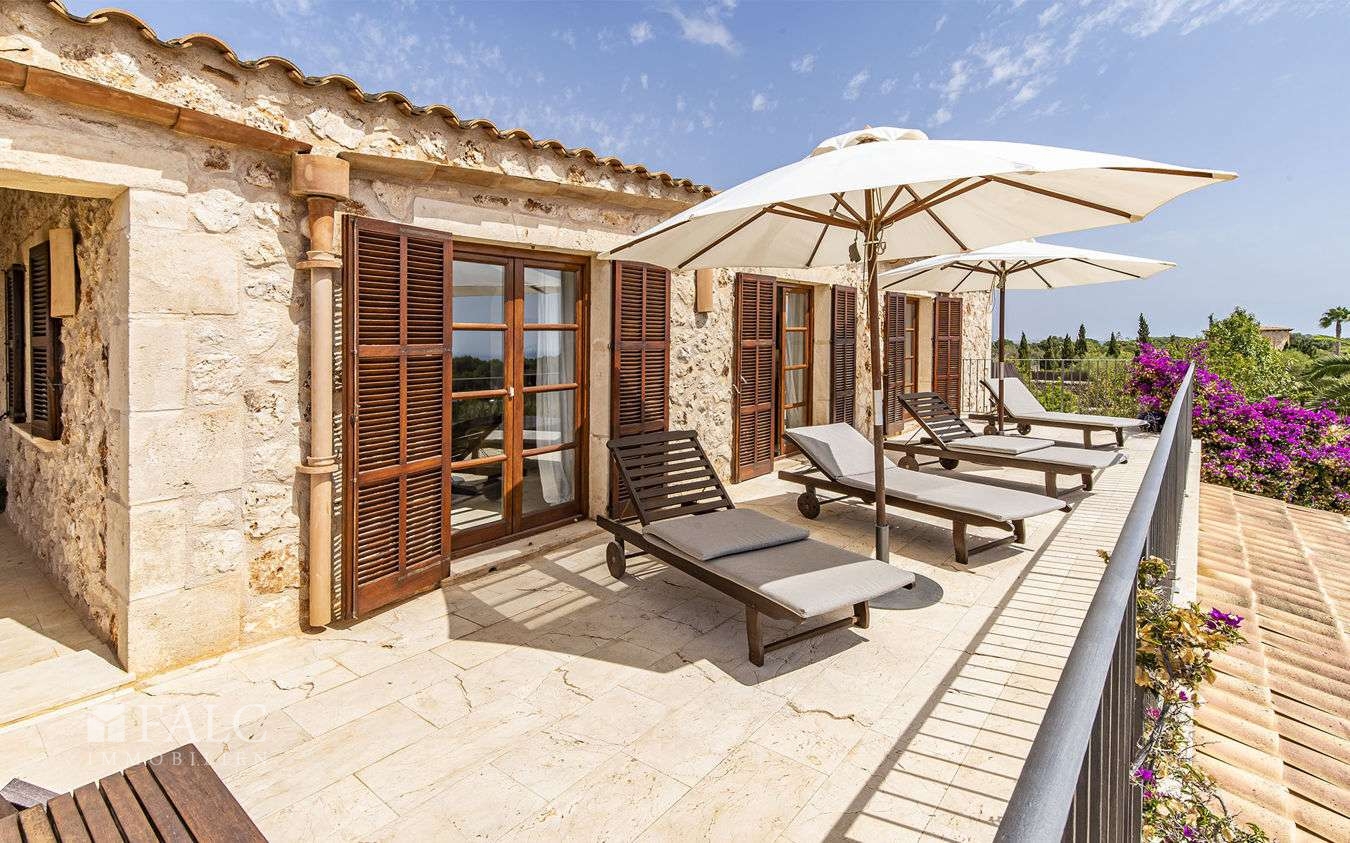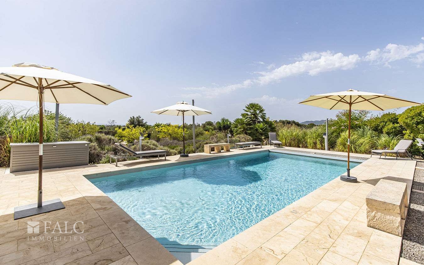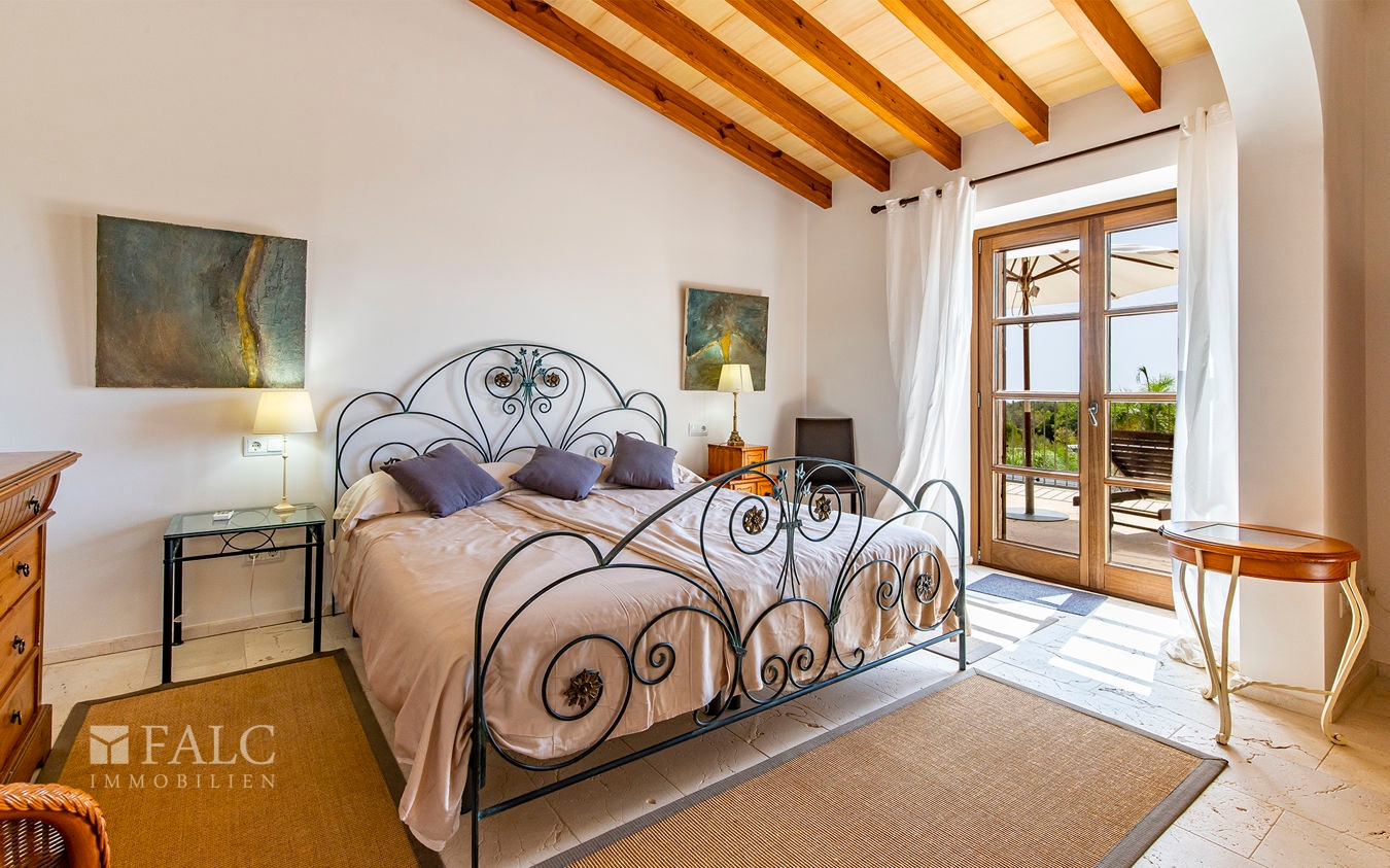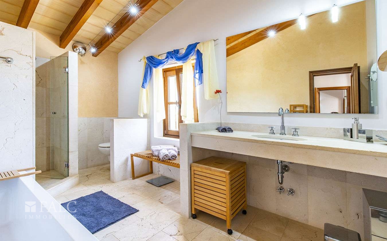 Diese wunderschöne Finca bei S'Espinagar mit Ferienvermietungslizenz für 12 Personen und beeindruckendem 180º Meer- und Berglick befindet sich im Südosten Mallorcas, unweit des malerischen Fischerhafens von Portocolom und dem bekannten Golfplatz - Vall d´Or Golf. Die traumhafte Immobilie besticht durch eine harmonische Gestaltung von modernem und klassischem mallorquinischen Baustil und verfügt über eine bebaute Fläche von ca. 500 m2, sowie ein herrliches Grundstück von ca. 18.600 m2. Die Finca wurde im Frühjahr komplett renoviert und bietet im Erdgeschoss einen hellen Wohn-/ Essbereich mit Kamin, eine komplett ausgestattete Küche, ein Schlafzimmer mit Badezimmer ensuite und ein Gäste-WC. Die erste Etage beeindruckt mit ihren restlichen 4 Schlafzimmern inklusive Ankleidezimmer und Bäder ensuite. Das Masterschlafzimmer hat einen zusätzlichen Salon, beide mit Balkon und wunderbarem Landschaftsweitblick. Ein Highlight dieser sonnigen Finca auf Mallorca ist der einladende Innenhof mit Sommerküche und Grillbereich, sowie der fantastische Aussenbereich, der neben einem gepflegten, mediterranen Garten mit Obstbäumen und einem neuen Pool, auch kleine Ruhezonen und eine tolle Aussenanlage mit Brotbackofen, Badmintonplatz, Tischtennis, Schach, sonnengeschütztem Kinderspielplatz, Trimmgeräten und Saunahaus bietet. Die Immobilie wird komplett möbliert und der gesamten Einrichtung verkauft und kann somit direkt nach Erwerb bezogen bzw. vermietet werden.