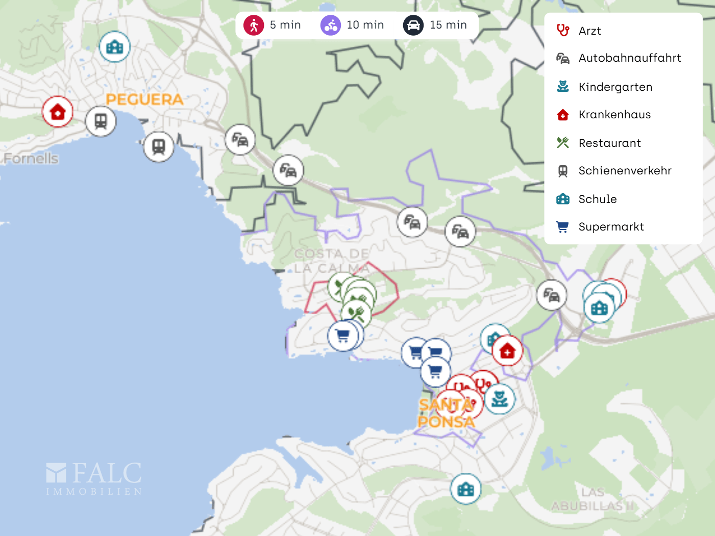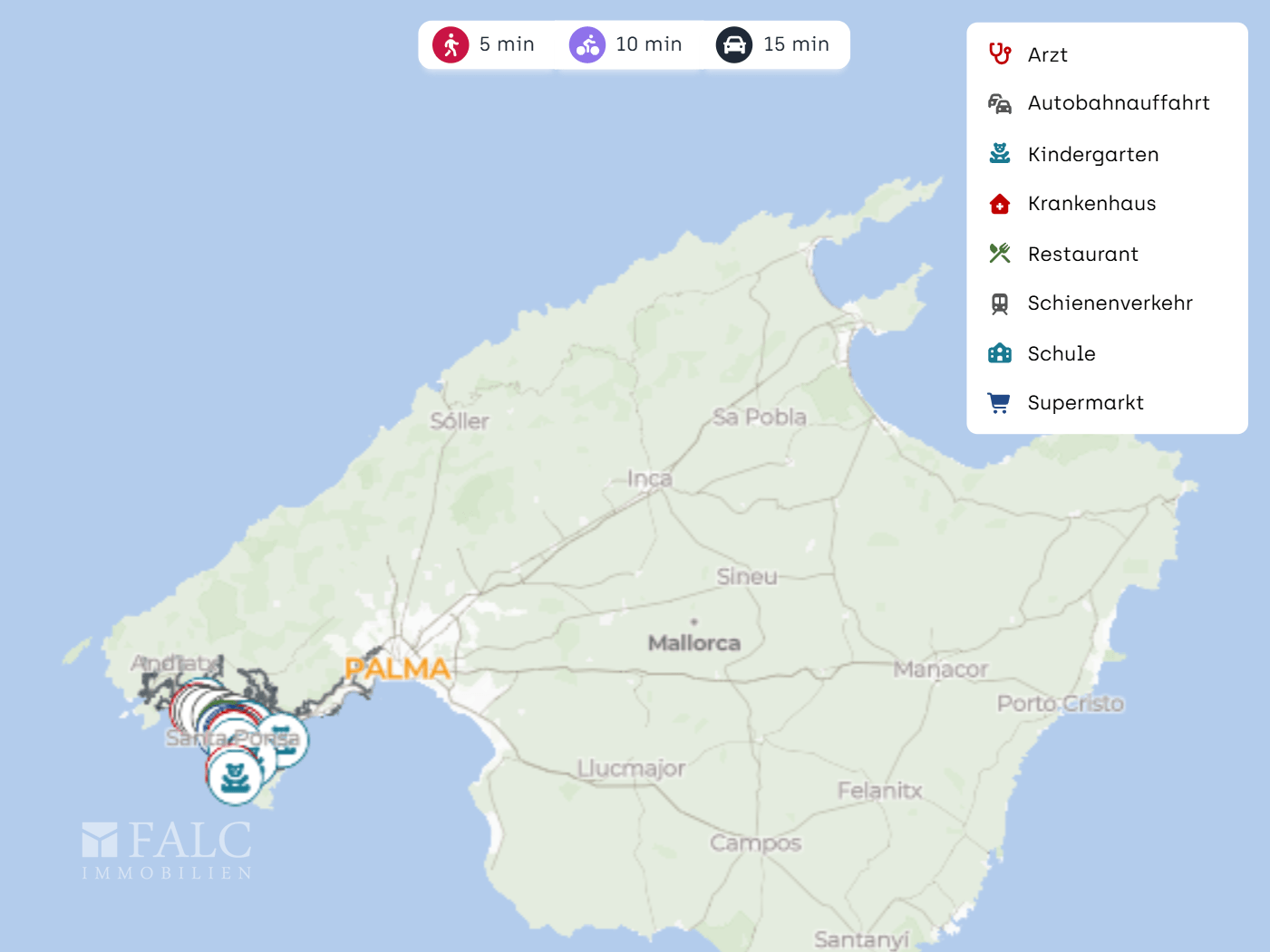 Die Immobilie liegt in Santa Ponça im Südwesten Mallorcas und verbindet entspanntes Küstenleben mit einer alltagstauglichen Infrastruktur. In der direkten Umgebung finden Sie vieles, was man im Alltag schätzt, ohne auf Urlaubsgefühl verzichten zu müssen.