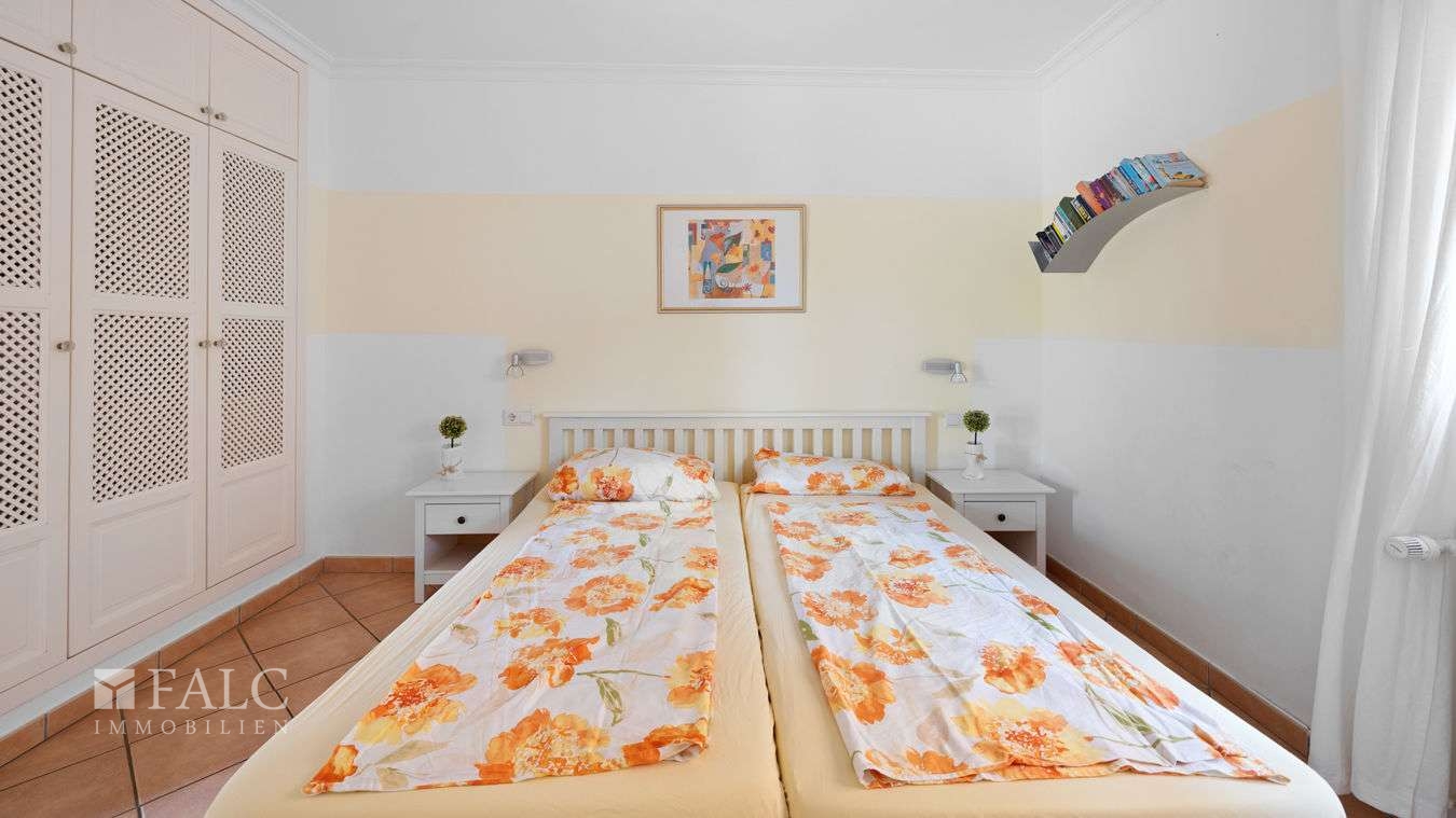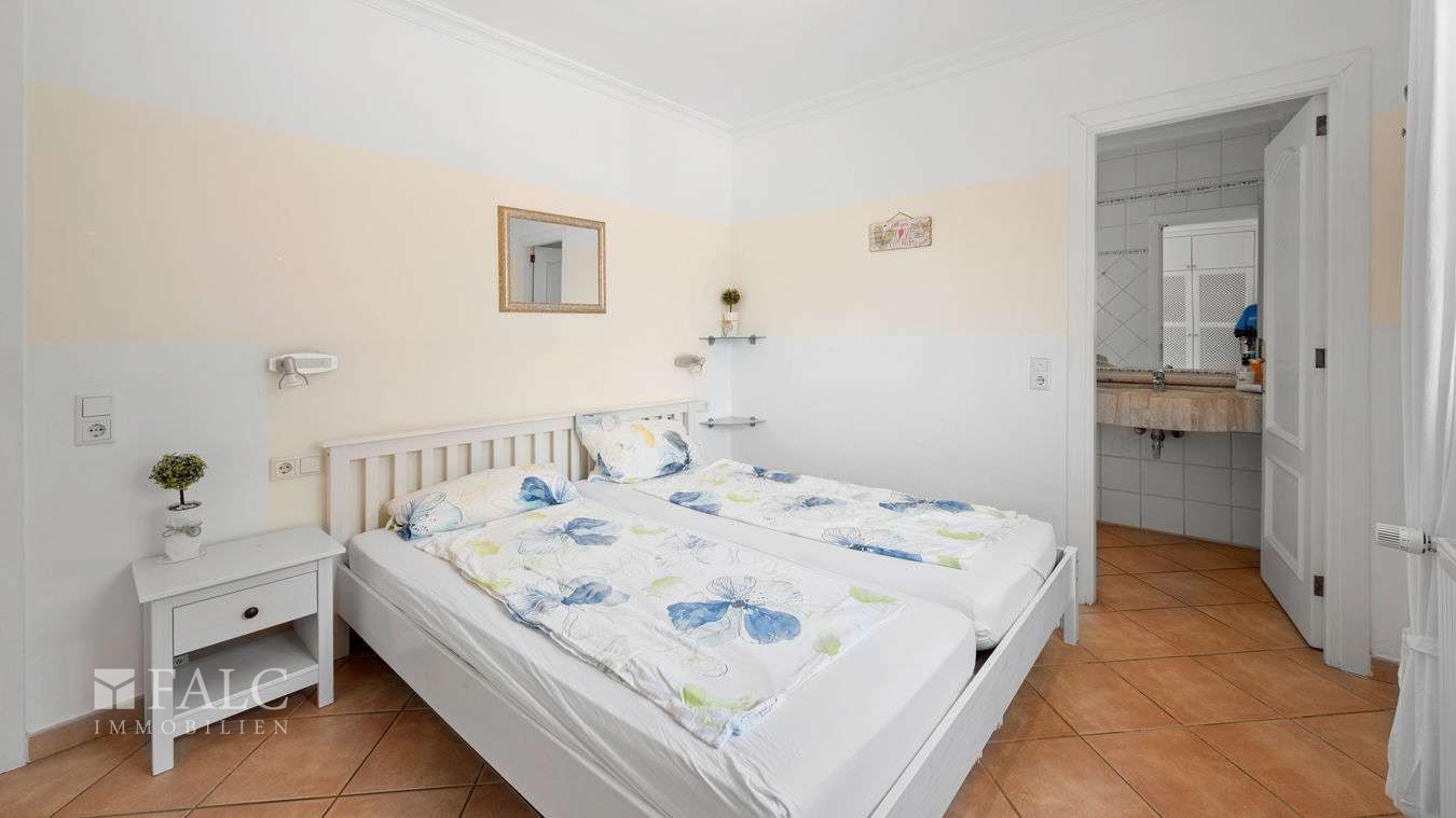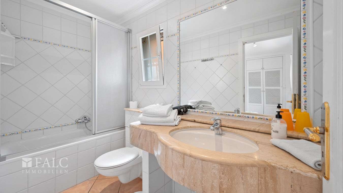 Nur 300 Meter vom belebten Boulevard mit einer Vielfalt an internationalen Restaurants, Geschäften und gemütlichen Bars entfernt und ganz in der Nähe zu 3 fantastischen Stränden mit kristallklarem Wasser, präsentieren wir dieses exklusive Immobilienangebot mit viel Potenzial in Paguera. Das Angebot besteht aus einer sonnigen, komplett möblierten Erdgeschosswohnung mit privatem Garten und einem separaten Gästestudio mit privater Terrasse. Zurzeit besteht das Erdgeschoss-Apartment noch aus 2 Einheiten, mit Garten- und Poolzugang, die durch eine Wand mit Tür getrennt sind. Ideal für grosse Familien oder 2 befreundete Ehepaare. Es kann aber auch ohne grossen Aufwand in ein geräumiges und lichtdurchflutetes 4-Schlafzimmer-Apartment umgewandelt werden. Die 2 Apartments bieten momentan jeweils einen attraktiven Wohn-/ Essbereich mit Zugang zum privaten und südlich ausgerichtetem Terrassen- und Gartenbereich, sowie dem Gemeinschaftspool mit BBQ-Bereich, eine amerikanische Küche, 2 Schlafzimmer mit Einbauschränken und 2 Bäder. Das separate Gästestudio, könnte idealerweise auch vermietet werden und besteht aus einem offenen Wohn-/ Schlafbereich, einer amerikanischen Küche und ein Badezimmer. Extras: Komplett möbliert, Öl-Zentralheizung, doppelt verglaste Aluminiumfenster mit Rollläden, Fliegengitter, ein Pkw-Stellplatz. Diese fantastischen Wohnungen in Paguera sind Teil eines ruhigen Mehrfamilienhauses mit nur 4 Wohneinheiten in unmittelbarer Strandnähe. Paguera, in der Gemeinde Calviá, besticht durch eine unverbesserliche Lage zwischen Santa Ponsa, Camp de Mar und Puerto Andratx.