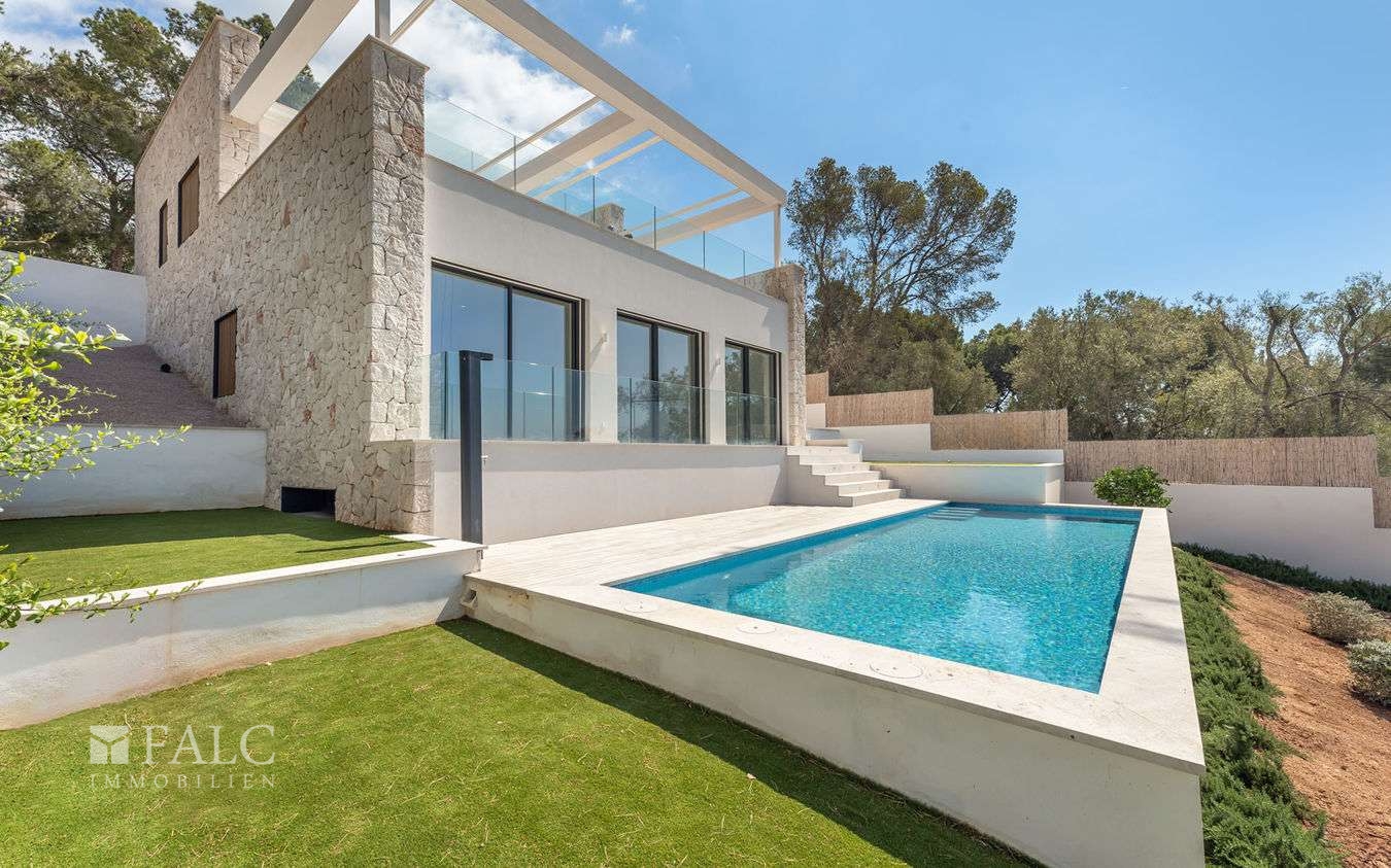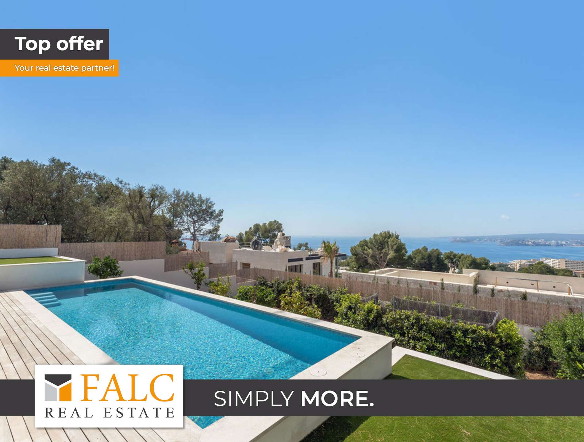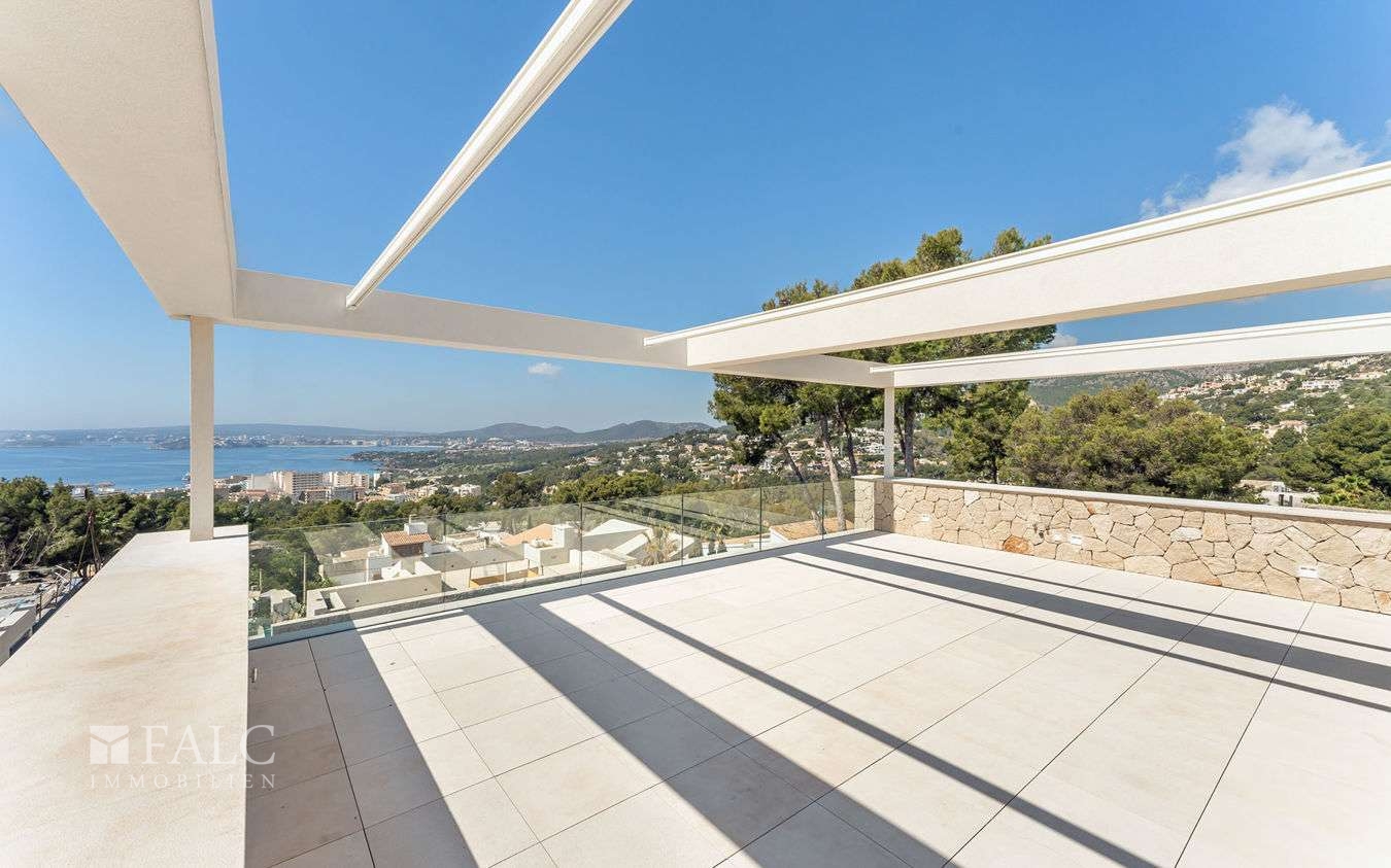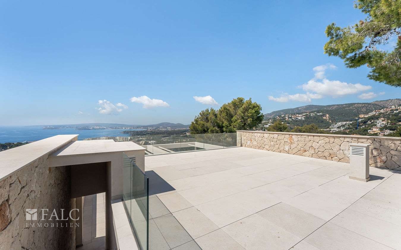 Im gefragten Südwesten Mallorcas gelegen, präsentieren wir Ihnen diese traumhafte Neubauvilla in Portals Nous mit herrlichem Blick über die Küste und das funkelnde Mittelmeer. Diese nach Süden ausgerichtete Luxus-Immobilie liegt auf einem ca. 679 m2 grossen Grundstück und bietet eine geräumige bebaute Fläche von ca. 351 m2 die sich folgendermassen verteilt: Einen lichtdurchfluteten, offenen Wohn-/ Essbereich mit Zugang zur einzigartigen Meerblickterrasse und dem erfrischenden Pool, eine moderne und vollausgestattete Küche, 4 Schlafzimmer mit Einbauschränken und 4 Bäder en suite. Die Villa ist mit mediterranen Bauelementen auf moderne Art und Weise ausgestattet, was sie sehr stilvoll macht, aber auch ein heimeliges Gefühl vermittelt und in Kombination mit der neuesten Technologie maximalen Wohnkomfort bietet. Das Haus ist so konzipiert, dass es möglichst viel natürliches Licht erhält und bietet einen atemberaubenden Meerblick, der eine ruhige und gelassene Atmosphäre schafft. Zusätzlich gibt es ein Untergeschoss mit genügend Platz für ein weiteres Schlafzimmer, einen Fitnessraum, ein Büro oder ein Spielzimmer. Extras: Klimaanlage, Fussboden- und Zentralheizung, doppelt verglaste Aluminiumfenster, Carport für 2 Fahrzeuge und vieles mehr.