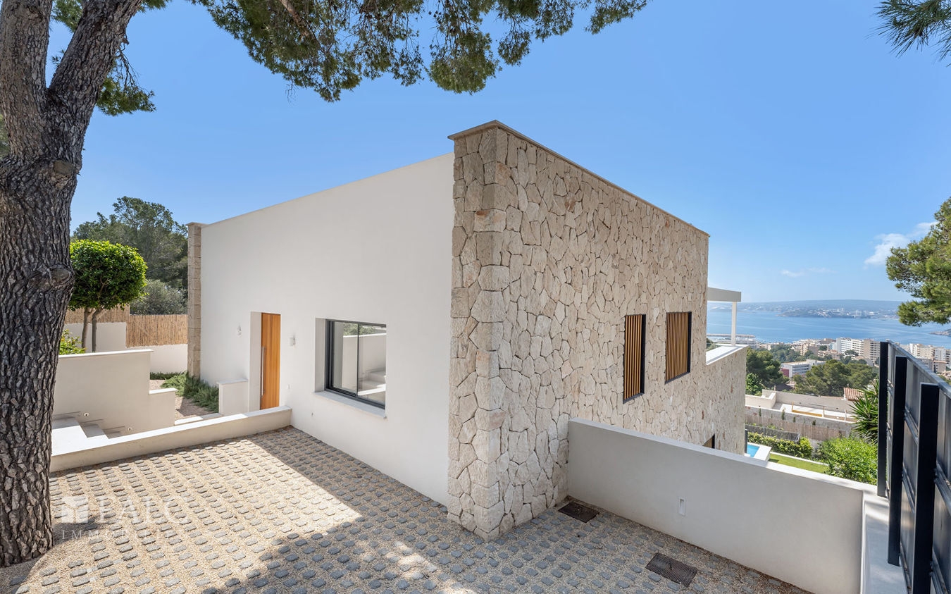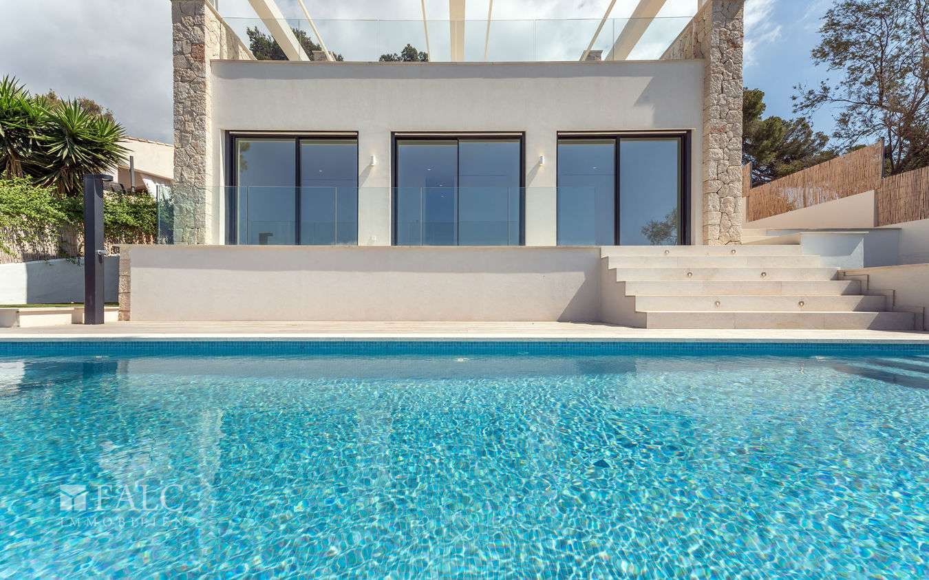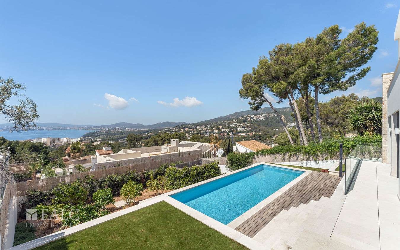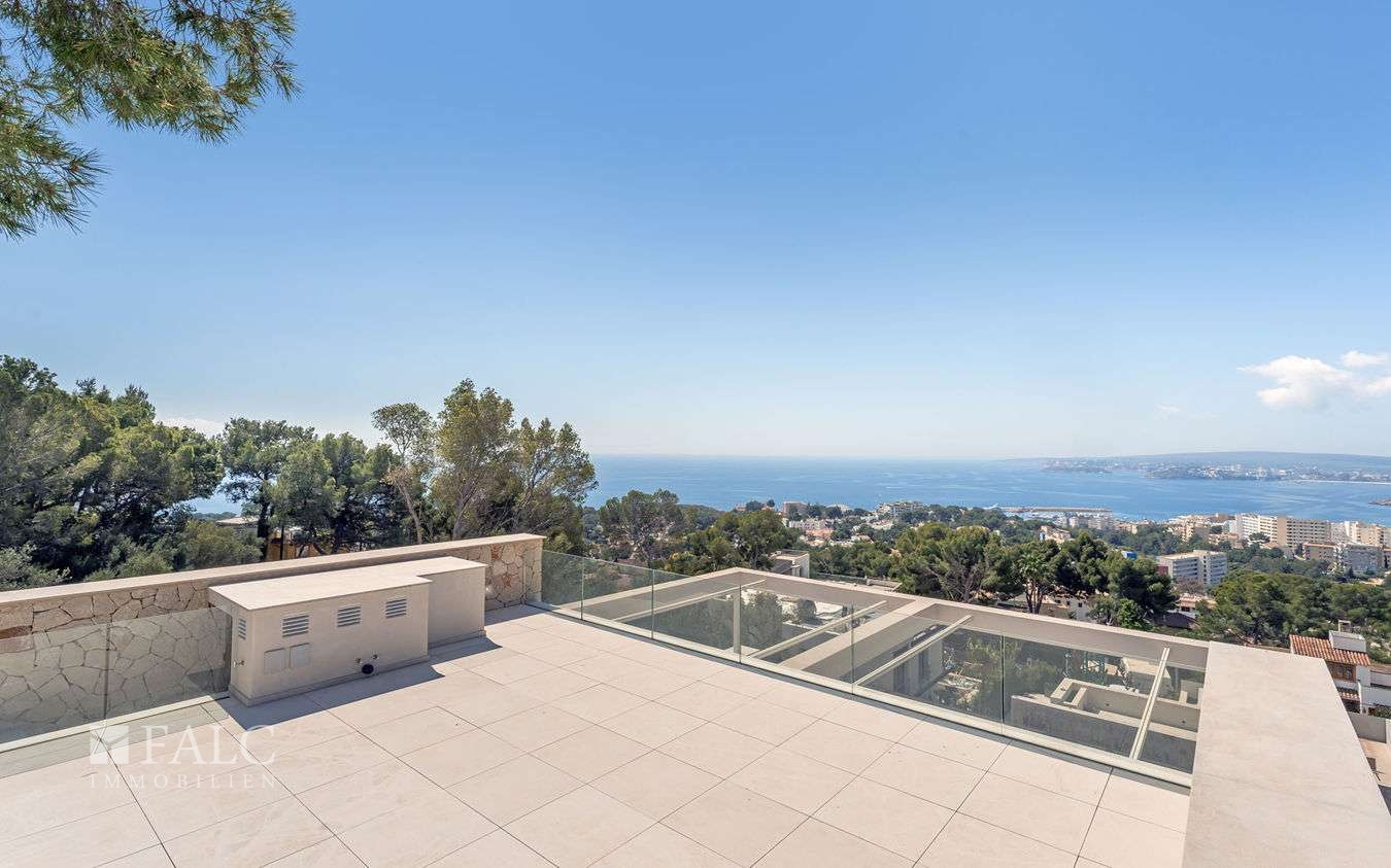 Im gefragten Südwesten Mallorcas gelegen, präsentieren wir Ihnen diese traumhafte Neubauvilla in Portals Nous mit herrlichem Blick über die Küste und das funkelnde Mittelmeer. Diese nach Süden ausgerichtete Luxus-Immobilie liegt auf einem ca. 679 m2 grossen Grundstück und bietet eine geräumige bebaute Fläche von ca. 351 m2 die sich folgendermassen verteilt: Einen lichtdurchfluteten, offenen Wohn-/ Essbereich mit Zugang zur einzigartigen Meerblickterrasse und dem erfrischenden Pool, eine moderne und vollausgestattete Küche, 4 Schlafzimmer mit Einbauschränken und 4 Bäder en suite. Die Villa ist mit mediterranen Bauelementen auf moderne Art und Weise ausgestattet, was sie sehr stilvoll macht, aber auch ein heimeliges Gefühl vermittelt und in Kombination mit der neuesten Technologie maximalen Wohnkomfort bietet. Das Haus ist so konzipiert, dass es möglichst viel natürliches Licht erhält und bietet einen atemberaubenden Meerblick, der eine ruhige und gelassene Atmosphäre schafft. Zusätzlich gibt es ein Untergeschoss mit genügend Platz für ein weiteres Schlafzimmer, einen Fitnessraum, ein Büro oder ein Spielzimmer. Extras: Klimaanlage, Fussboden- und Zentralheizung, doppelt verglaste Aluminiumfenster, Carport für 2 Fahrzeuge und vieles mehr.