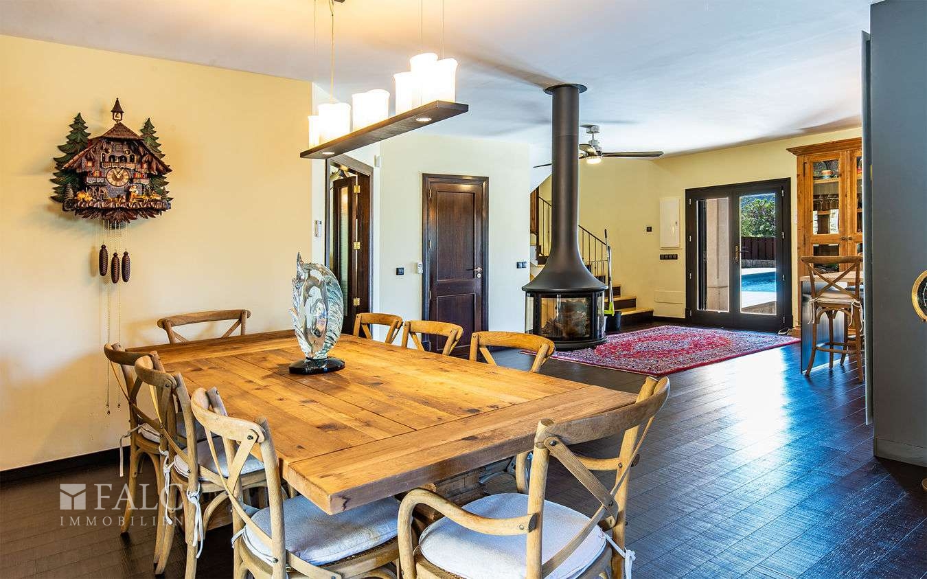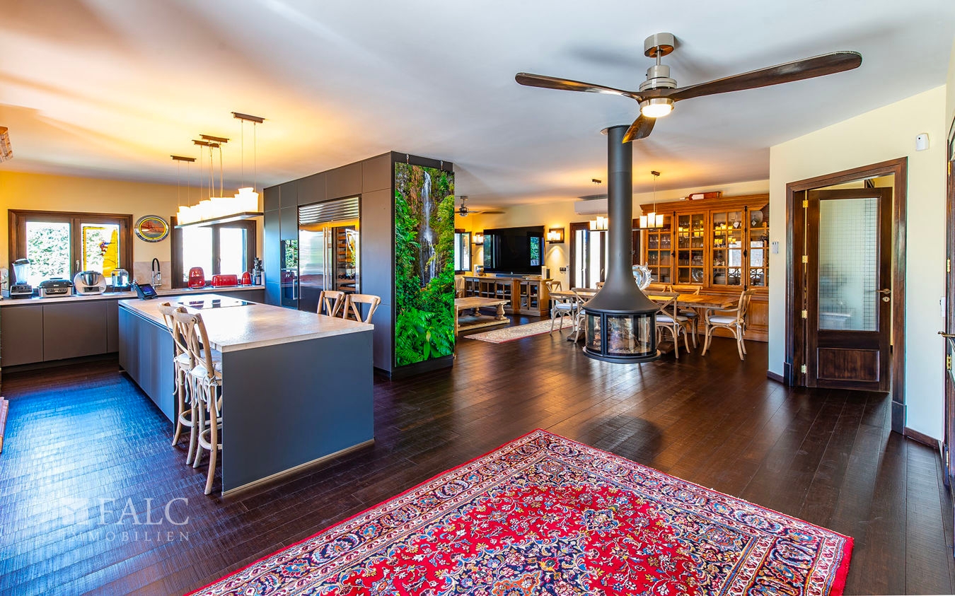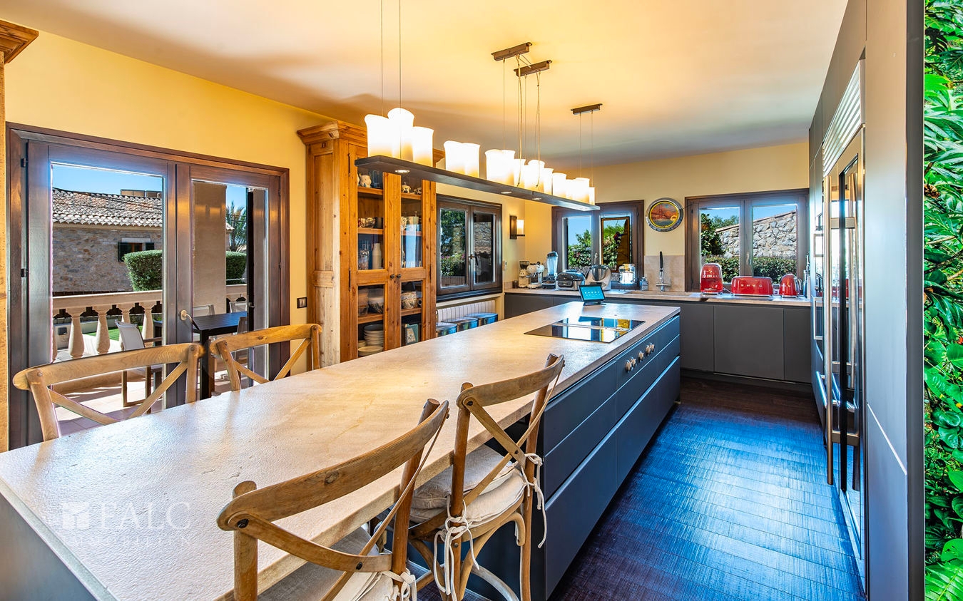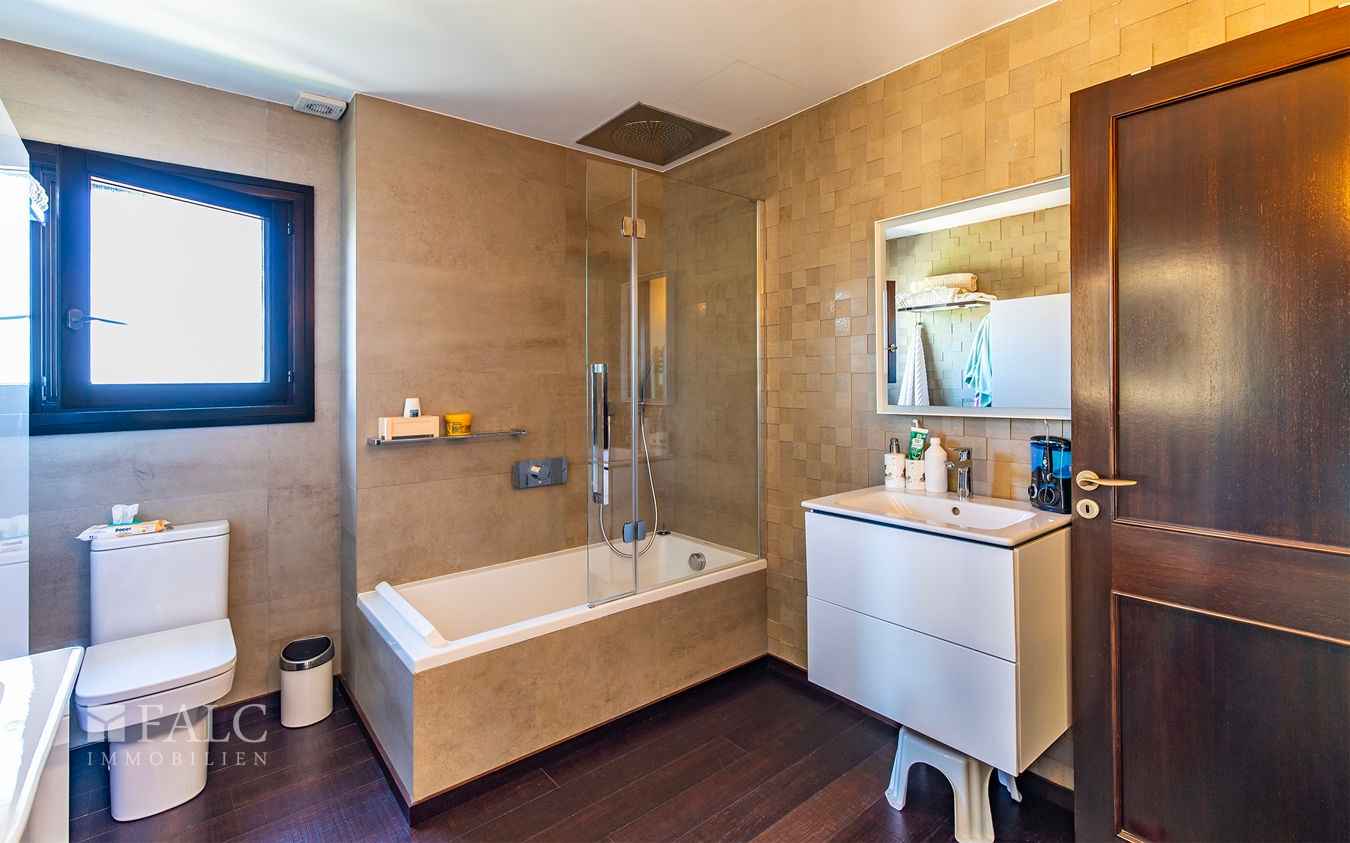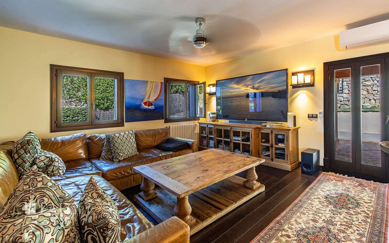 Diese beeindruckende Familienvilla in Calvia befindet sich in einem der schönsten und ältesten Dörfer an der Küste Mallorcas am Fusse des Tramuntanagebirges. Auf einem ca. 943 m2 grossen Grundstück mit Südausrichtung gelegen, verfügt dieses wunderbare, gepflegte Objekt über eine bebaute Fläche von ca. 289 m2, verteilt auf 3 gemütliche und funktionale Etagen, sowie mehrere herrliche Terrassen um die Ruhe und Natur zu geniessen, eine davon sogar mit Meerblick. Die charmante Immobilie ist in einem typisch mallorquinischen/mediterranen Stil gehalten und bietet die neuesten Trends in Sachen Design und modernen Komfort. Das geräumige Wohn-Esszimmer verfügt über einen einzigartigen hängenden Kamin, und die geräumige offene Küche ist komplett ausgestattet, darüber hinaus gibt es 4 grosse Doppelschlafzimmer, 3 moderne Badezimmer (eines en suite und eines wird von 2 Schlafzimmern geteilt), ein Büro, einen grossen voll ausgestatteten Fitnessbereich, eine Garage und Parkplätze. Der fabelhafte Aussenbereich mit einem gut gepflegten und pflegeleichten Garten ist ein wahres Paradies für Kinder und bietet einen Spielplatz, einen Basketballplatz, eine Kletterwand und eine Seilrutsche. Des Weiteren lädt ein schöner Süsswasserpool mit Ruhebereich und einem Whirlpool für 4 Personen zum Verweilen und Entspannen ein. Weitere Ausstattungsmerkmale: Sonnenkollektoren, Parkettboden, Klimaanlage warm/kalt, Elektroheizung, ein Garagenplatz, Stellplätze für mehrere Fahrzeuge und vieles mehr. Diese schöne Villa in ruhiger Umgebung und von Natur umgeben, wird komplett möbliert angeboten.