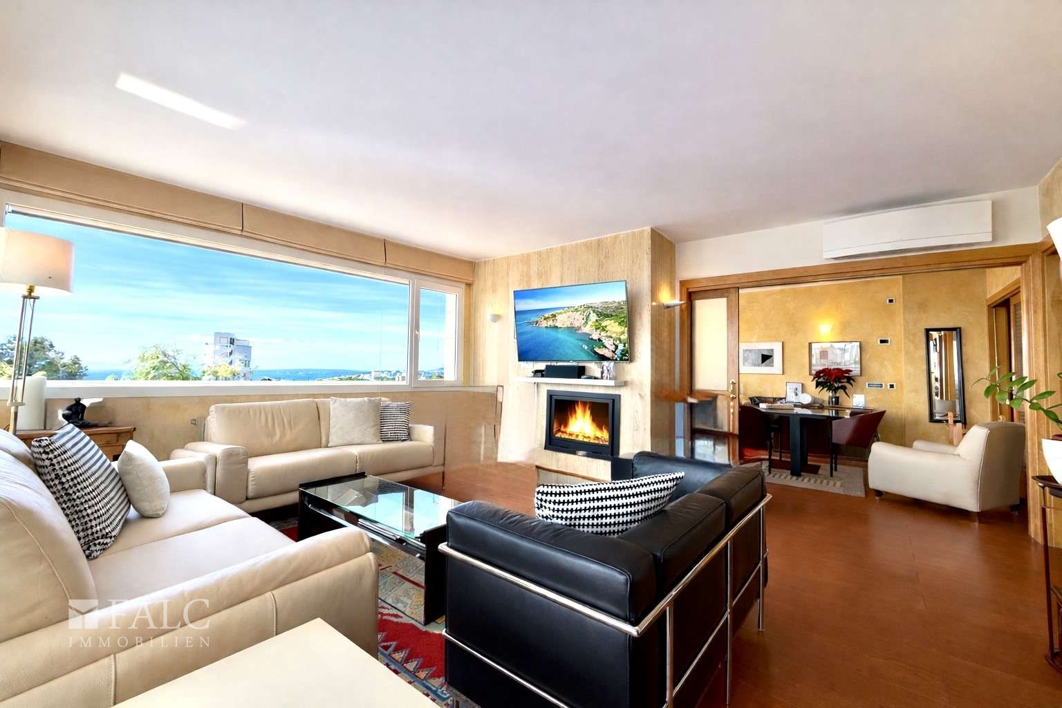 Auf einer bebauten Fläche von ca. 187 m² entfaltet sich ein durchdachtes Raumkonzept mit klarer Struktur und harmonischer Trennung zwischen Wohn- und Schlafbereichen. Das stilvolle Wohnzimmer mit Kamin bildet das Herzstück der Wohnung und öffnet sich zur großzügigen Hauptterrasse in bevorzugter Südost-Ausrichtung. Diese sorgt für angenehme Lichtverhältnisse vom Morgen bis in die frühen Nachmittagsstunden und schafft eine helle, einladende Atmosphäre mit weitem Meerblick.