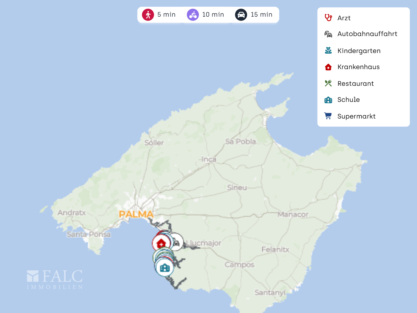 Die nächste Bushaltestelle liegt fußläufig in ca. 5 Minuten Entfernung und sorgt für eine alltagstaugliche Verbindung in die umliegenden Orte. Mit dem Auto erreichen Sie Palma de Mallorca je nach Verkehr in etwa 25 bis 30 Minuten. Der Flughafen Palma de Mallorca ist ebenfalls in rund 20 bis 30 Minuten erreichbar und macht die Lage auch für Pendler und Zweitwohnsitznutzer attraktiv. Die nächste Bahnanbindung befindet sich im Raum Palma und ist mit dem Auto in etwa 25 bis 35 Minuten erreichbar.