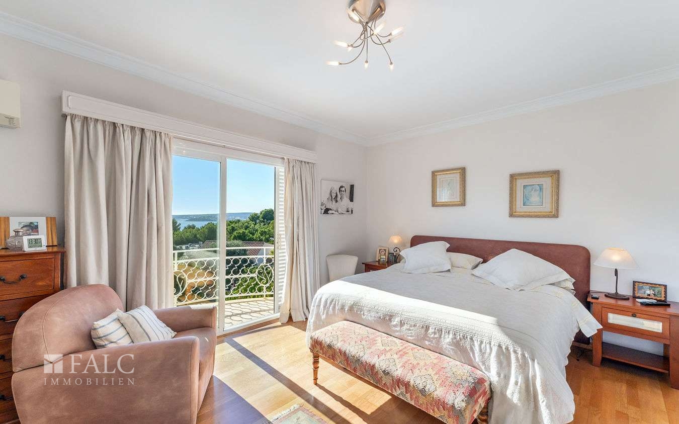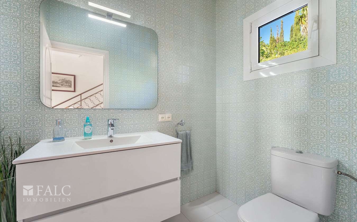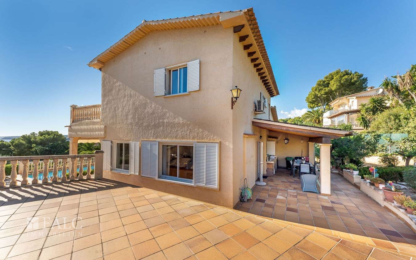 In einer eleganten Wohngegend in der Gemeinde Calviá gelegen, präsentieren wir Ihnen diese wunderschöne Villa in Costa d'en Blanes mit teilweisem Meerblick und einem erfrischenden Swimmingpool. Die Immobilie verfügt über eine bebaute Fläche von ca. 422 m2 und einen gut durchdachten Grundriss, der sich über zwei Ebenen erstreckt und eine optimale Ausrichtung und Konfiguration bietet. Das lichtdurchflutete Erdgeschoss bietet ein gemütliches Wohnzimmer mit Kamin und eine voll ausgestattete Küche, die nahtlos an die einladende Veranda anschliesst, ein komfortables Schlafzimmer mit eigenem Bad, eine Gäste-Toilette und einen Hauswirtschaftsraum. Das obere Stockwerk überzeugt mit 3 weiteren charmanten Schlafzimmern mit atemberaubendem Meerblick. Darüber hinaus verfügt die Immobilie über ein individuelles Gästeapartment (Wohnküche, Schlafzimmer, Bad) und eine geräumige Garage mit ausreichend Platz für bis zu 3 Fahrzeugen. Der wunderschön angelegte Aussenbereich lädt zum Entspannen ein und umfasst einen gepflegten Garten mit einem erfrischenden Swimmingpool. Weitere Ausstattungsmerkmale: Holzboden, Zentralheizung, Kliaanlage, doppelt verglaste Fenster, Einbauschränke und vieles mehr. Costa d'en Blanes ist ein nobles Villengebiet oberhalb des Superyachthafens von Puerto Portals. In unmittelbarer Nähe befinden sich eine Vielzahl von Restaurants, feine Sandstrände und angesehene Schulen. Die Inselhaupstadt Palma ist nur 12 km entfernt.