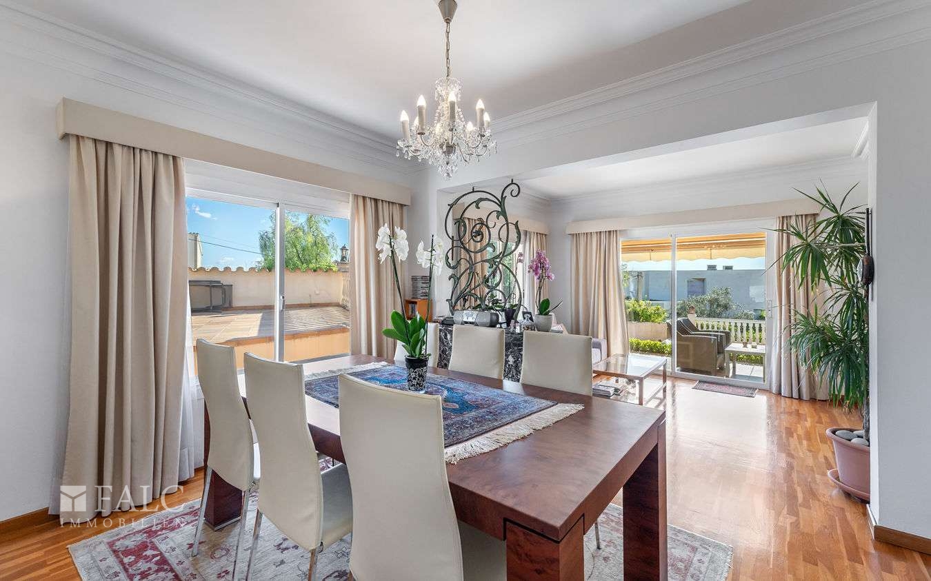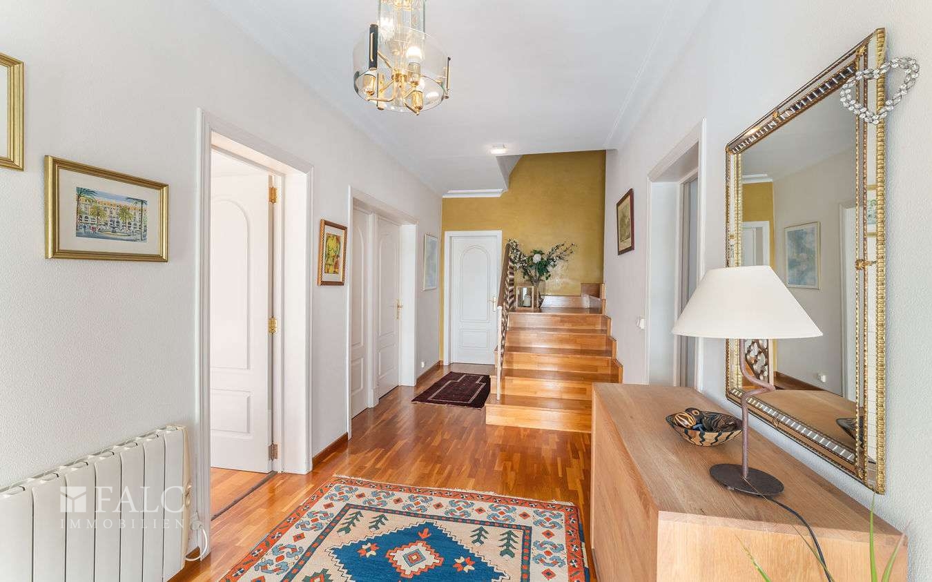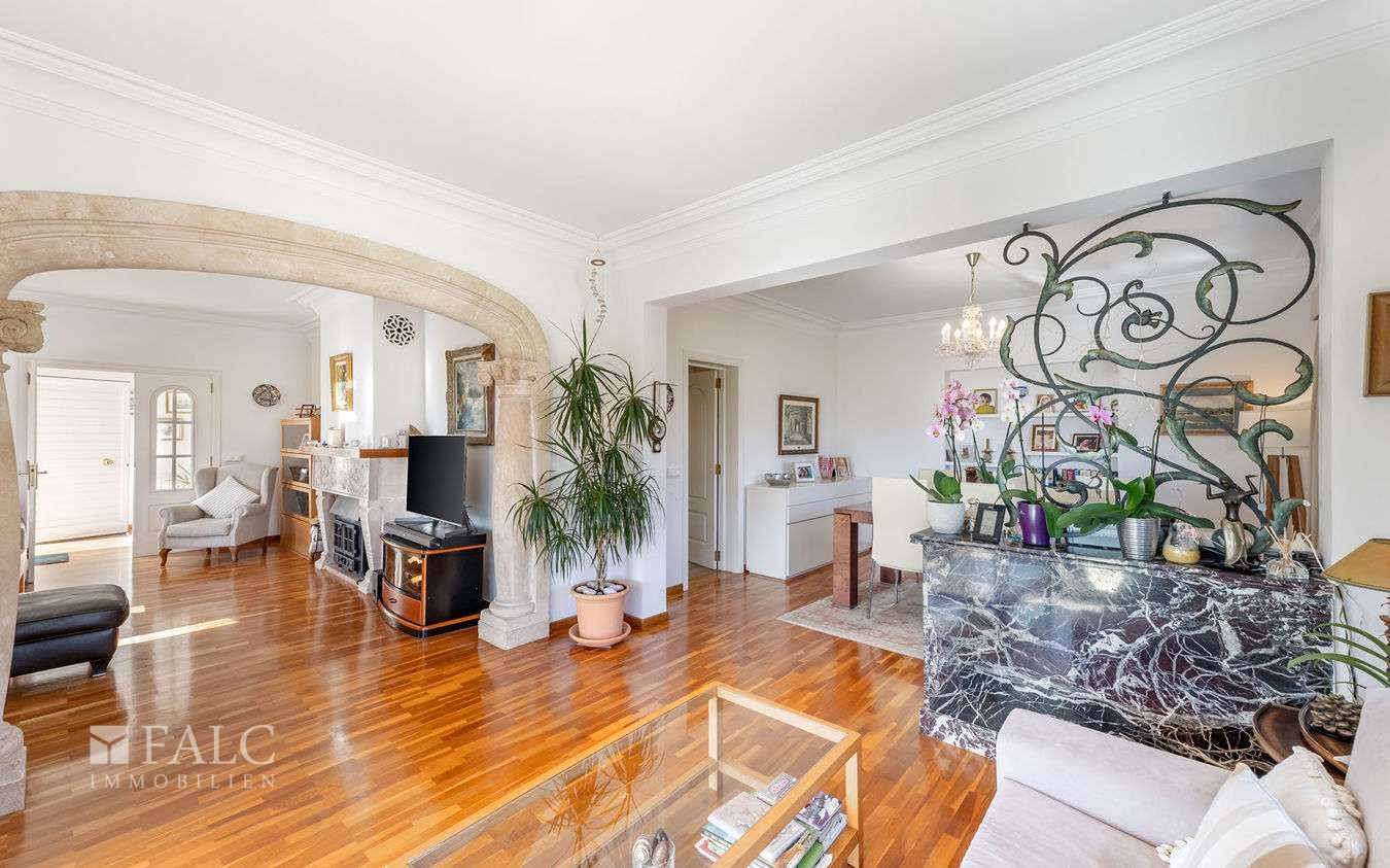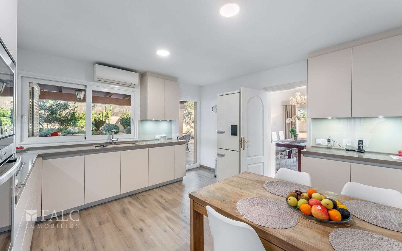 In einer eleganten Wohngegend in der Gemeinde Calviá gelegen, präsentieren wir Ihnen diese wunderschöne Villa in Costa d'en Blanes mit teilweisem Meerblick und einem erfrischenden Swimmingpool. Die Immobilie verfügt über eine bebaute Fläche von ca. 422 m2 und einen gut durchdachten Grundriss, der sich über zwei Ebenen erstreckt und eine optimale Ausrichtung und Konfiguration bietet. Das lichtdurchflutete Erdgeschoss bietet ein gemütliches Wohnzimmer mit Kamin und eine voll ausgestattete Küche, die nahtlos an die einladende Veranda anschliesst, ein komfortables Schlafzimmer mit eigenem Bad, eine Gäste-Toilette und einen Hauswirtschaftsraum. Das obere Stockwerk überzeugt mit 3 weiteren charmanten Schlafzimmern mit atemberaubendem Meerblick. Darüber hinaus verfügt die Immobilie über ein individuelles Gästeapartment (Wohnküche, Schlafzimmer, Bad) und eine geräumige Garage mit ausreichend Platz für bis zu 3 Fahrzeugen. Der wunderschön angelegte Aussenbereich lädt zum Entspannen ein und umfasst einen gepflegten Garten mit einem erfrischenden Swimmingpool. Weitere Ausstattungsmerkmale: Holzboden, Zentralheizung, Kliaanlage, doppelt verglaste Fenster, Einbauschränke und vieles mehr. Costa d'en Blanes ist ein nobles Villengebiet oberhalb des Superyachthafens von Puerto Portals. In unmittelbarer Nähe befinden sich eine Vielzahl von Restaurants, feine Sandstrände und angesehene Schulen. Die Inselhaupstadt Palma ist nur 12 km entfernt.