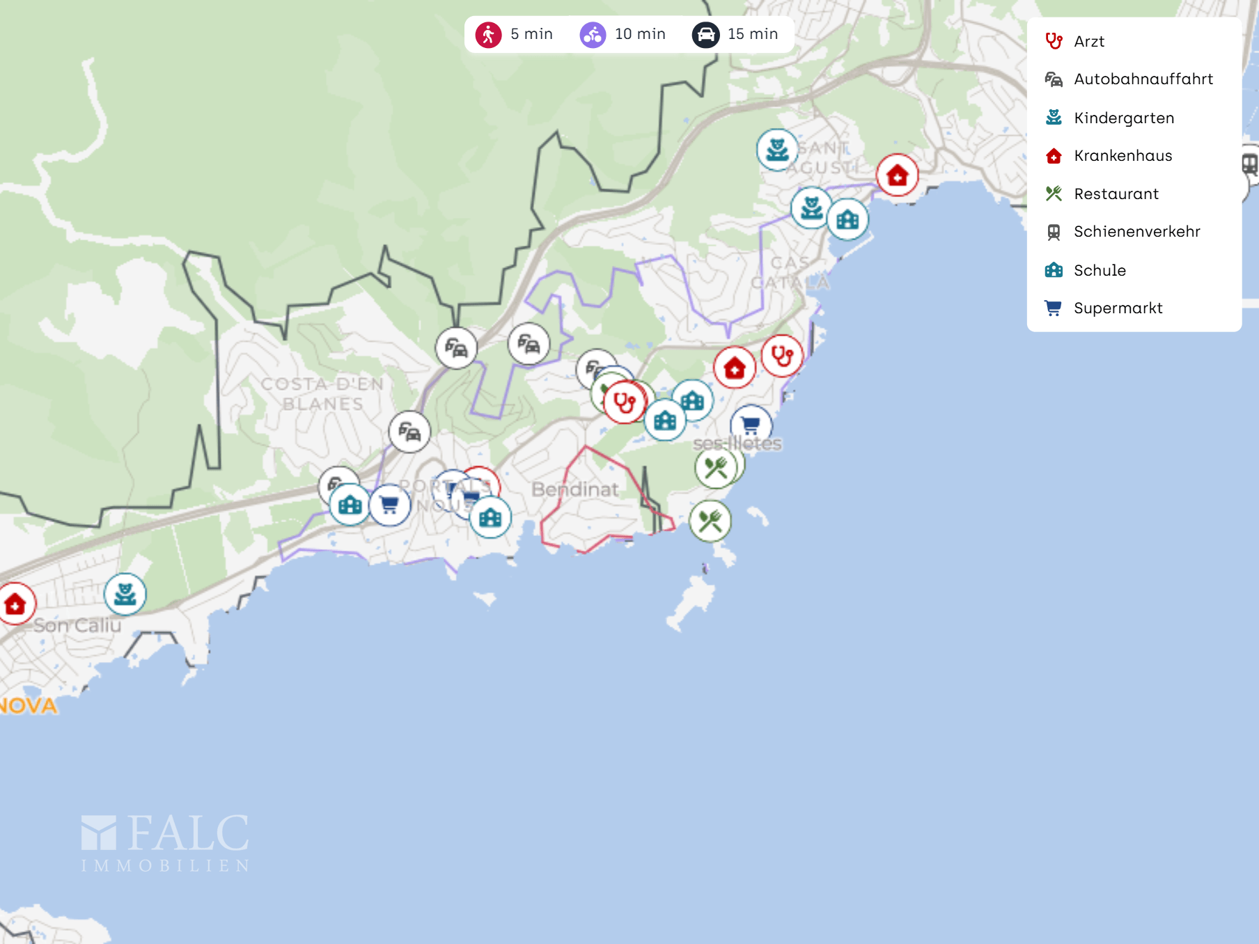 Die nächste Bushaltestelle Bendinat 1 ist ca. 600 m entfernt, eine weitere Haltestelle bei ses Illetes liegt ebenfalls in ähnlicher Distanz. Mit dem Auto ist die nächste Autobahnauffahrt in ca. 1 km erreichbar, was eine zügige Verbindung in Richtung Palma und entlang der Südwestküste ermöglicht. Der Flughafen Palma de Mallorca ist je nach Verkehr in etwa 20 bis 30 Minuten erreichbar.