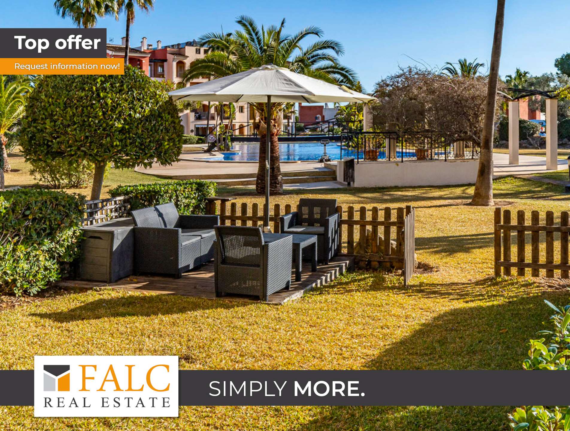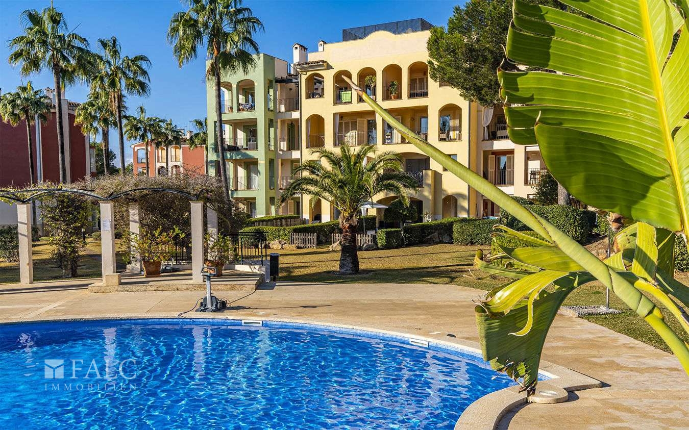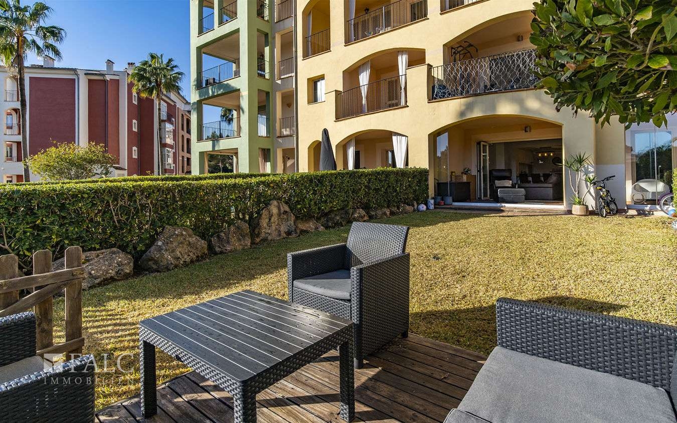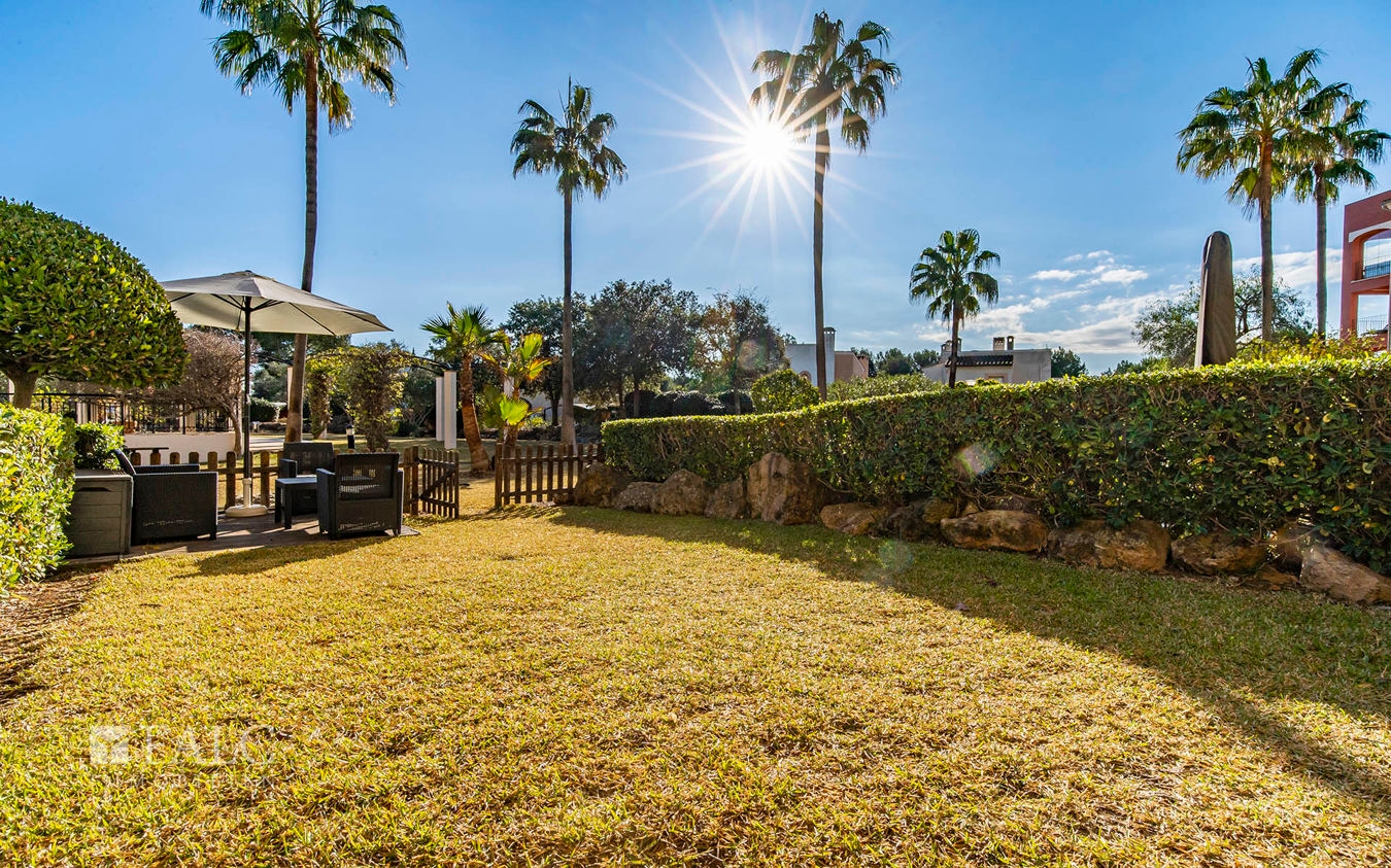 Das lichtdurchflutete Objekt verfügt über einen liebevoll gepflegten Privatgarten mit direktem Zugang zu den wunderschönen Gemeinschaftsbereichen und drei erfrischenden Pools, umgeben von mediterraner Gartenlandschaft.