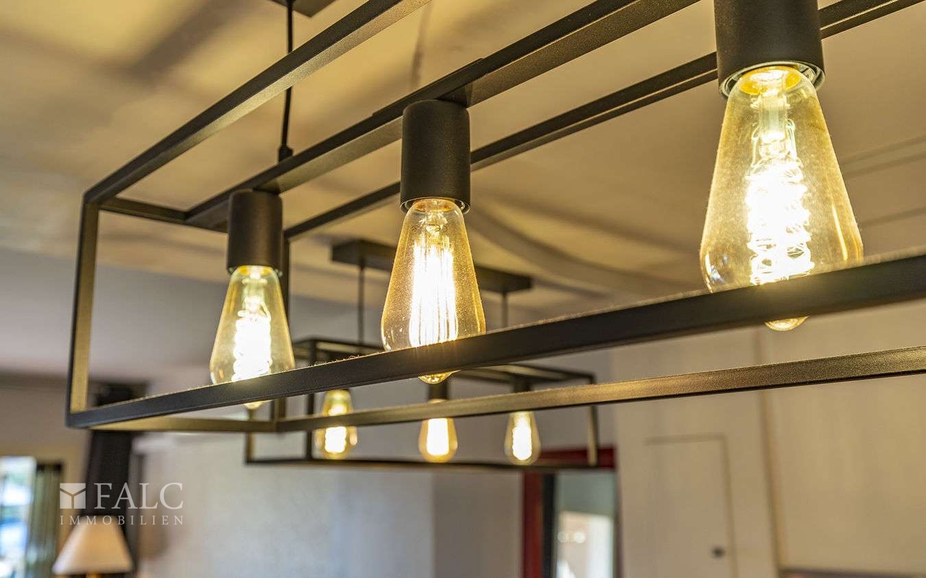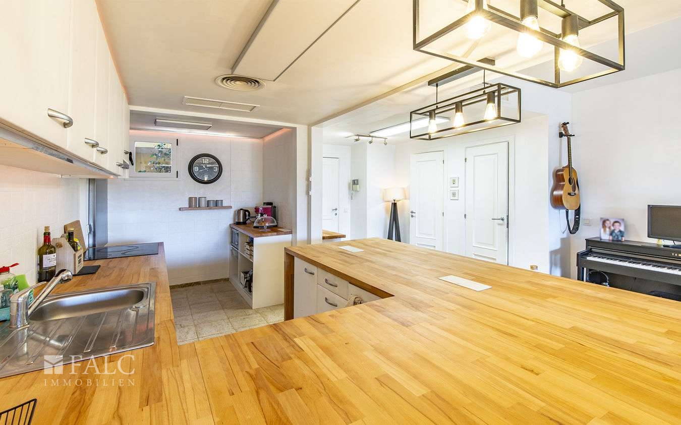 • Untergeschoss: Wunderschönes Wohn-/Esszimmer mit Panoramatüren, die auf eine verglaste Terrasse und den privaten Garten mit Blick auf den Pool führen, eine moderne, voll ausgestattete Küche sowie ein Gäste-WC.