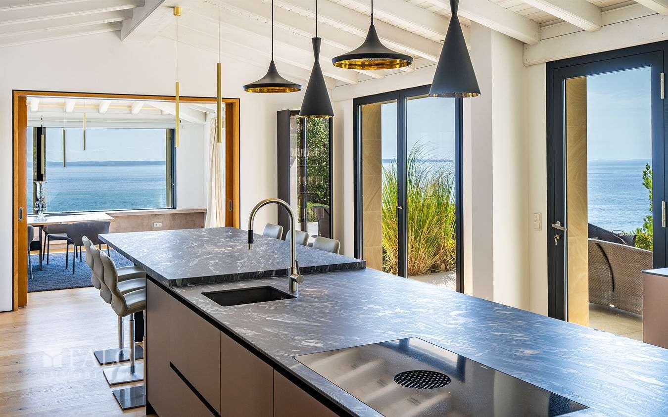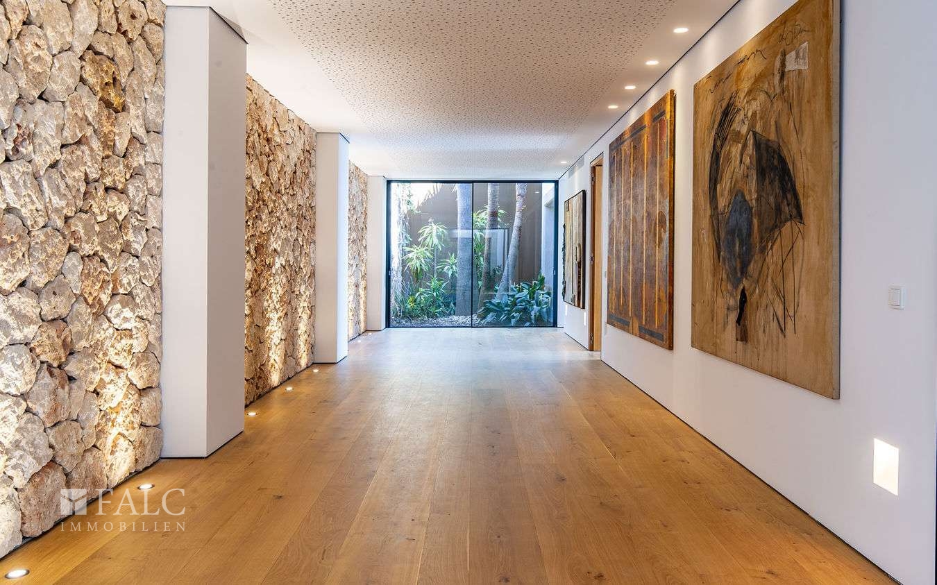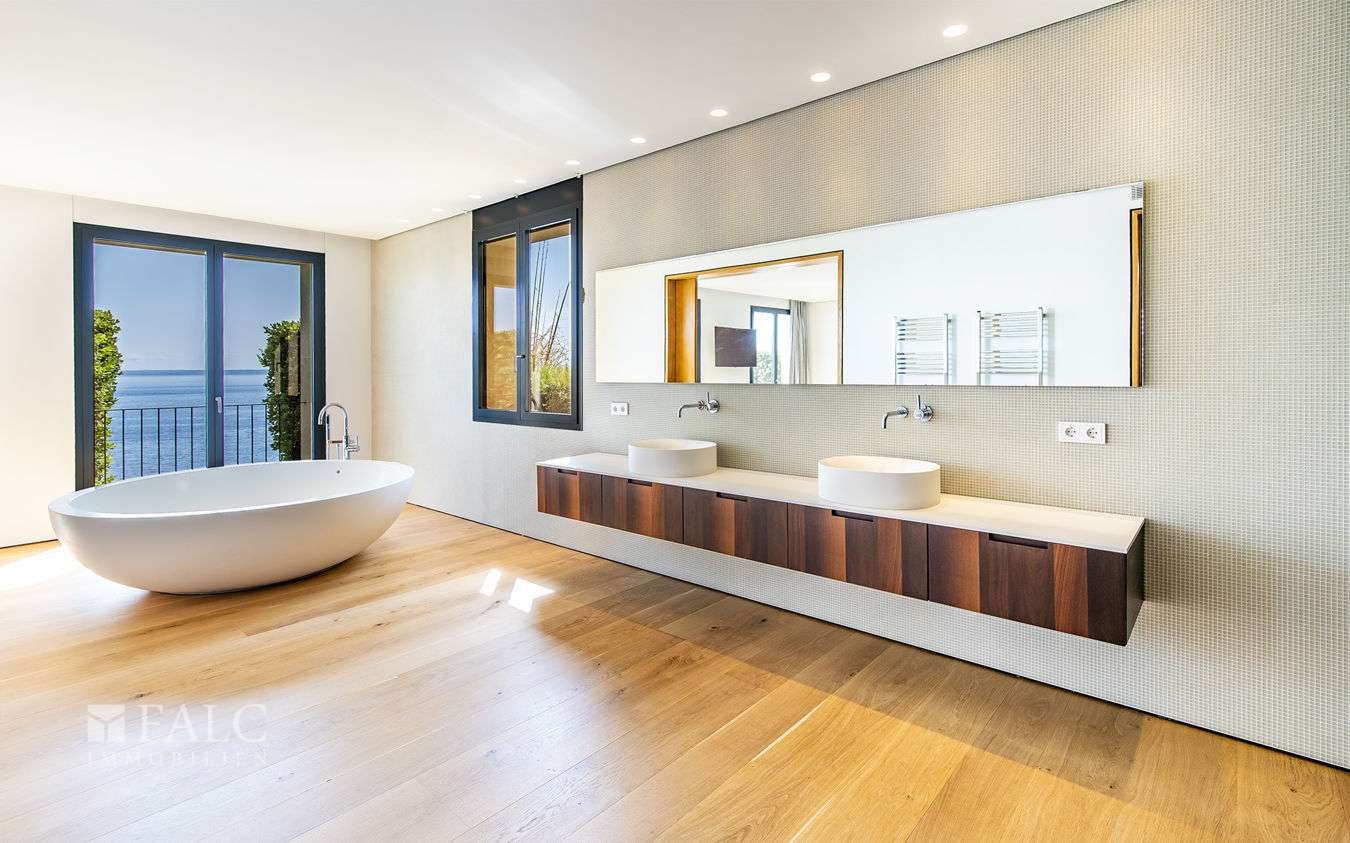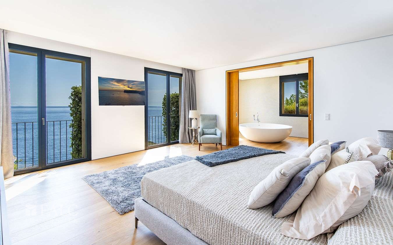 Die Räumlichkeiten verteilen sich auf 3 Etagen, die ein Aufzug bequem miteinander verbindet. Im Obergeschoss befinden sich 5 Schlafzimmer, die alle einen tollen Ausblick auf das Meer haben. Die grosse Master-Suite verfügt über 2 Ankleidezimmer und ein edles Badezimmer mit Dusche und einer Badewanne mit Meerblick. Im Erdgeschoss befinden sich ein grosser offener Wohn/Essbereich mit einem schönen Holzboden und stilechten Balkendecken. Von hieraus geniesst man ebenfalls einen wunderschönen Meerblick. Auf dieser Ebene haben Sie Zugang zur geräumigen Küche mit Designermöbeln und einer nach Süden ausgerichteten Aussenterrasse. Auf der unteren Wohnebene befinden sich eine grosse Lounge, ein weiteres Gästeapartment und ein traumhafter SPA Bereich mit Sauna, Dampfbad, Massageraum, Umkleideraum, Toilette und Dusche. Von hier hat man Zugang in den Garten, zur grossen offenen Terrasse und zum 100 m2 grossen Pool mit Wasserfall und Whirlpool. Über eine private Treppe im Garten gelangt man zum Meer. Die luxuriöse Ausstattung, edle Oberflächen und die beeindruckende Lage verspricht ein besonderes Wohnerlebnis.