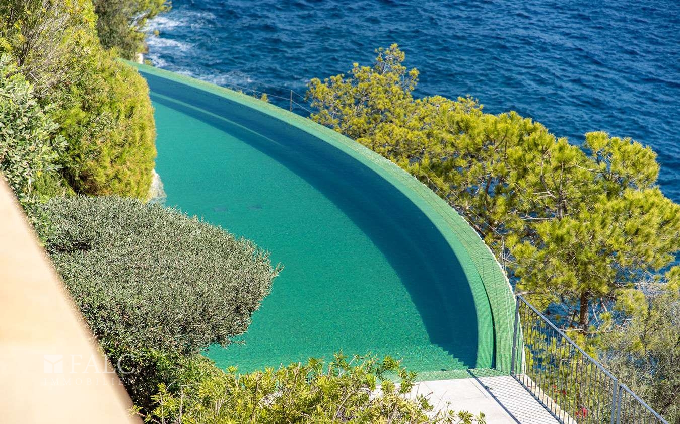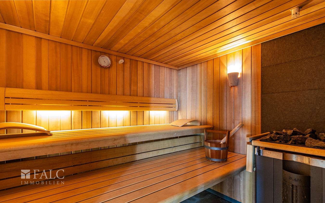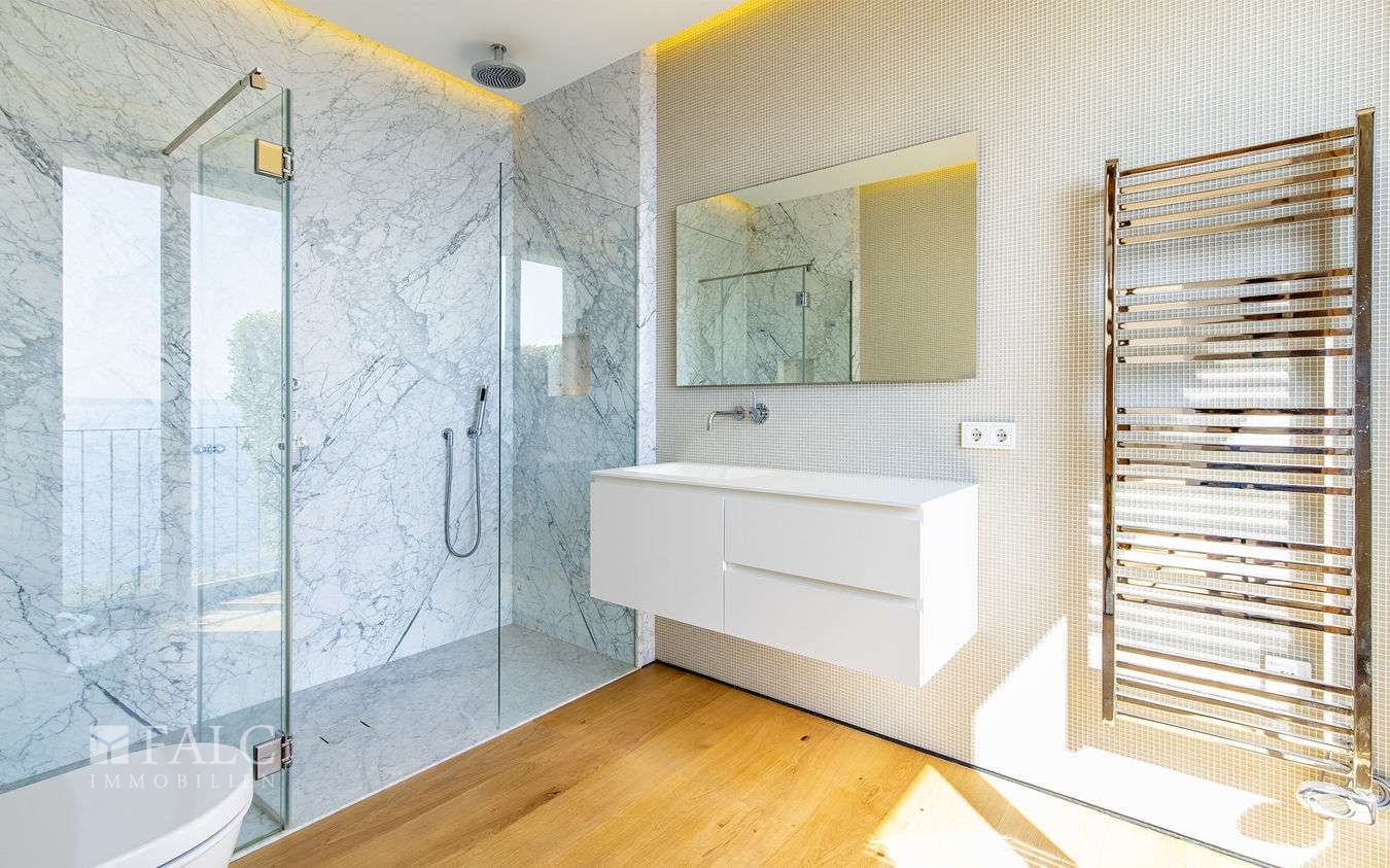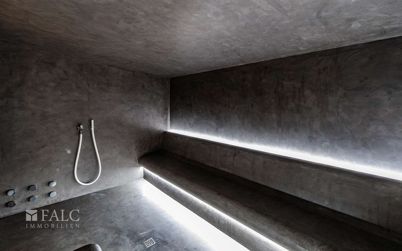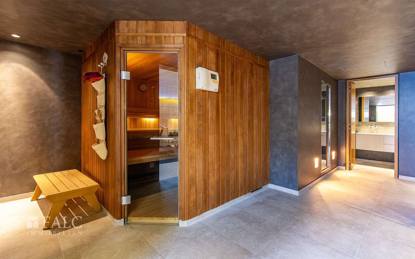 Die Räumlichkeiten verteilen sich auf 3 Etagen, die ein Aufzug bequem miteinander verbindet. Im Obergeschoss befinden sich 5 Schlafzimmer, die alle einen tollen Ausblick auf das Meer haben. Die grosse Master-Suite verfügt über 2 Ankleidezimmer und ein edles Badezimmer mit Dusche und einer Badewanne mit Meerblick. Im Erdgeschoss befinden sich ein grosser offener Wohn/Essbereich mit einem schönen Holzboden und stilechten Balkendecken. Von hieraus geniesst man ebenfalls einen wunderschönen Meerblick. Auf dieser Ebene haben Sie Zugang zur geräumigen Küche mit Designermöbeln und einer nach Süden ausgerichteten Aussenterrasse. Auf der unteren Wohnebene befinden sich eine grosse Lounge, ein weiteres Gästeapartment und ein traumhafter SPA Bereich mit Sauna, Dampfbad, Massageraum, Umkleideraum, Toilette und Dusche. Von hier hat man Zugang in den Garten, zur grossen offenen Terrasse und zum 100 m2 grossen Pool mit Wasserfall und Whirlpool. Über eine private Treppe im Garten gelangt man zum Meer. Die luxuriöse Ausstattung, edle Oberflächen und die beeindruckende Lage verspricht ein besonderes Wohnerlebnis.