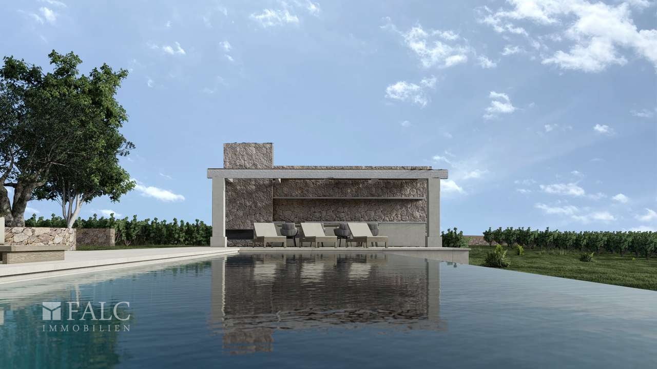Nur wenige Minuten von einer der charmanstesten Städte Mallorcas entfernt, presentieren wir diese traumhafte Neubau-Finca in Santanyi. Der Bau dieser wunderschönen Finca im traditionellen mediterranen Stil hat bereits begonnen und die Fertigstellung ist für Ende 2025 geplant. Das ca. 18.000 m2 grosse Grundstück bietet einen zeitlosen Rückzugsort mit herrlichen mediterranen Gärten und einem ca. 35 m grossen Salzwasserpool mit gemütlichen Liegeflächen und einem tollen BBQ-Bereich. Die grosszügige bebaute Fläche von ca. 250 m2 verteilt sich auf ein luxuriöses Haupthaus und ein einladendes ca. 20 m2 grosses Gästehaus. Das elegante, 2-etagige Haupthaus plus Kellerbereich bietet im Erdgeschoss einen grosszügig gestalteten Eingangsbereich, einen fantastischen Wohn- und Essbereich mit Kamin und Zugang zur teilüberdachten Terrasse und dem wunderschönen mediterranen Garten, eine offen gestaltete Küche mit hochwertiger Ausstattung, ein Schlafzimmer, Badezimmer und den Hauswirtschaftsraum. Im lichtdurchfluteten Obergeschoss befindet sich ein Schlafzimmer mit Badezimmer, sowie das geräumige Hauptschlafzimmer mit Ankleide- und Badezimmer en suite. Beide Schlafzimmer verfügen über eine beeindruckende Terrasse mit atemberaubendem Blick über das Anwesen und die wunderschöne Landschaft. Extras: Wärmepumpe mit zentraler Fussbodenheizung, aerothermischen Klimatisierungssystems, Anschluss an öffentliche Strom- und Wasserversorgung, Fotovoltaikanlage, 20.000-Liter-Regenwasser-Reservoir, 12.000-Liter-Trinkwassertank, Parkplätze, Sonos-Soundsystem, automatische Bewässerungsanlage und vieles mehr.