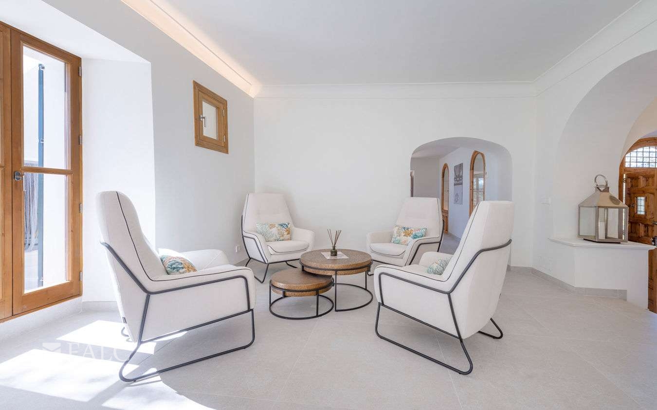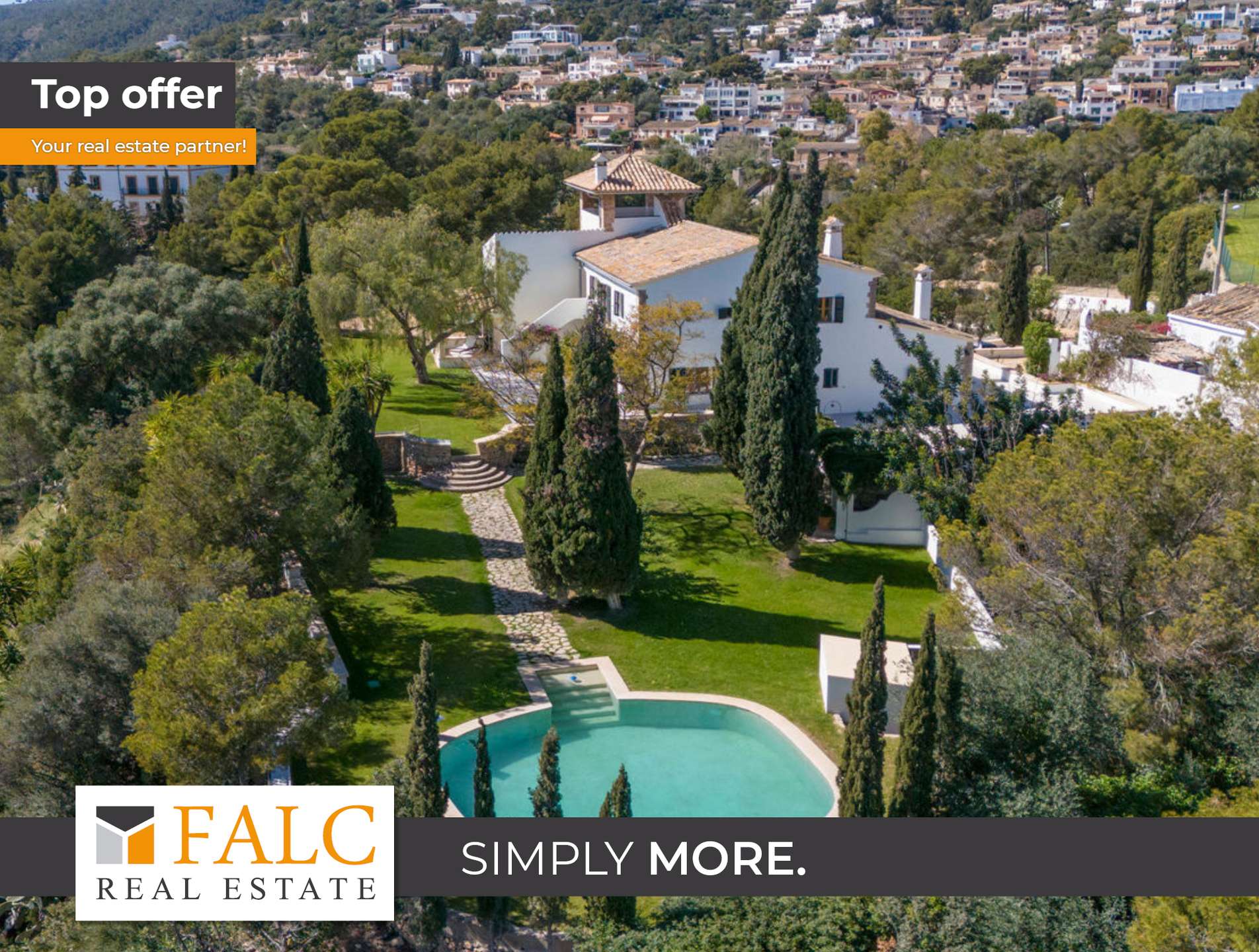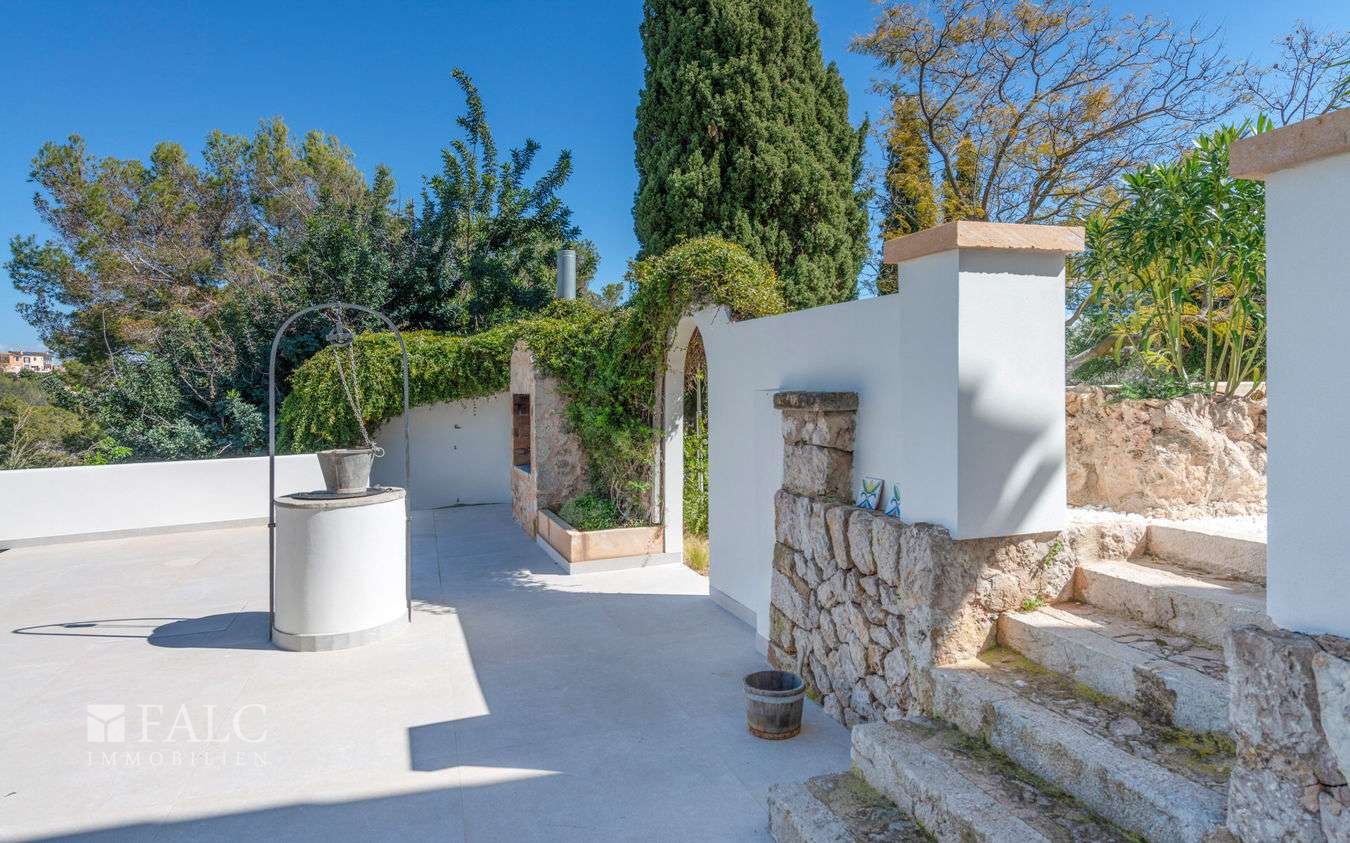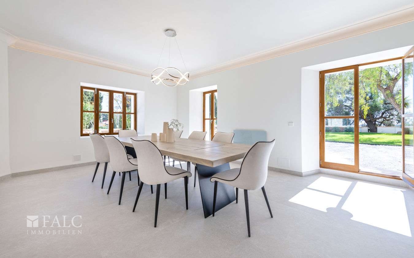 Dieses fantastische Herrenhaus in Genova wurde ursprünglich im Jahre 1900 für König Alonso XIII gebaut. Umgeben von ausgedehnten Grünflächen, Gärten und Terrassen bietet sich hier die exklusive Gelegenheit, ein aussergewöhnliches und vollständig renoviertes Anwesen in einer Wohngegend zu erwerben, von der aus man jeden Teil der Insel leicht erreichen kann. Die authentische Immobilie liegt auf einem ca. 10.000 m2 grossen Grundstück mit unendlichem Möglichkeiten und hoher Privatsphäre. Die ca. 629 m2 bebeaute Fläche verteilen sie ch auf 3 Etagen wie folgt: Das helle Erdgeschoss umfasst die Eingangshalle, mit Zugang zu den Wohnbereichen: das lichtdurchflutete Wohn-/Esszimmer, die Küche mit Frühstücksinsel, Weinkühlschrank und Leicht-Geräten, Gästetoiletten, Schlafzimmer mit eigenem Bad und Zugang zur gefliesten Terrasse, die auf den Garten mit Meerblick führt und sich hervorragend für gesellige Stunden im Freien eignet. Im Untergeschoss befindet sich der Keller mit Weinkeller, Speisekammer/Lagerraum, einem Gäste-/Personalzimmer mit eigenem Bad, dem Technikraum des Hauses und der Doppelgarage. Der 1. Stock besticht durch 3 weitere Schlafzimmer mit eigenem Bad und eine Master-Suite im 1. Hauptschlafzimmer mit schöner Holzbalkendecke und doppeltem Bad en-suite. Vom 1. Stock aus führt die Treppe zur fantastischen Turmterrasse mit einem 360-Grad-Blick auf das Anwesen und das Meer. Sie eignet sich perfekt für Nachmittagstee oder als Yoga-Plattform. Der Aussenbereich wird durch gepflegte Gartenbereiche, einen runden Swimmingpool, Garage und einen Steinofen ergänzt.
